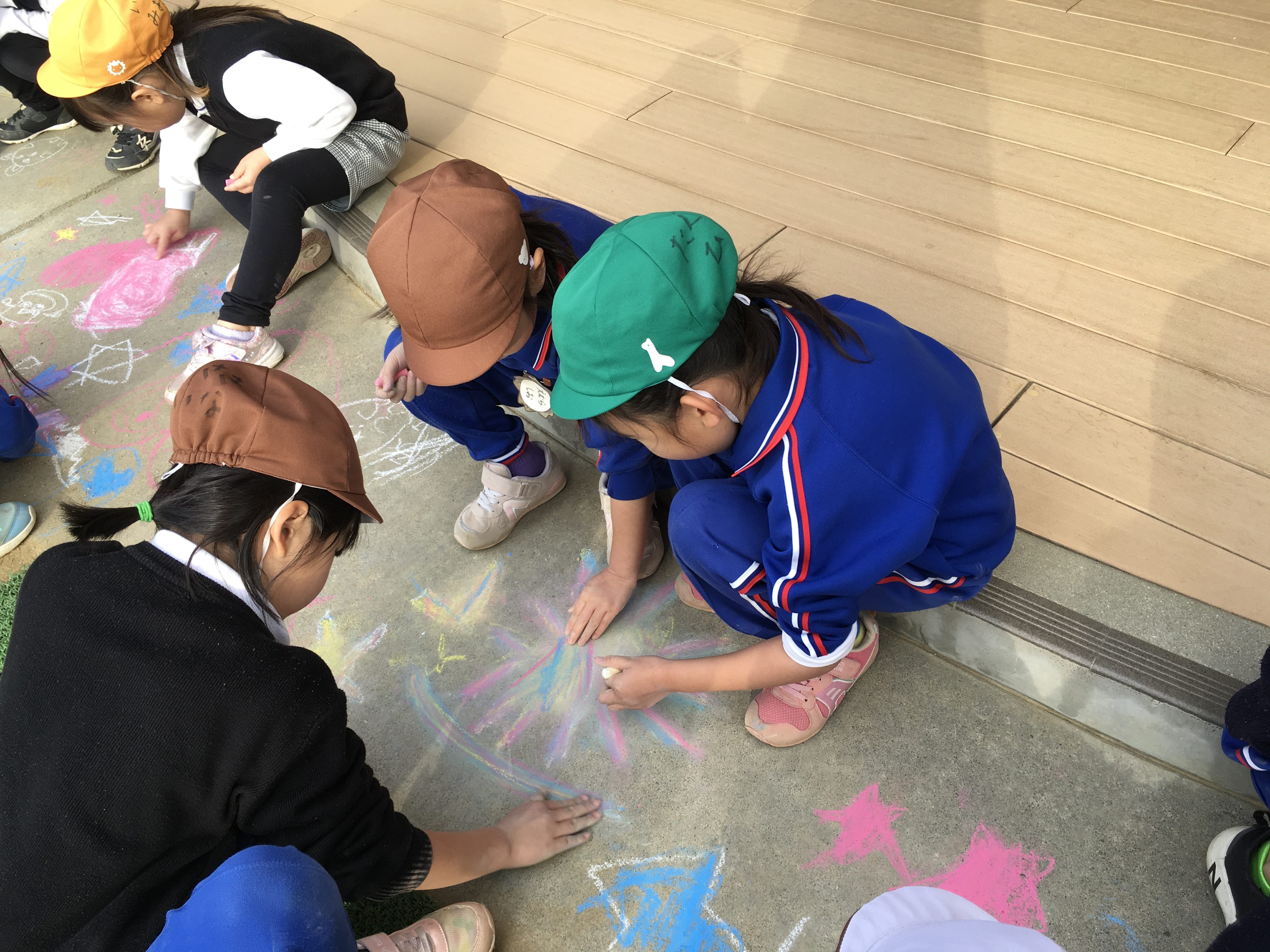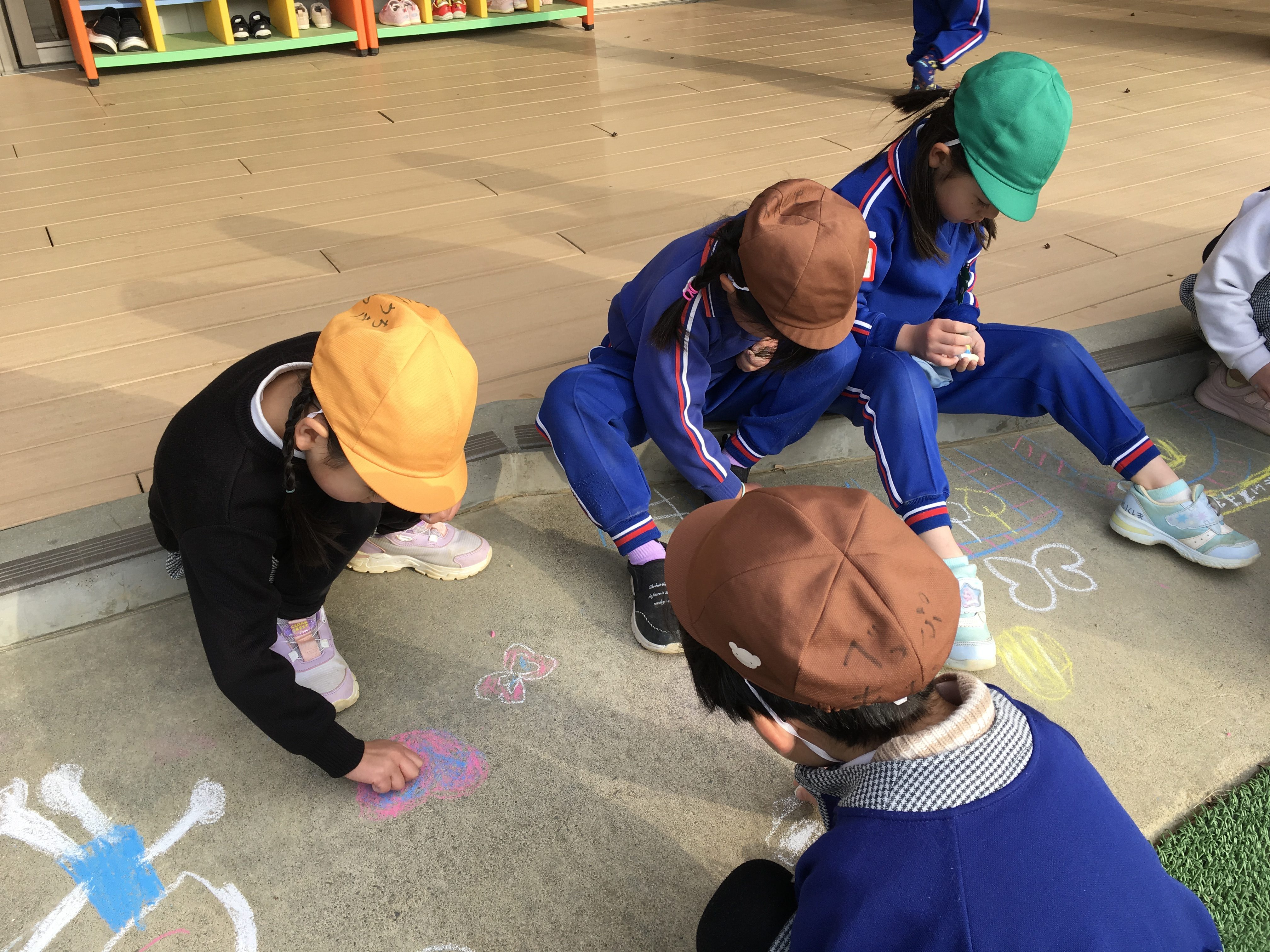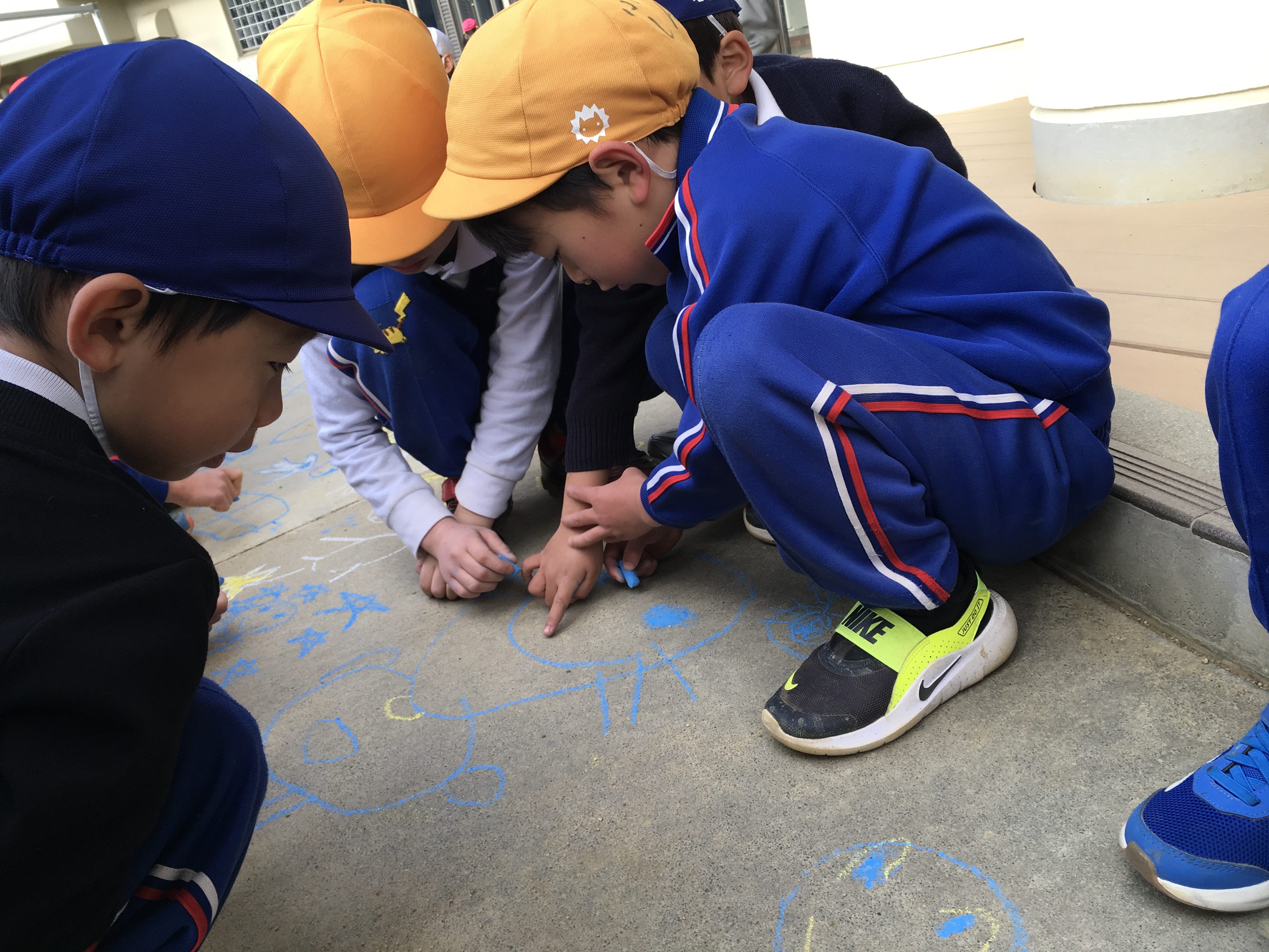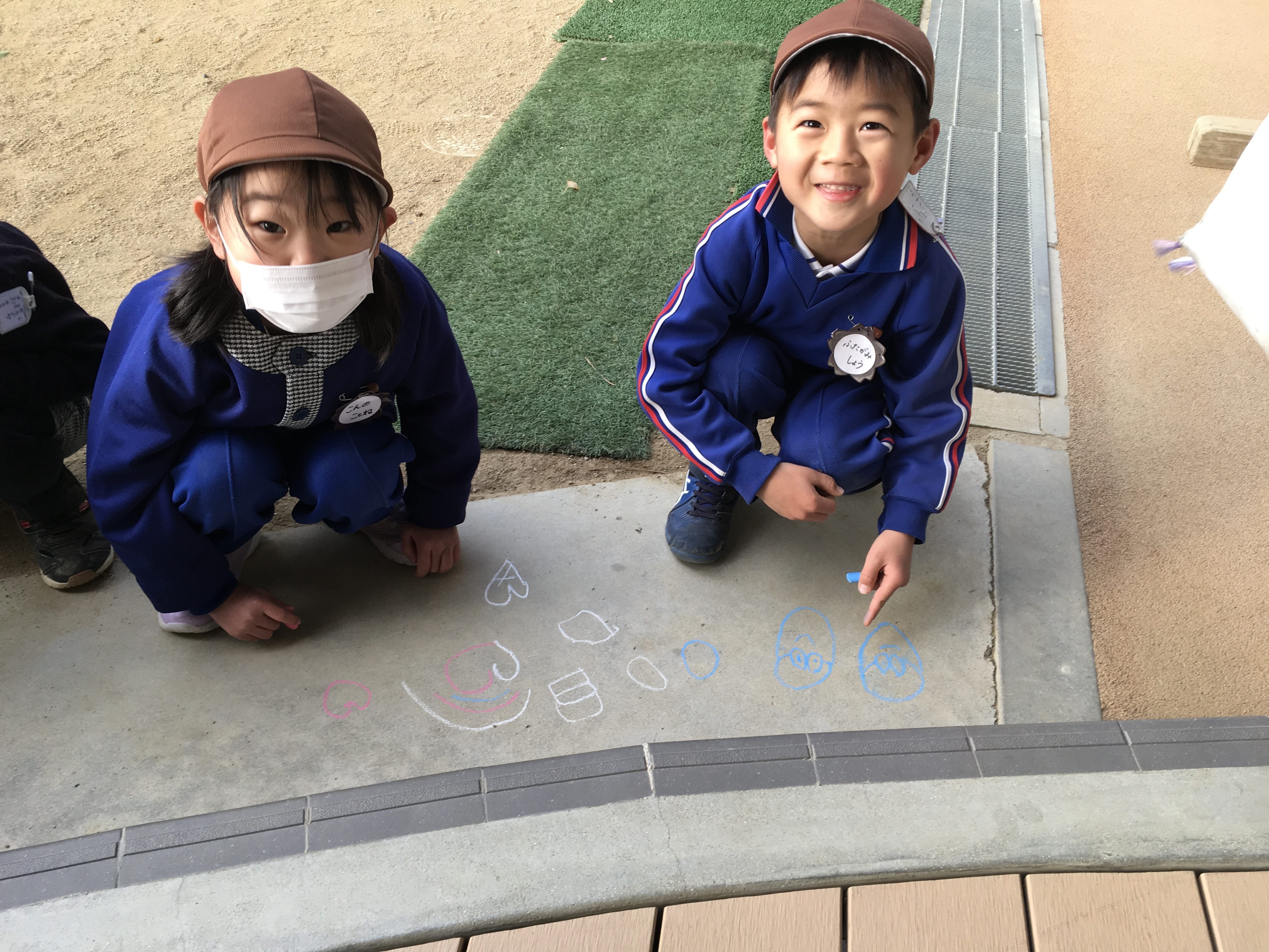今朝も少し雲っていて外は肌寒く感じられましたが、園庭では子ども達の元気な声が、響いていました。先日、古森先生が「ここに絵を描いたら楽しいんじゃない?」と言って始まった、園庭のテラス前コンクリート面のお絵描きですが、今日も年長児が集まって描いていました。「先生見て!ドラえもん描いた!!」と、教師が声を掛ける前に子ども達から何を描いたのか教えてくれました。白、黄、赤、青の4色のチョークを上手に使い分けて描いていた、SちゃんとHちゃんは以前、チョークでお絵描きをした時に、絵をこすると色が混ざることに気付いていました。今日も絵を描くとこすり合わせて、混ざった色を見た後、白が多いと他の色を少しづつ混ぜながら気に入った色になるように調節していました。その様子を見ていたMちゃんも、赤と白を混ぜて、ピンクのハートを描いていました。