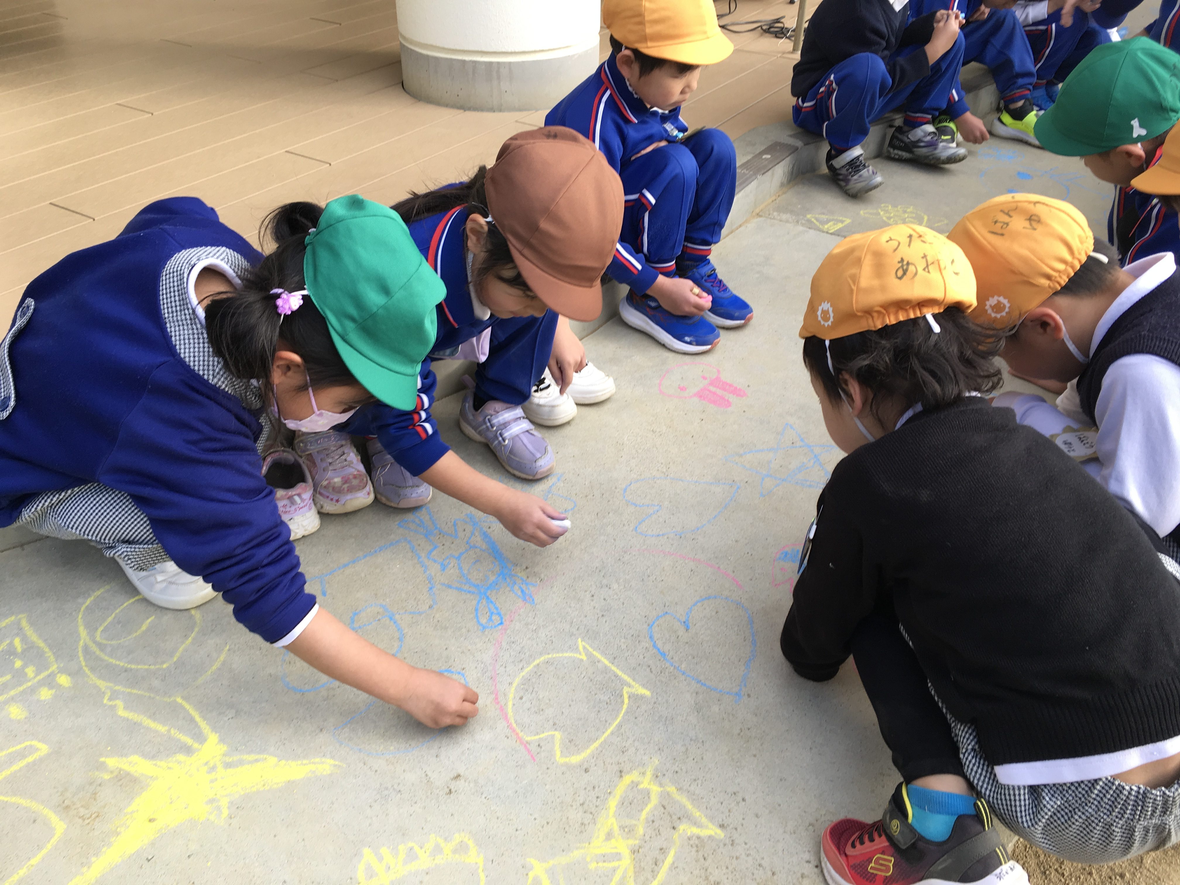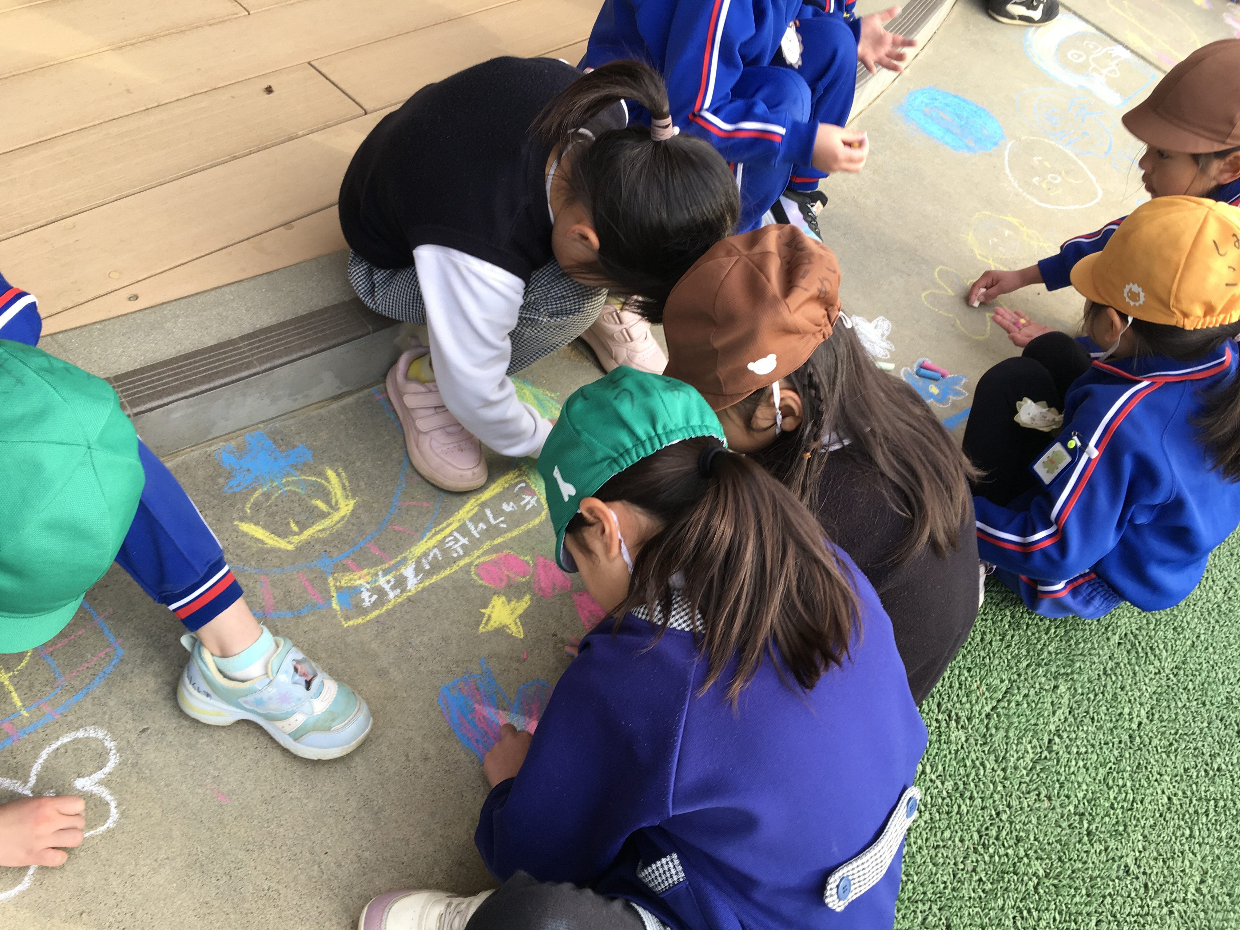 バスで登園してきた子も「何してるの?」と、お絵描きに加わり、気付くと沢山の子ども達が、チョークを握りしめてお絵描きを楽しんでいました。「〇〇描いた!!」と友達同士で嬉しそうに話しているのを見て、とっても楽しい様子が伝わってきました。時間になると「また続きする!」と次のお絵描きタイムを楽しみにしている子もいました。