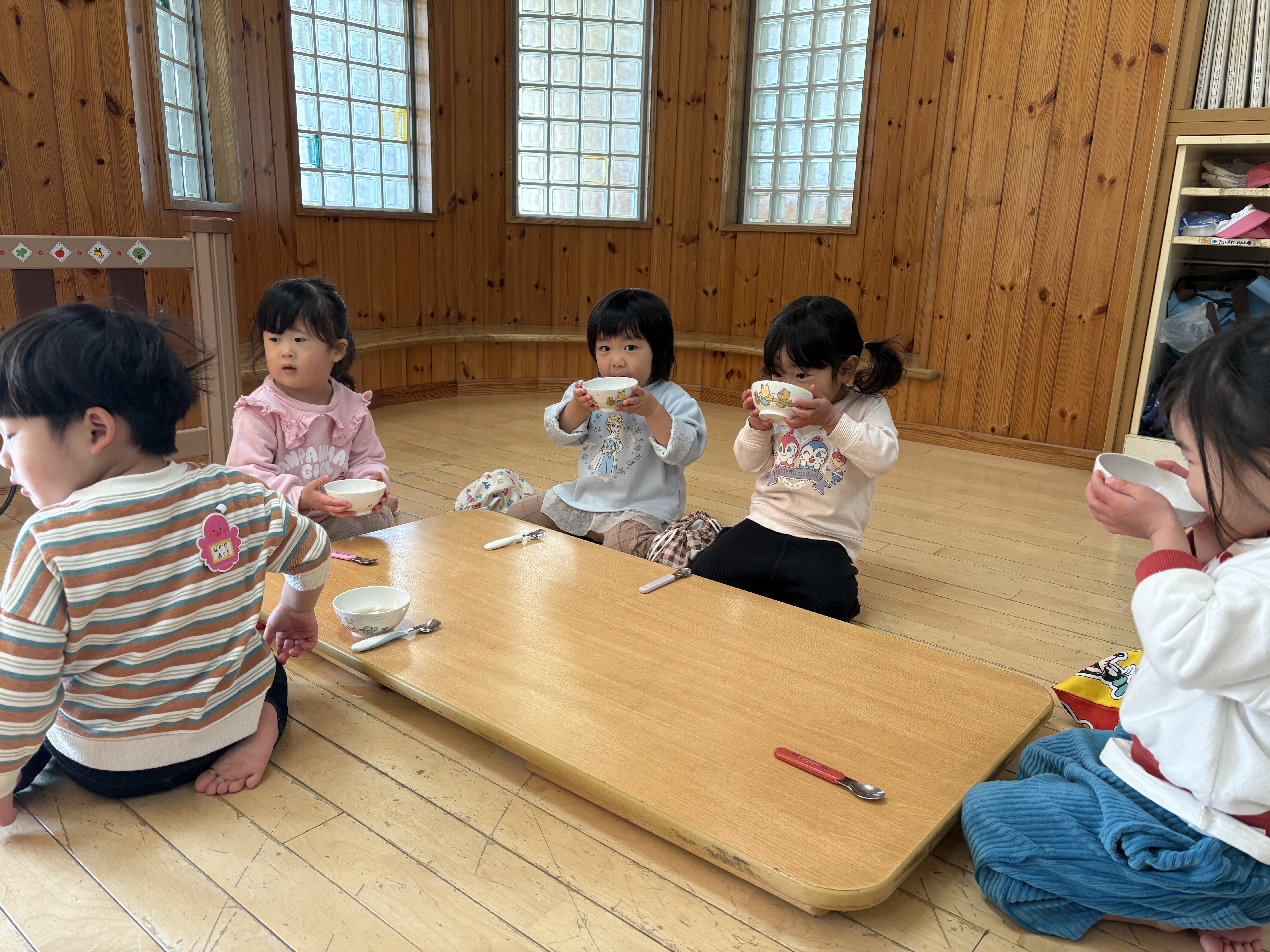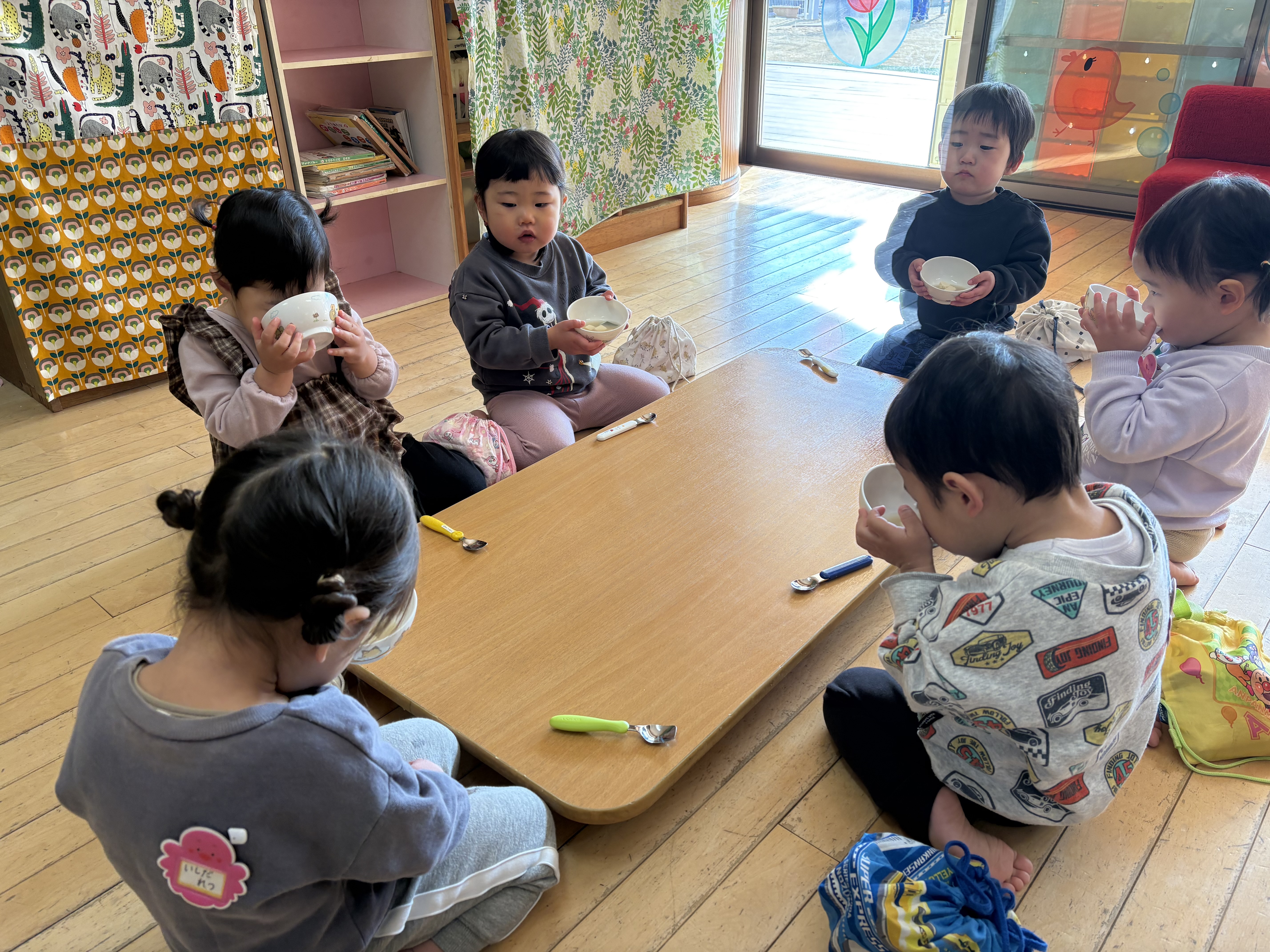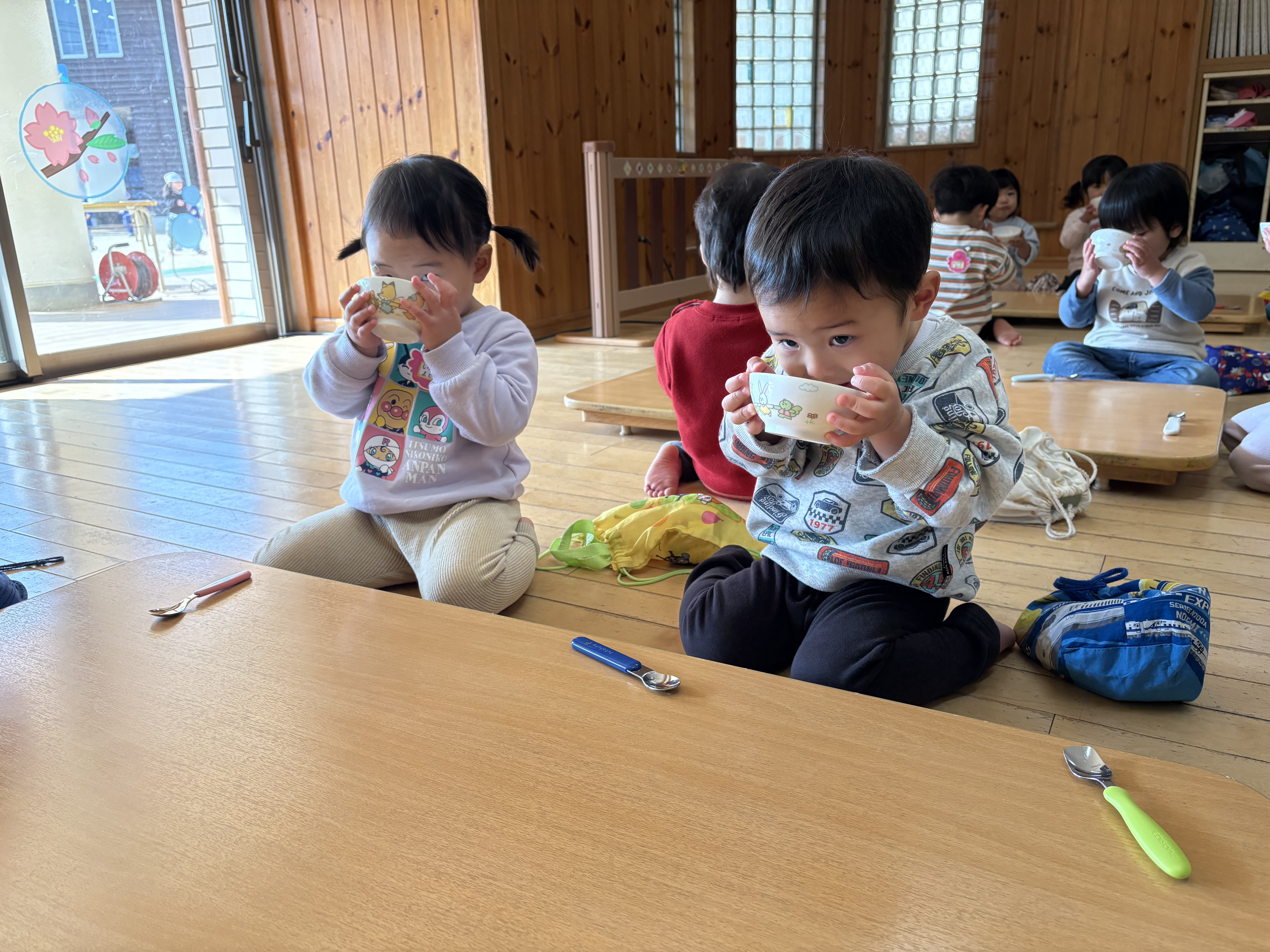 保育園れもん組の子どもたちは2歳児、4月から満3歳児で幼稚園児になります。風邪予防対策から始まったお味噌汁大作戦は子どもたちに大人気で「今日もお味噌汁があるよ」と声をかけると「お味噌汁!!」「ヤッター!!」と喜んでいました。1月お味噌汁大作戦が始まった頃はスプーンを持ってお汁をすくいながら飲んでいましたが、最近は「いただきます」をした後、両手でお椀を持って口に当てて飲むようになりました。お味噌汁の具材も日によって違います。具材を見て「これなに?」「これワカメ」「これおとうふ」と言いながら食材に興味を持っている子もいます。