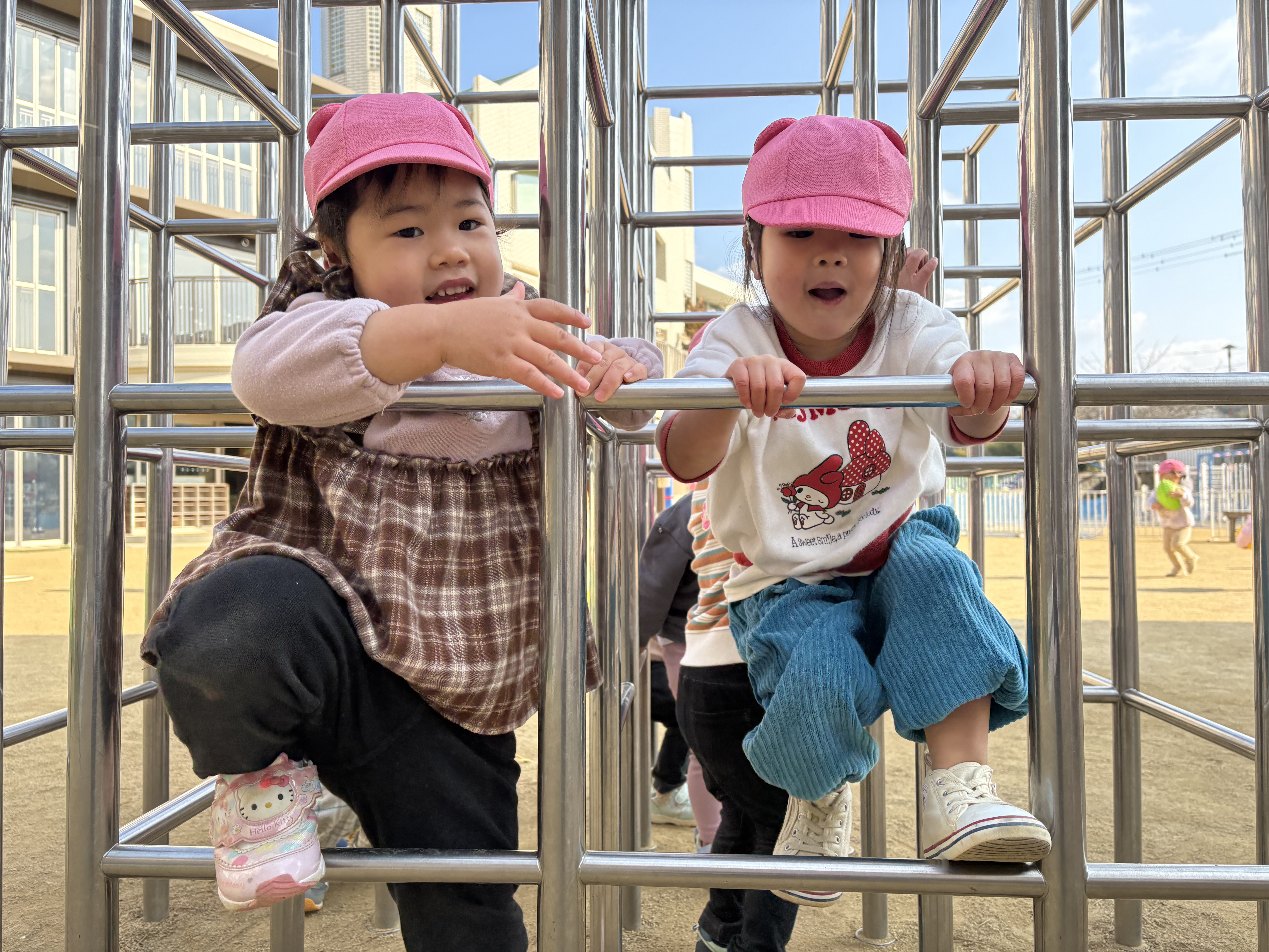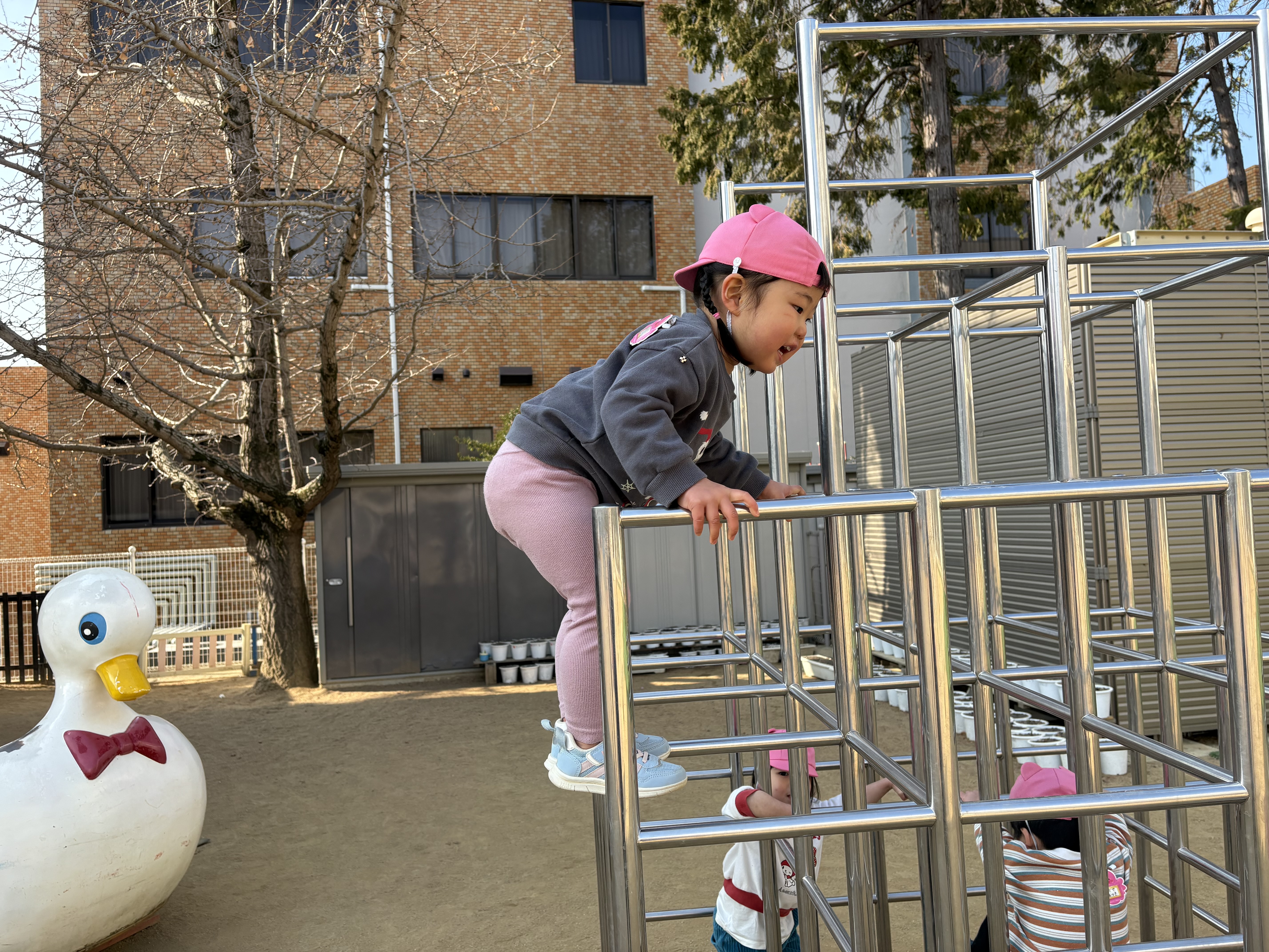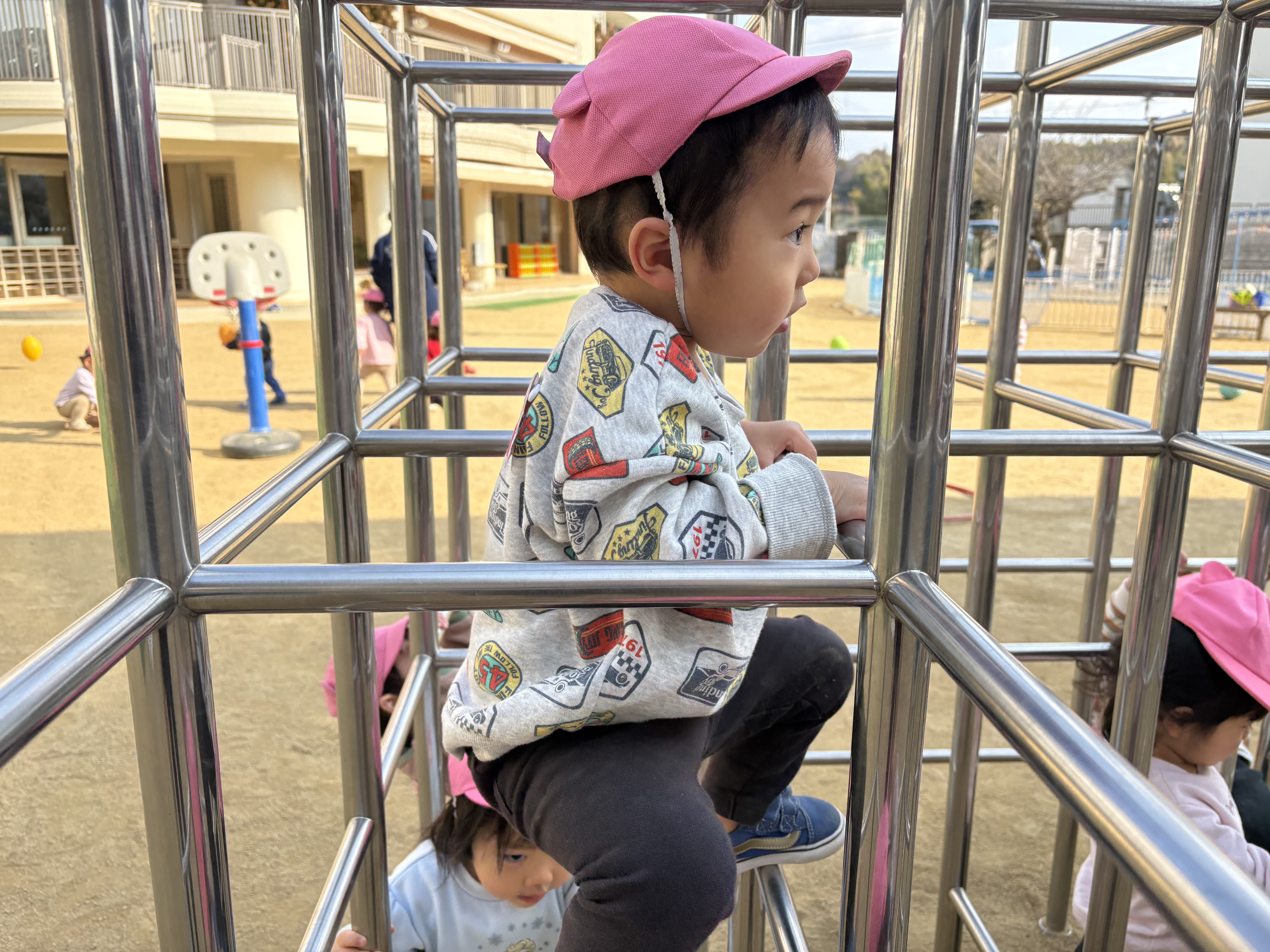 お味噌汁パワーをもらった子どもたちは戸外に出ると元気いっぱい体を動かして遊びます。戸外にはいろんな遊具が出ているのですがこの日はまず目に付いたジャングルジムに向かって行きました。子どもたちの目は輝き1段1段登っていきます。しかし保育教諭はスラスラ登っていく子どもたちに落ちないかと心配しながら登っていく様子を見守りました。そんな心配をしている保育教諭を知り目に頂上まで登りきり、「せんせ〜いオーイ」「こっちだよ」と呼びかける子もいました。頂上に登っている子どもたちに「怖くないの?」と尋ねると「怖くないよ」と自信満々に答えていました。