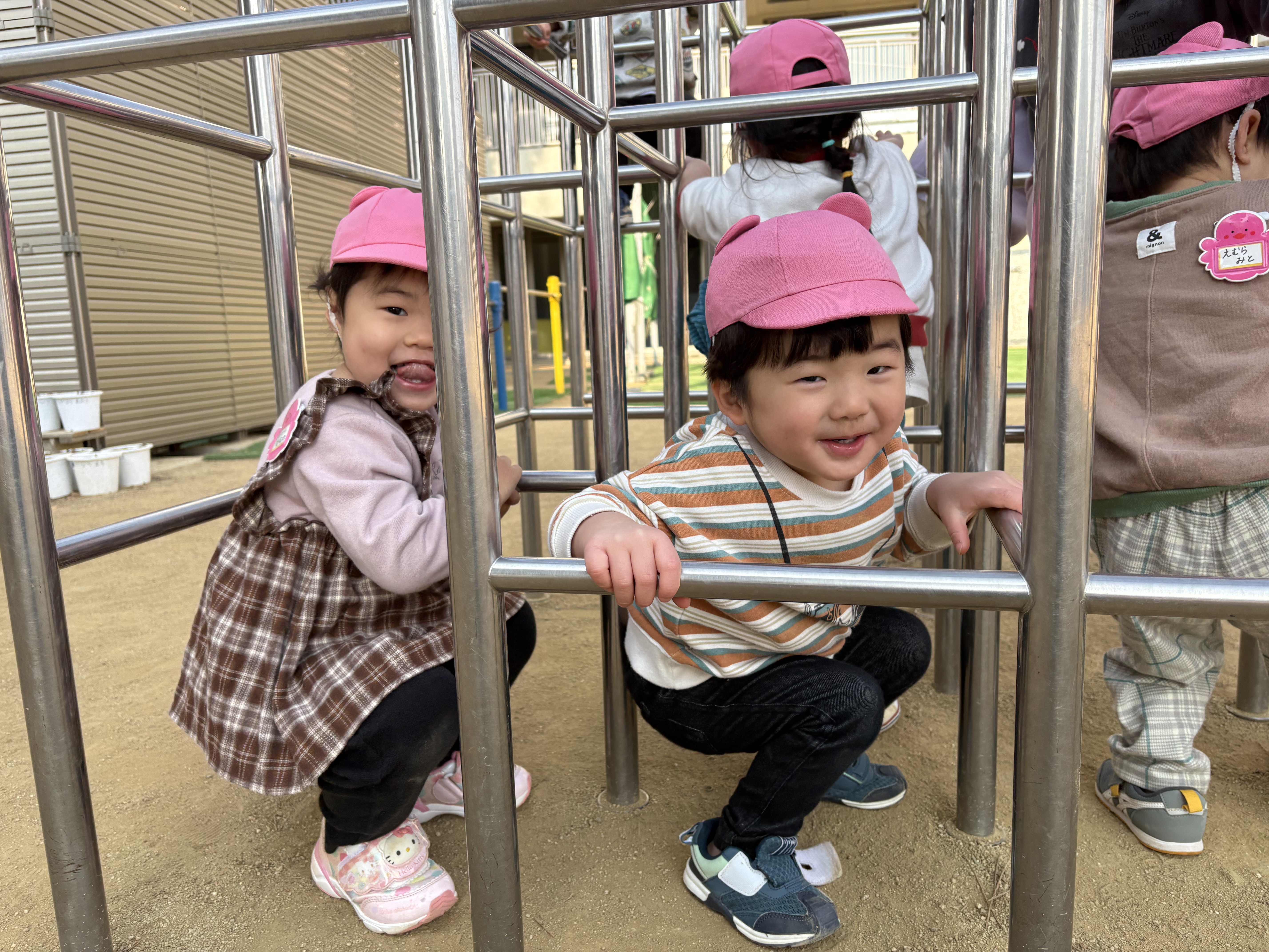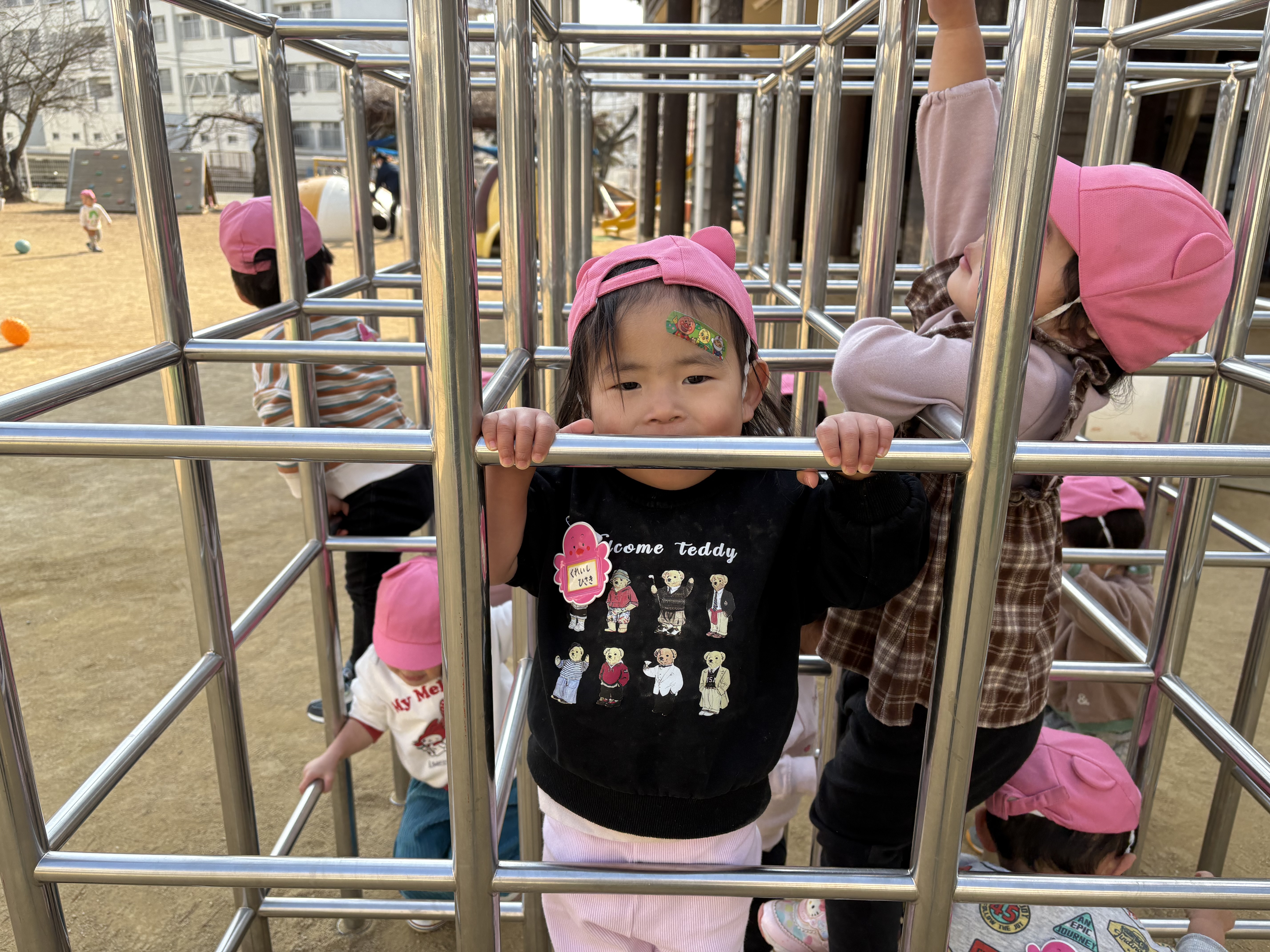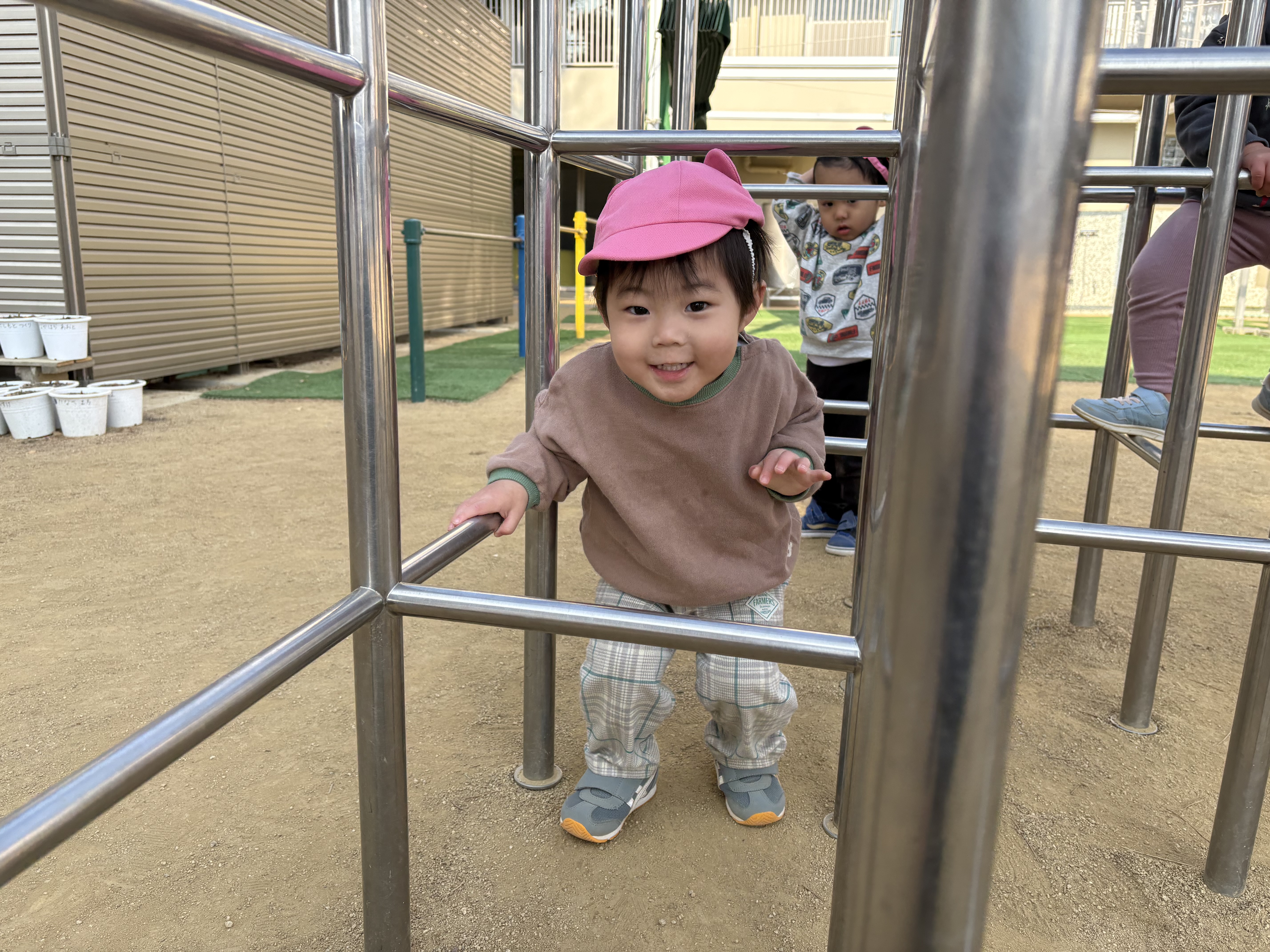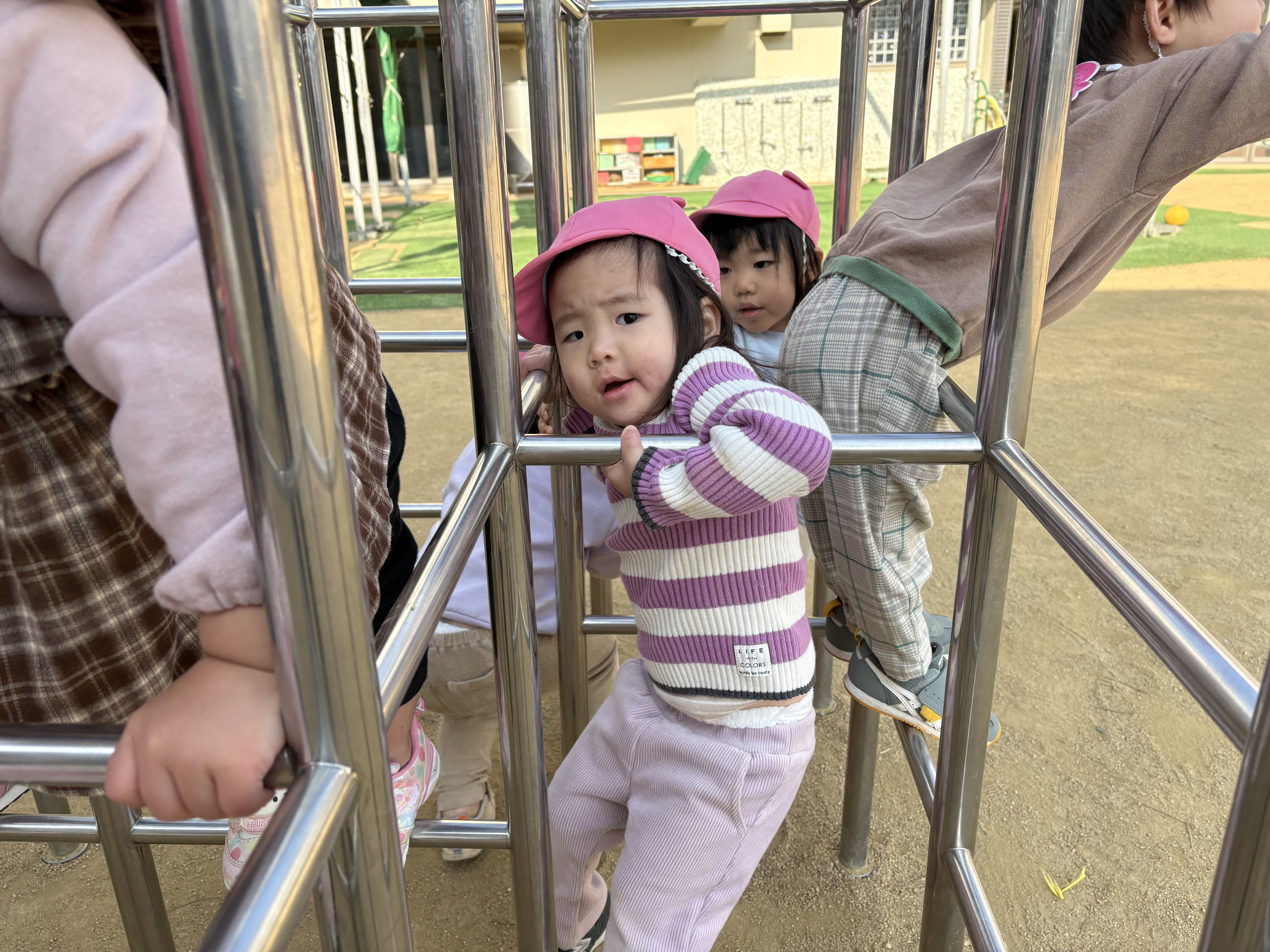 お味噌汁パワーをもらった子どもたちは戸外に出ると元気いっぱい体を動かして遊びます。戸外にはいろんな遊具が出ているのですがこの日はまず目に付いたジャングルジムに向かって行きました。子どもたちの目は輝き1段1段登っていきます。しかし保育教諭はスラスラ登っていく子どもたちに落ちないかと心配しながら登っていく様子を見守りました。そんな心配をしている保育教諭を知り目に頂上まで登りきり、「せんせ〜いオーイ」「こっちだよ」と呼びかける子もいました。頂上に登っている子どもたちに「怖くないの?」と尋ねると「怖くないよ」と自信満々に答えていました。