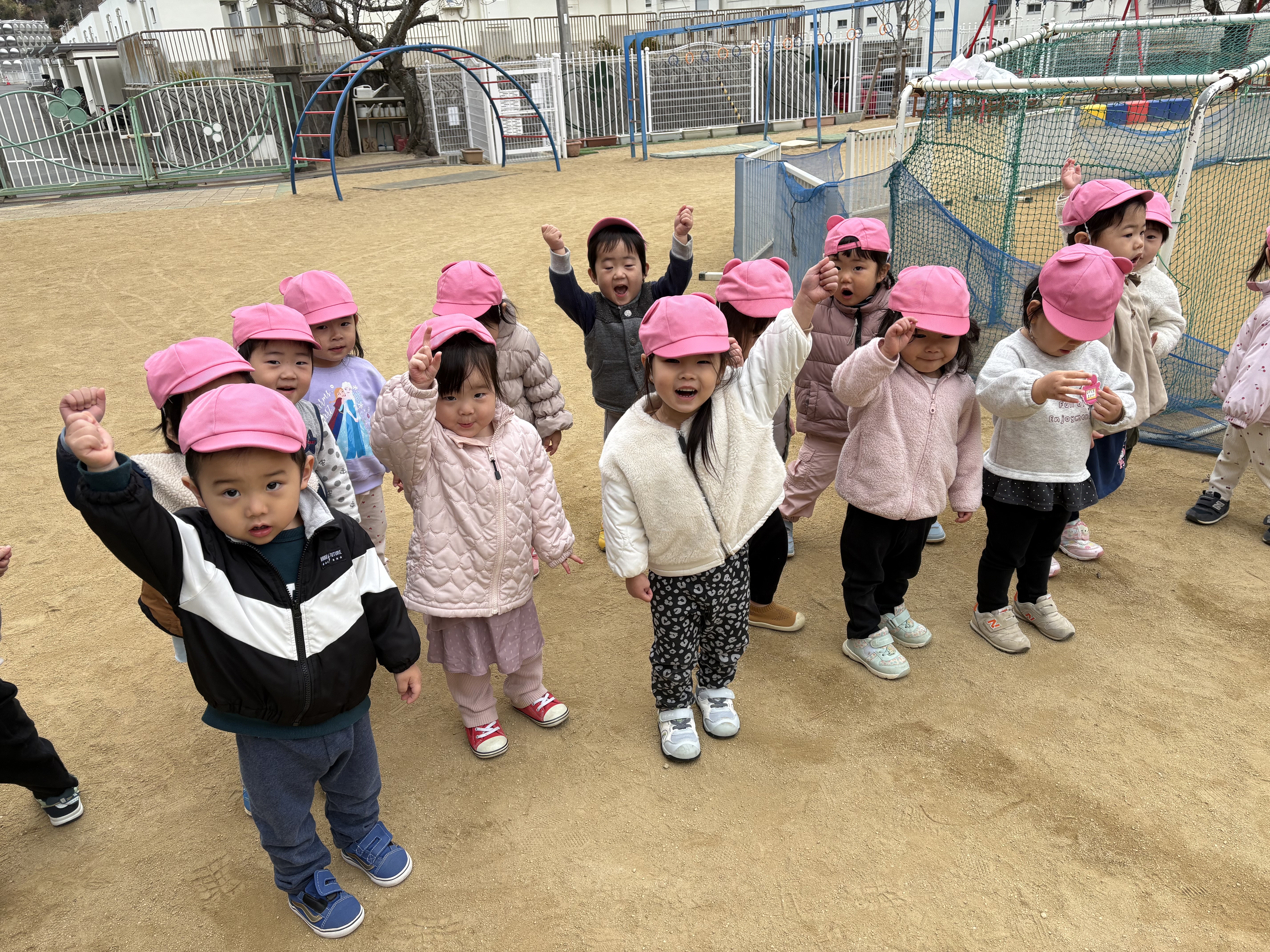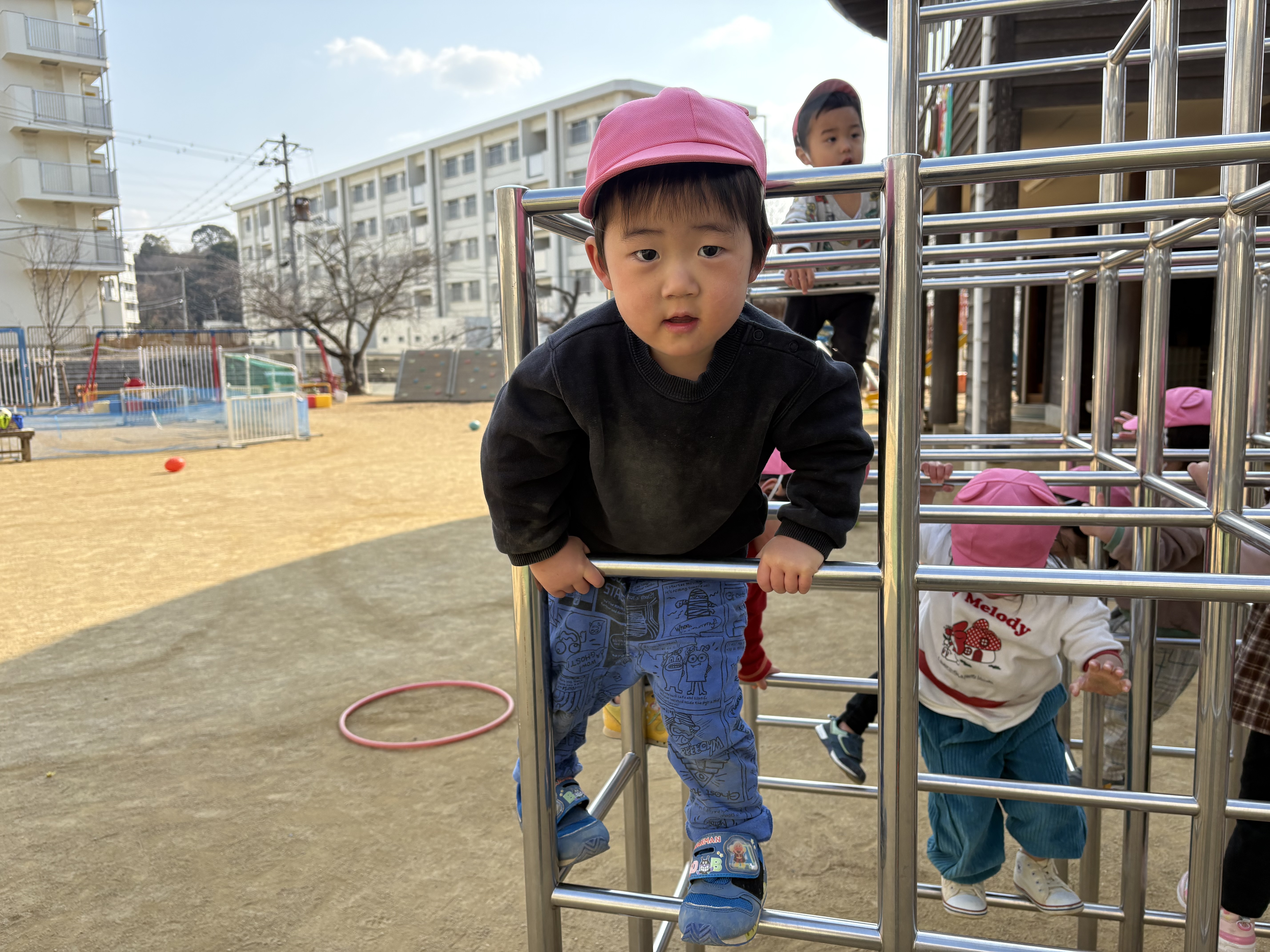 これからも走る・登る・ぶら下がるなどの運動機能を向上させながら全身を動かす楽しさをもっともっと経験できたらいいなと思いました。教師たちはついついいつまでも1〜2歳児で赤ちゃんという気持ちで付き合ってしまっていますが、れもん組さんは4月から幼稚園になることを意識していかなければなりません。保育園児から幼稚園児への橋渡しの時期になります。もうすぐ幼稚園のお兄ちゃん・お姉ちゃんとしての意識付けと準備に入ります。パンツ・シャツは自分で脱ぎ着する、トイレは自分で、できればオムツも取れるのが理想ですが…。たんぽぽ組さんでもその部分では橋渡しの時期ですので安心してください。