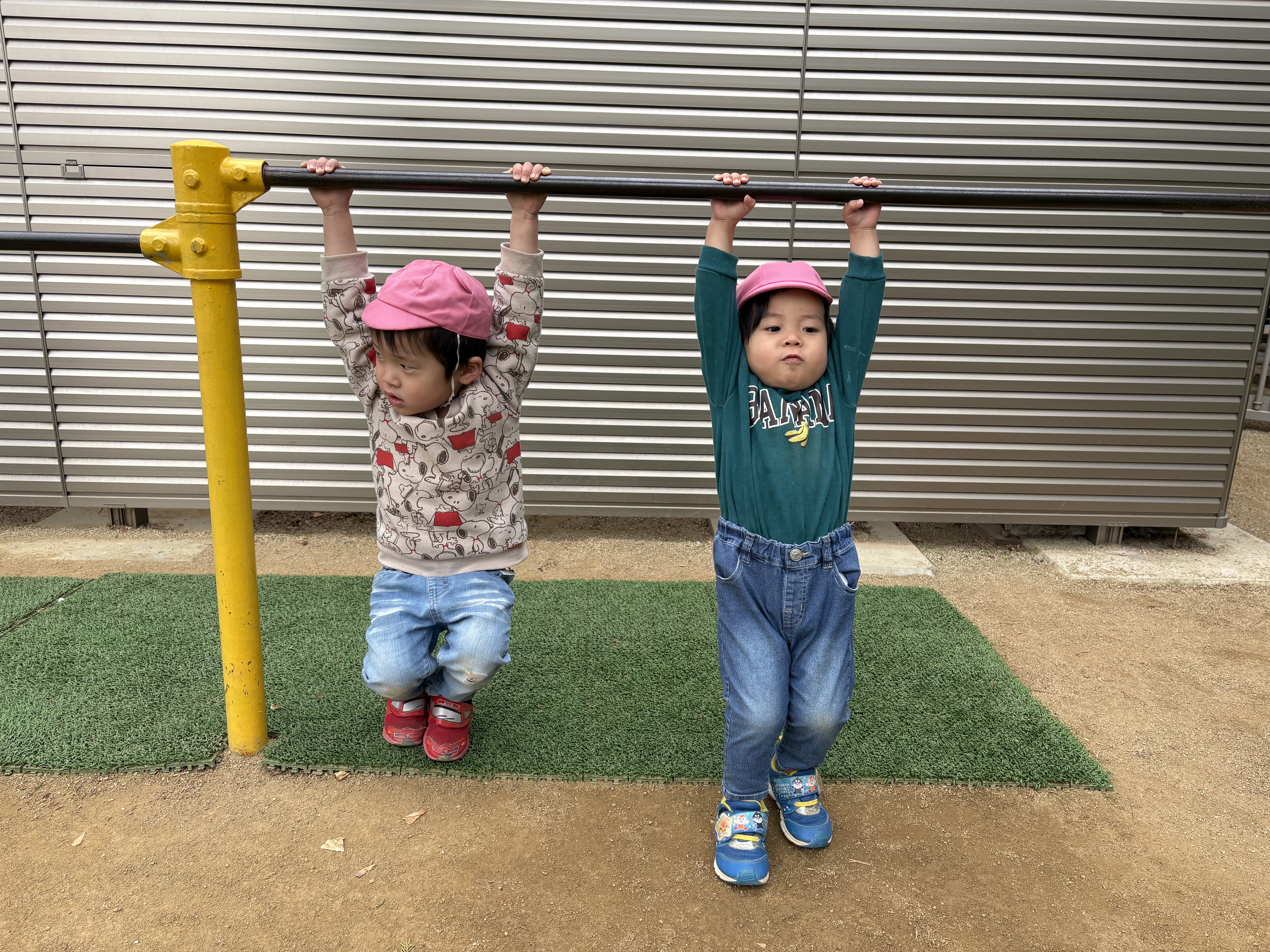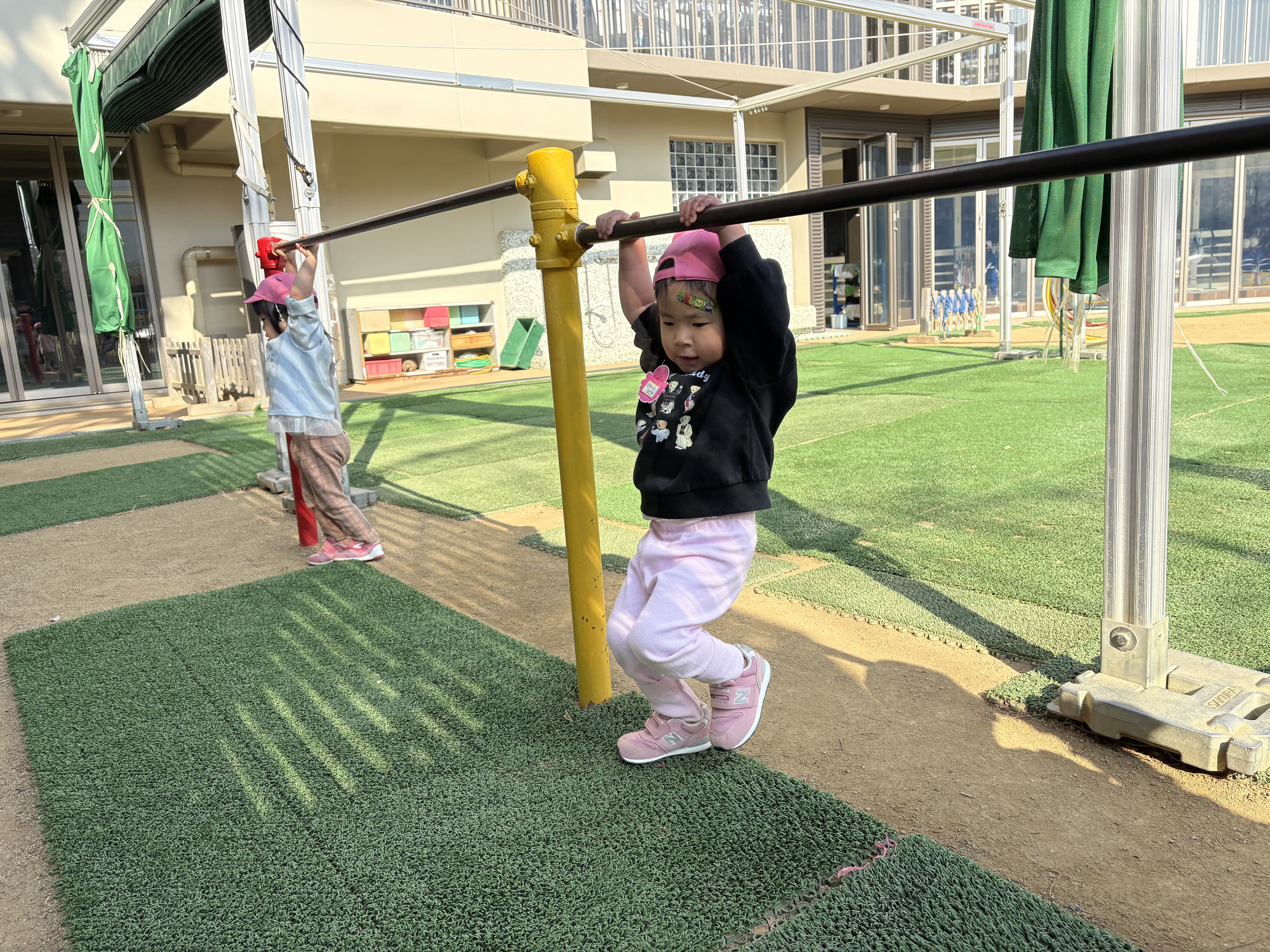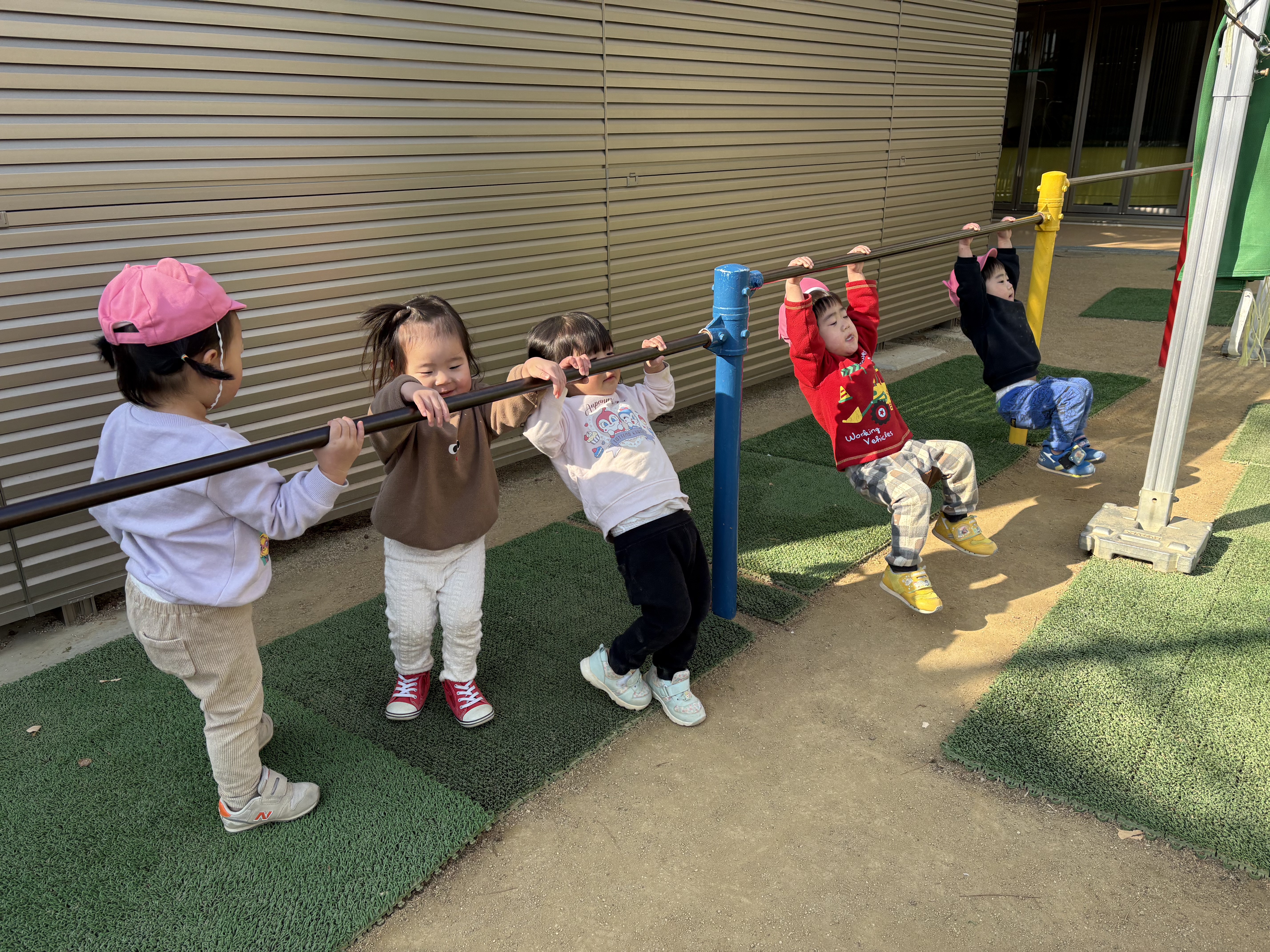 ジャングルジムで十分遊んだ後は、まだまだ体を動かしたい!!という思いが強く今度は鉄棒に移動して幼稚園のお兄さん・お姉さんの真似をして鉄棒を握ったり、ぶら下がったり挑戦は続きます。始めて!?鉄棒に触れる子たちに持ち方を教えると棒をしっかり持ち、足を浮かせてぶら下がっていました。いろんなことに興味津々の子どもたちは持ち方をすぐに覚えて、足を上手に浮かせ、ぶら下がっていました。