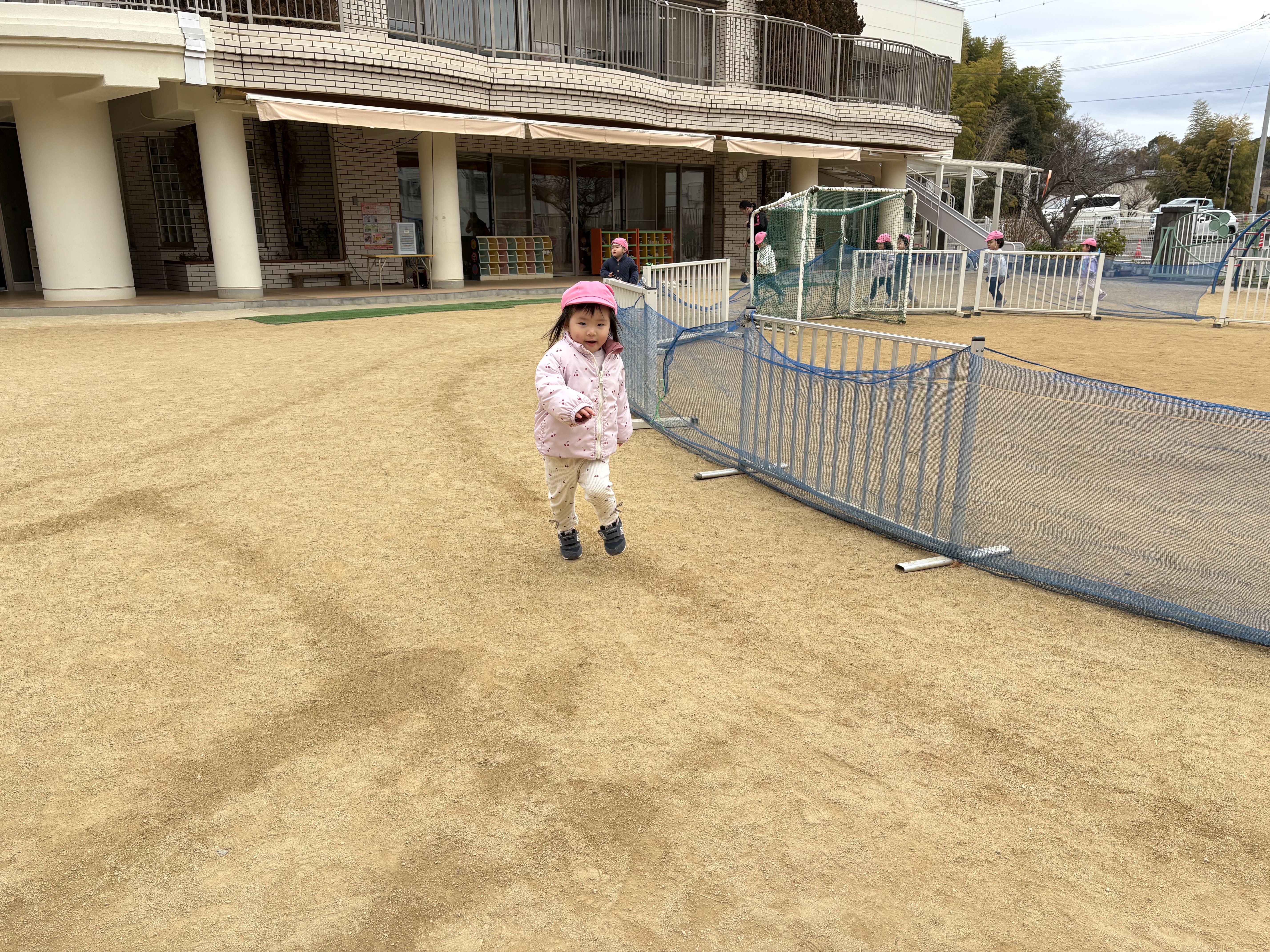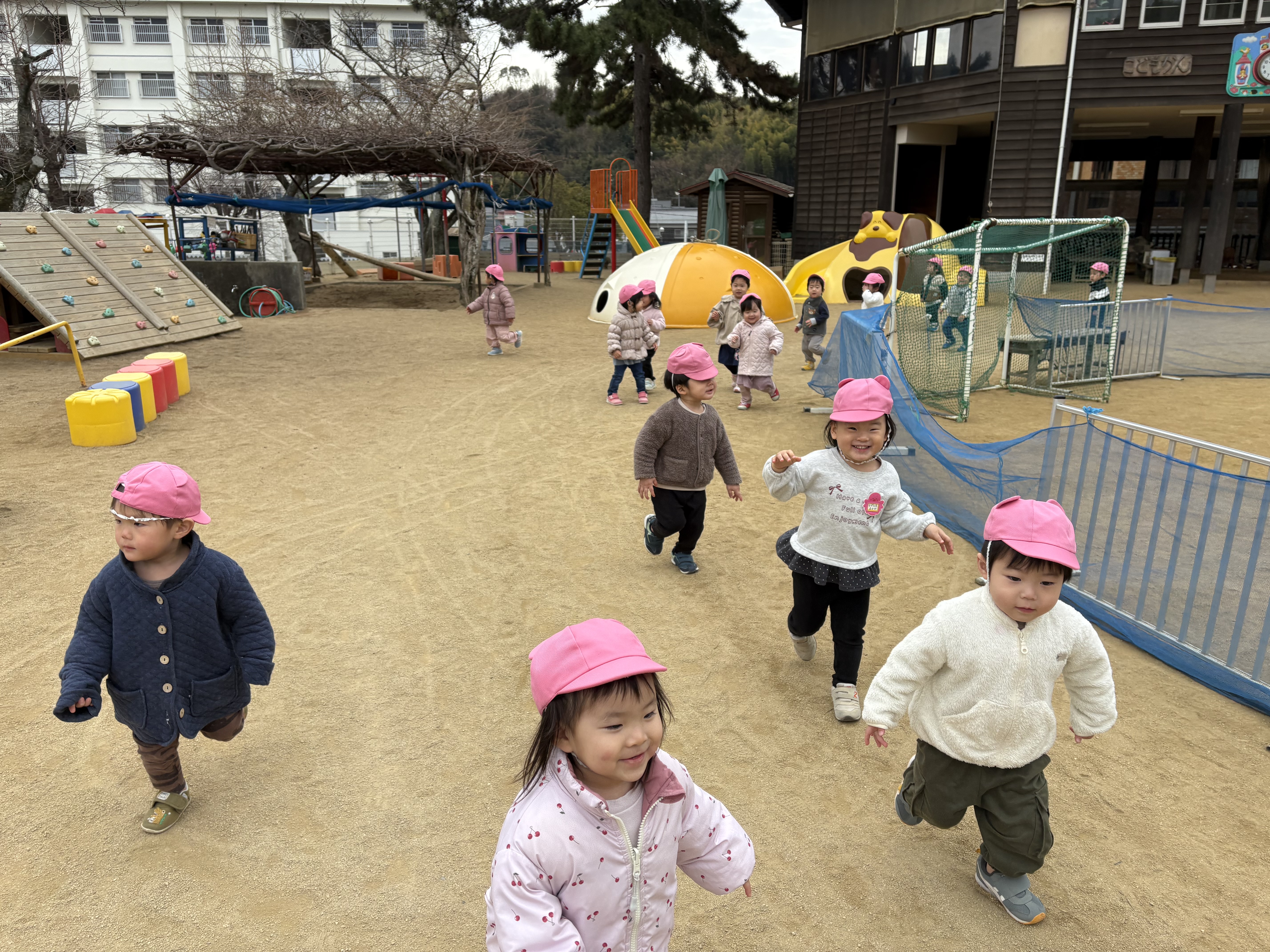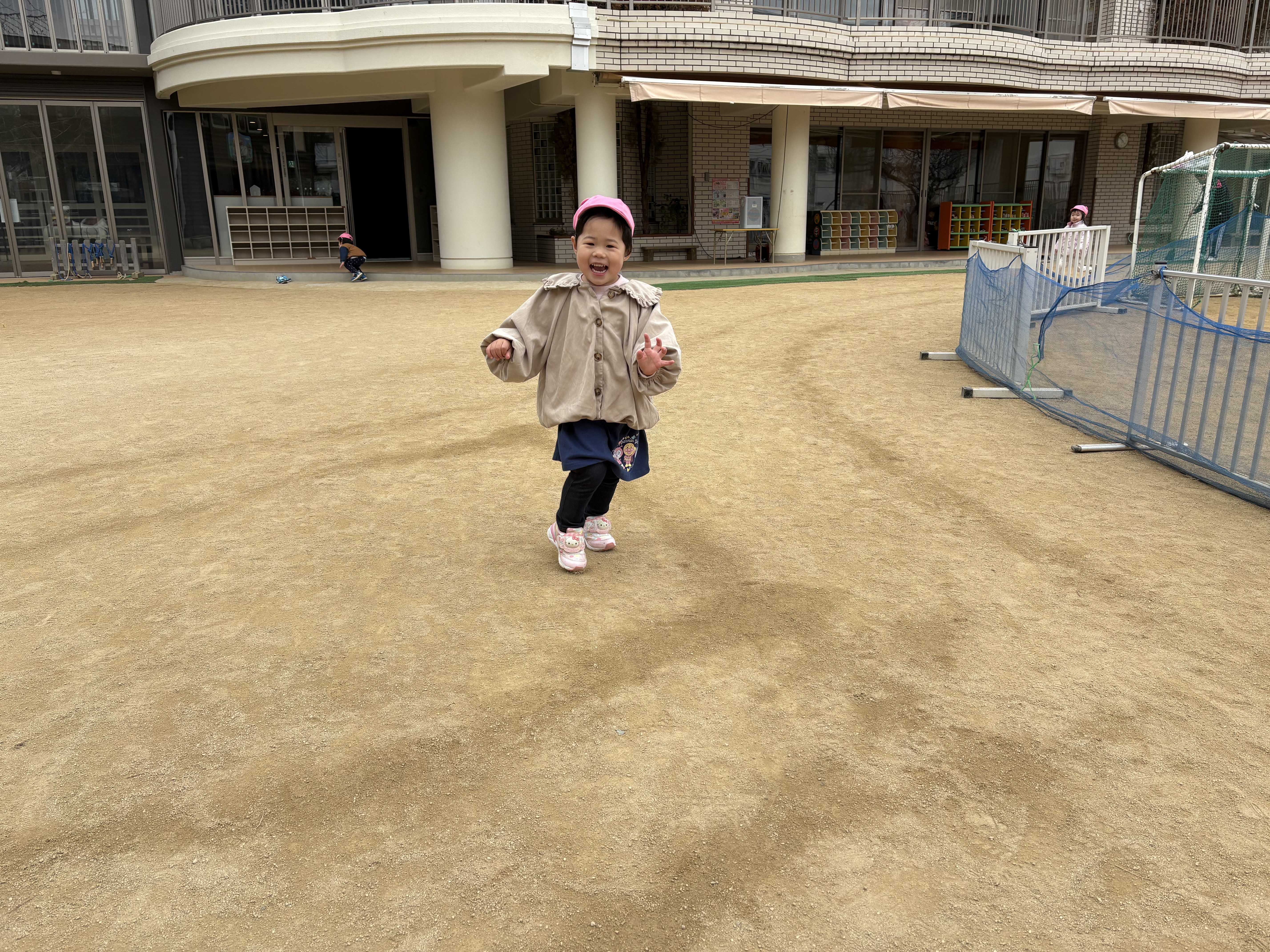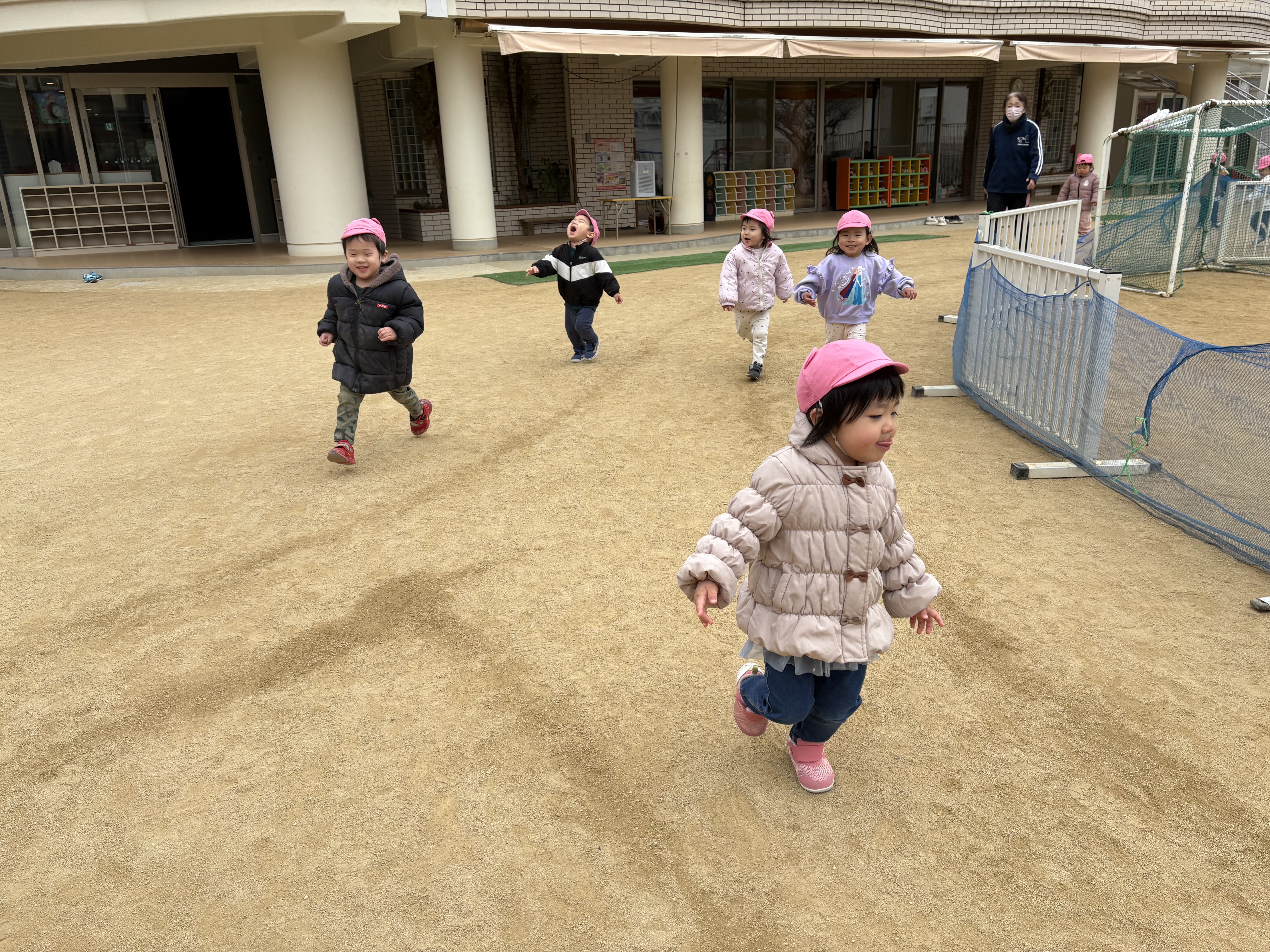 また別の日には、少し冷たい風が吹いていたので園庭を走ることにしました。走る前に子どもたちに気合いを入れてもらおうと「がんばるぞ」と声をかけると笑顔で「オー!!」と返事が返ってきました。気合いを入れた後はいよいよスタートです。「よーいどん」のかけ声とともに走り出した子どもたち。勢いよく走って転んだ子もいましたが、泣かずにすぐに立ち上がって走ったり笑顔で走ったり保育教諭を追いかけながら走ったり、1人1人楽しそうでした。