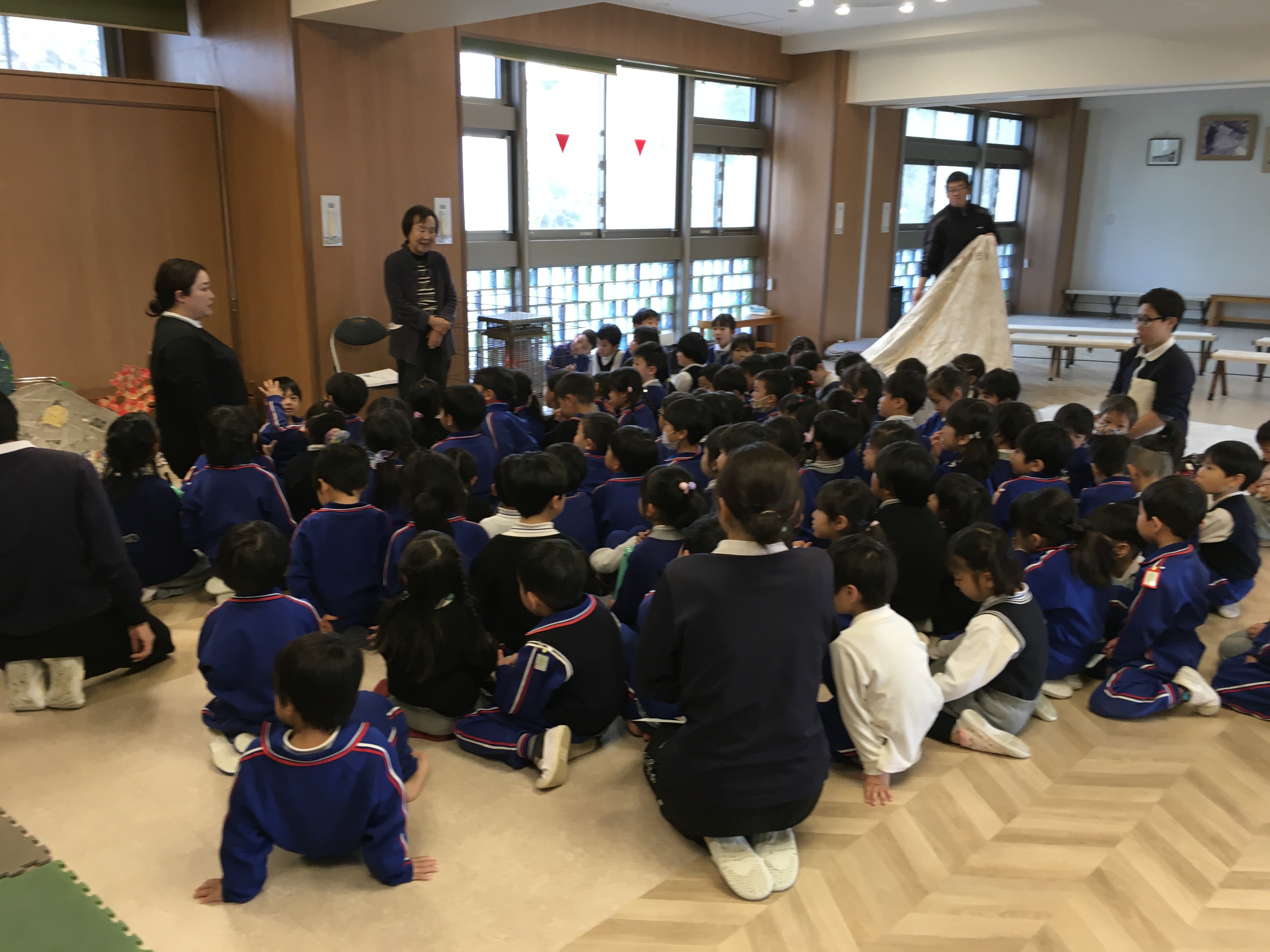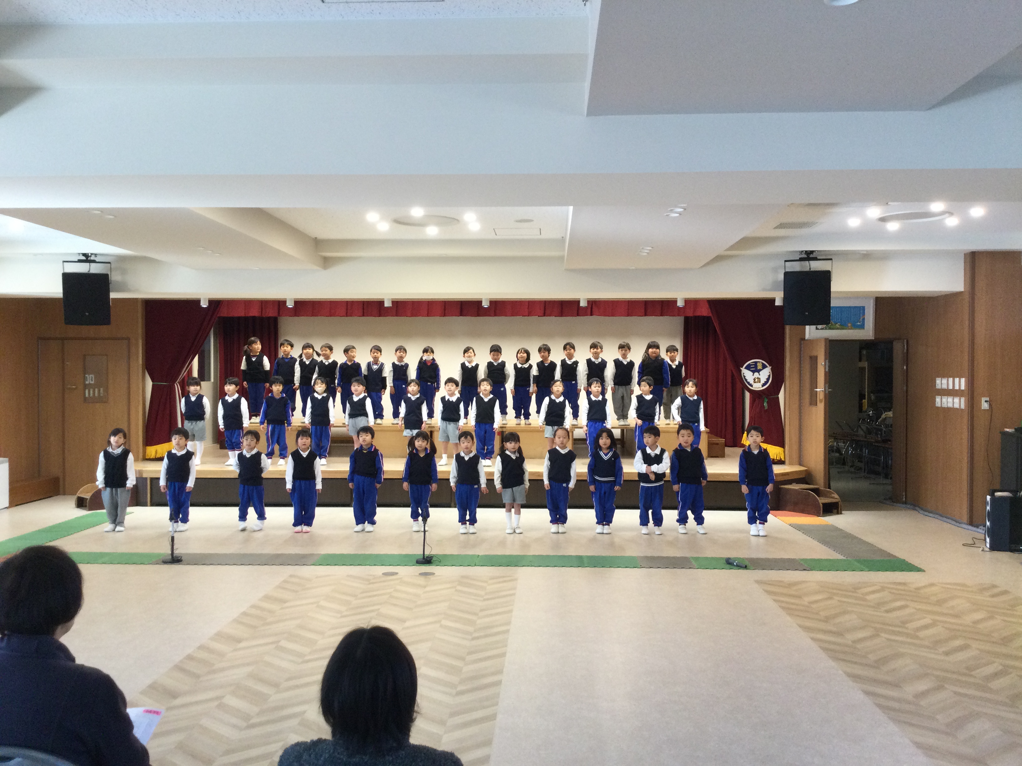 各学年の通し練習が終わると、年長さんは古森先生の前に集まりました。ここで質問です。「古森先生!どうやったらお歌が上手に歌えるようになりますか?」と質問すると「手話の山中先生は手話をしながら綺麗な声でみんなに教えてくれるでしょ?」と始まり「三葉幼稚園の年長さんは凄いんだよ。手話と歌を同時にしている所は他にはないと思うよ」と続けて話してくれました。園長はいつも上手に歌うコツは笑顔!!笑顔になると自然と心も温かくなり優しい声になる事を教師や子ども達に話してくれます。私たちもつい「大きな声」「聞こえな〜い!」等と言いがちになり子ども達が叫んだり引きつったりしてしまい反省しています。聞いてくれるお母さん、お父さん、みんなの事を思って歌えるようにしたいと思います。お父さん、お母さん達も笑顔でお願いします。