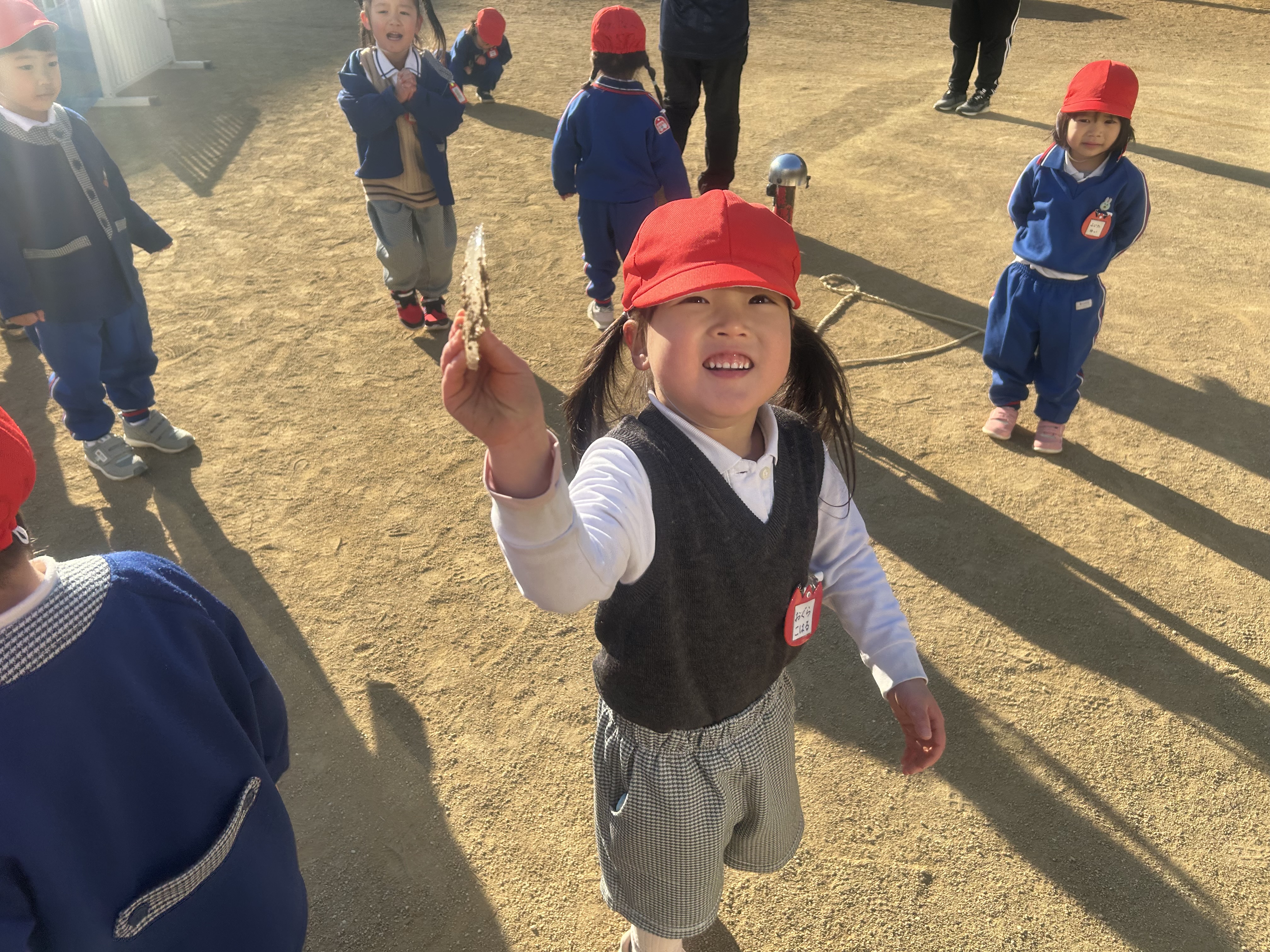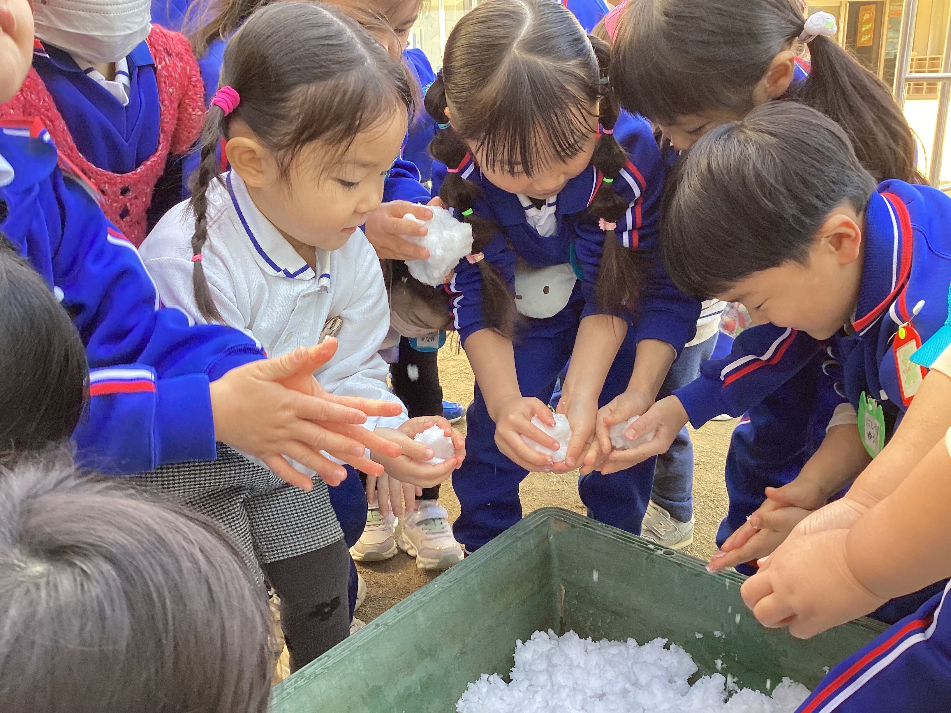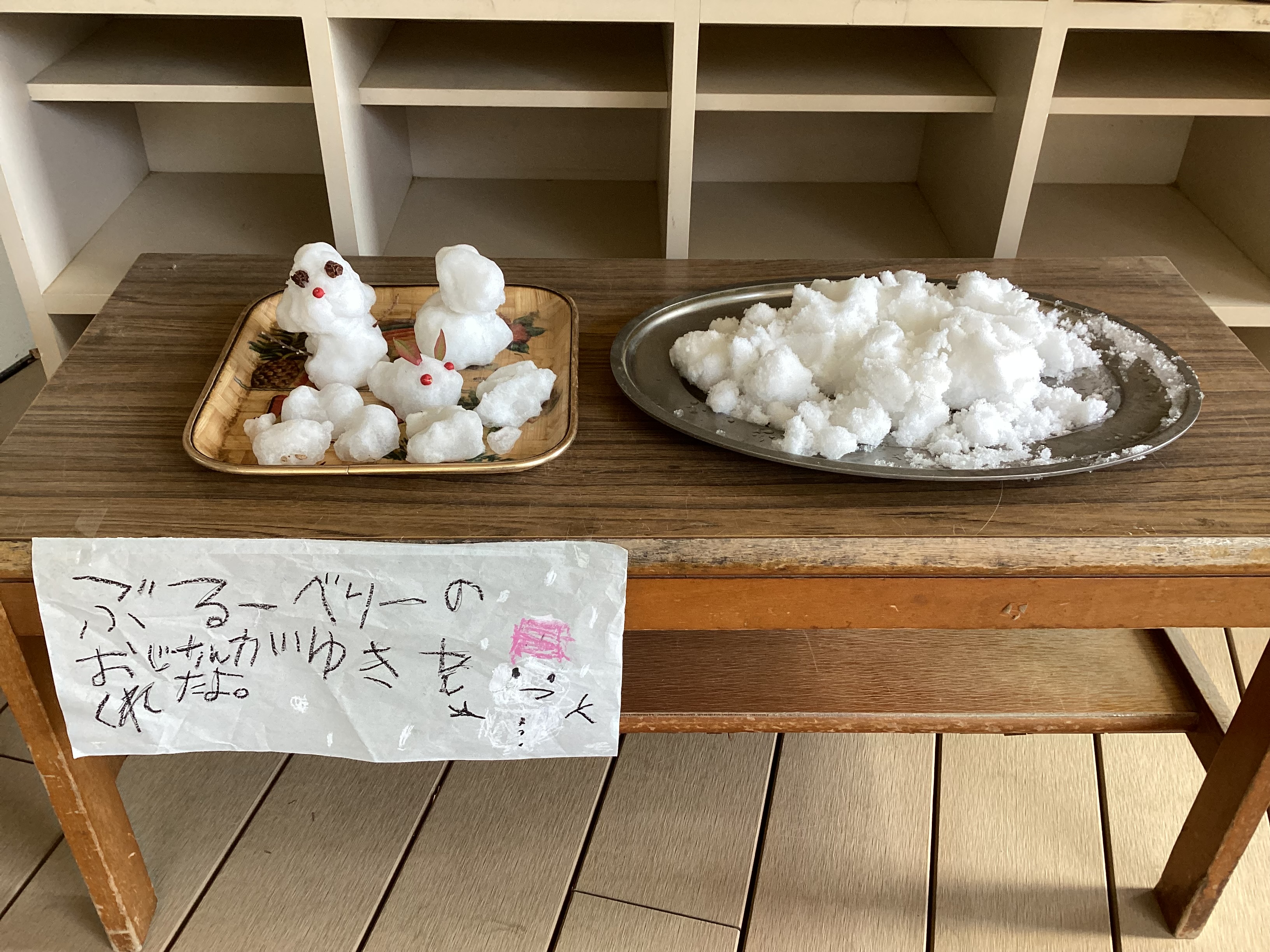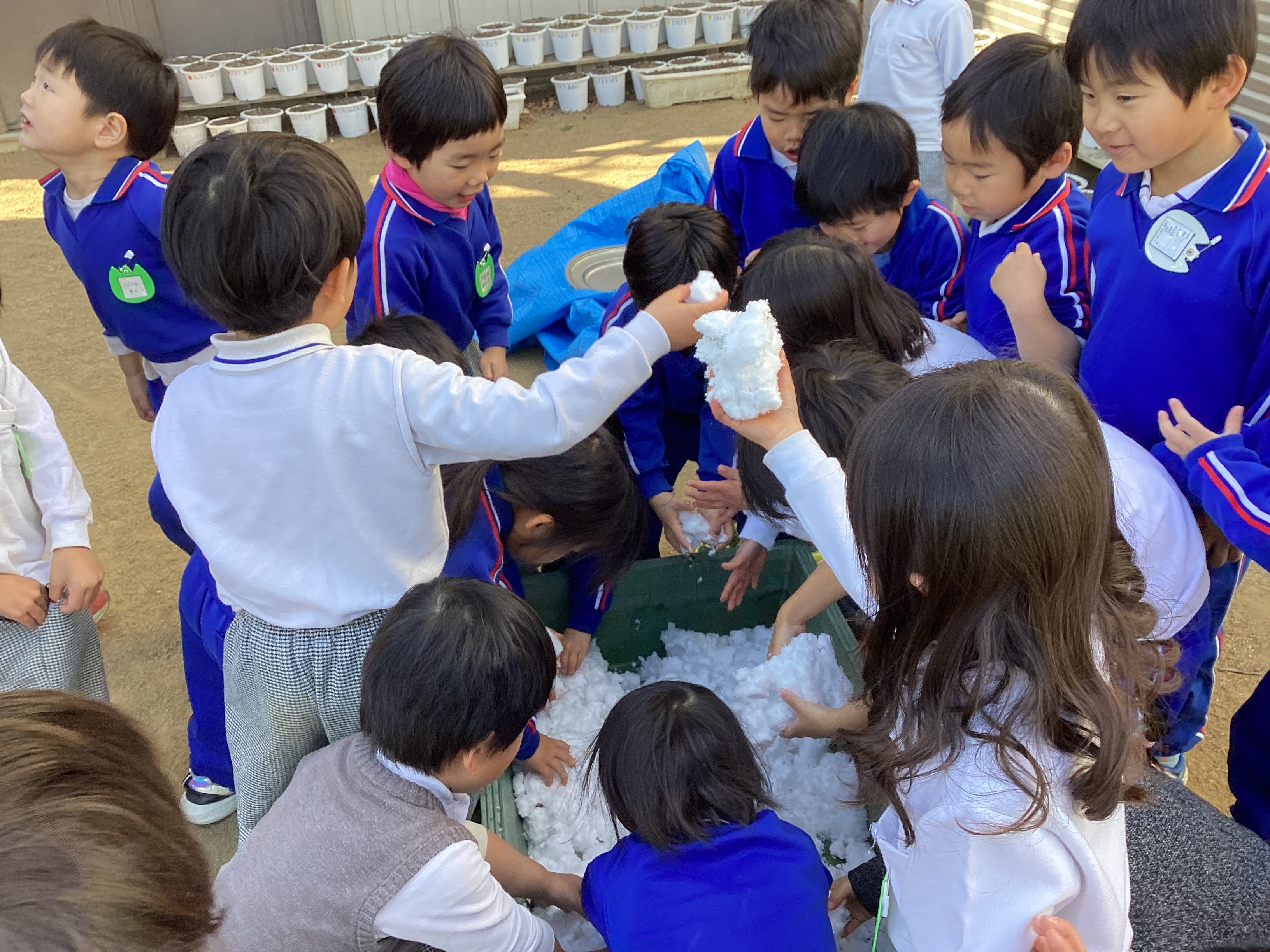 そんな中、園庭ではどの子も元気いっぱい遊んでいました。そこに、ポンタ農園の隣でブルーベリーを栽培されている石川さんが三葉幼稚園の子ども達のために自宅に積もっていた雪を持ってきてくださいました。昨日ちらちら降っていた雪ですが、幼稚園の園庭には全く残ったいなかったので、子ども達は「真っ白やね!」「冷たいね!」と言って喜んでいました。地域の方々の温かい心遣いのお陰で三葉っ子達は様々な体験ができている事に感謝です。ありがとうございました。