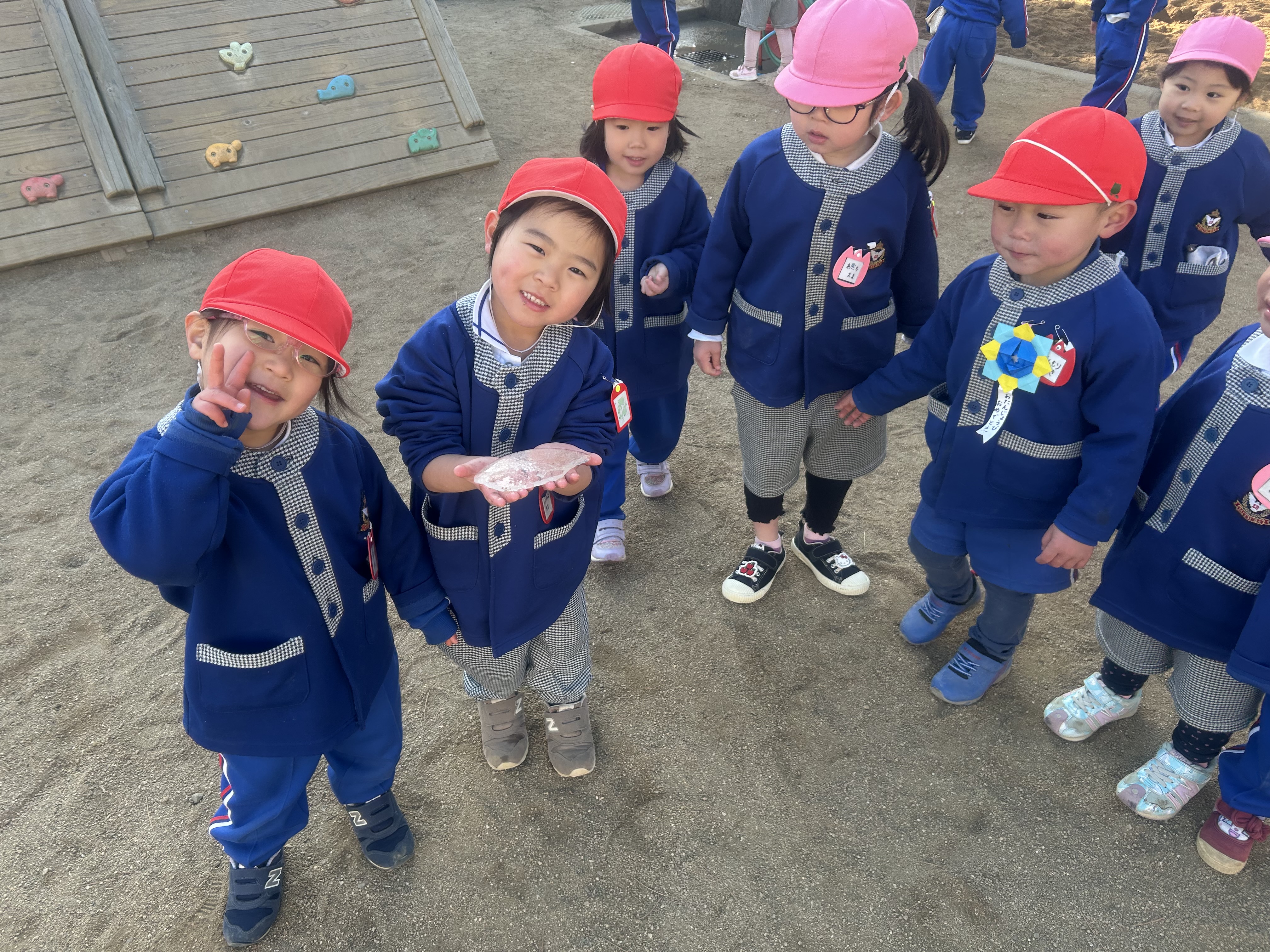 また、ちゅうりっぷ組のTちゃん達は氷を見つけて見せてくれました。次の日に、気温が低くなりそうな時には教師がなべに水を入れて戸外へ置いて帰ります。今日は狙い通り水が寒さで氷に変わり一段と厚い氷が出来ていて子ども達も「少し重たいね!」「冷たーい!」とニコニコ。Tちゃんが両手に持って力を入れてみても割れない氷を見てもう一度驚く子ども達でした。