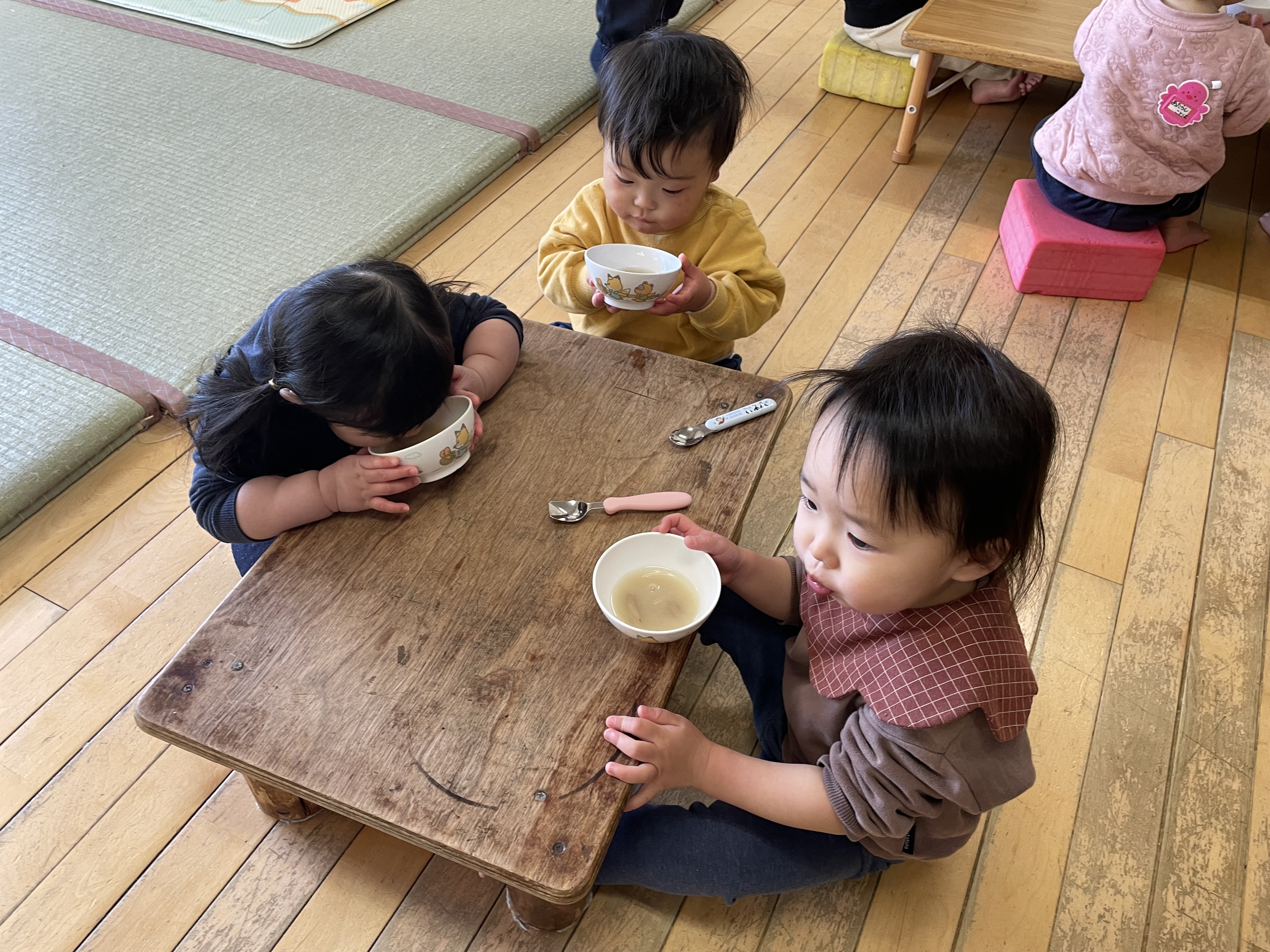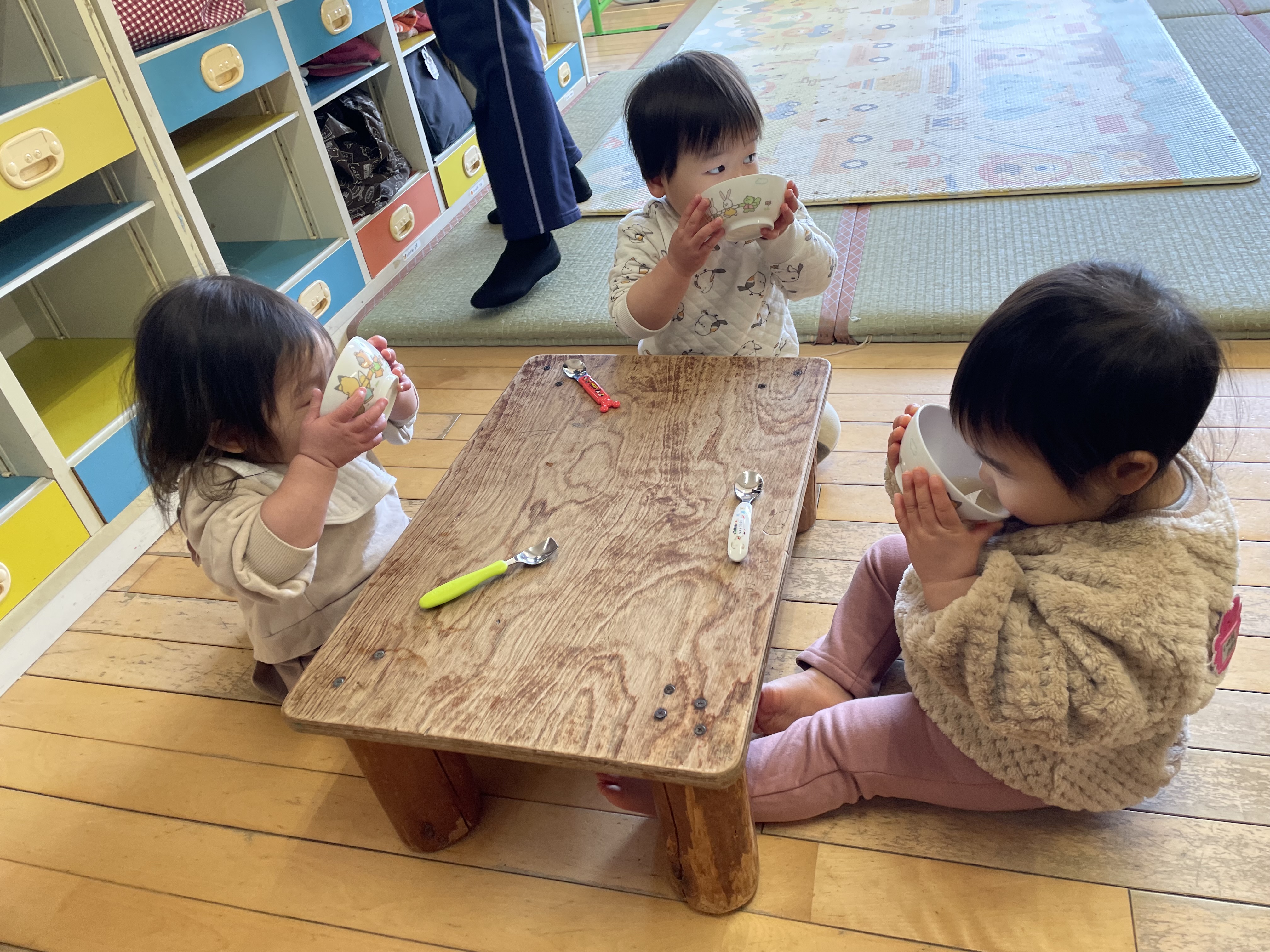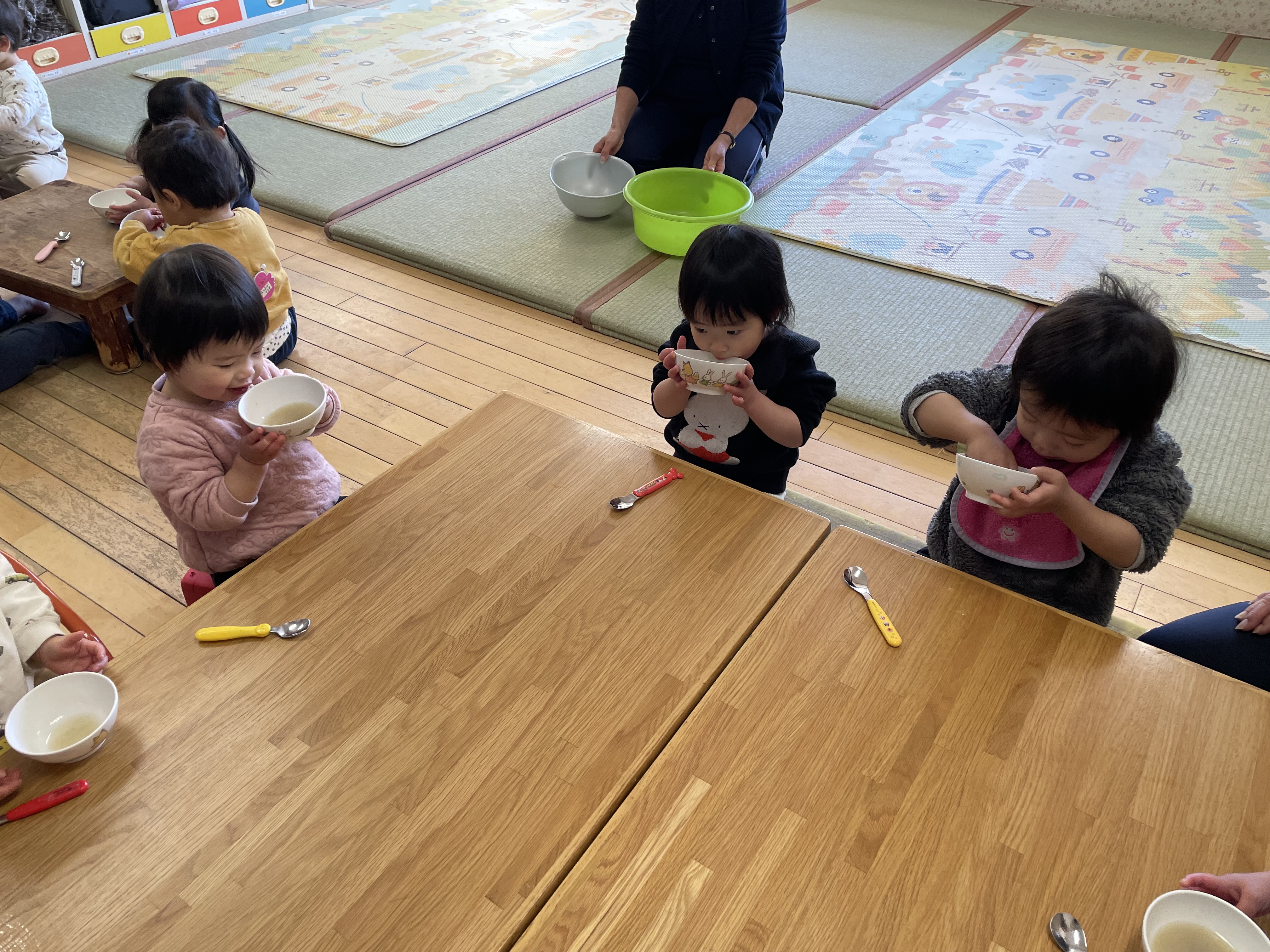 2月に入り朝晩厳しい寒さが続いていますが、子ども達は1月から始まった10時の味噌汁作戦の効果?で毎日元気に登園しています。もも組の子ども達は、味噌汁作戦が始まった頃は保育教諭が味噌汁が入ったおわんを支えてあげな いと不安定だったのですが、今では「いただきます!」をするとしっかり自分で持って飲む事が出来るようになりました。「おいしい?」と聞くと、おわんを下げて「おいし!」と言ってくれる幸せそうな笑顔に癒されます。もも組の子ども達も出来なかった事が少しずつ出来るようになってきています。1つ1つ出来るようになった喜びを味わえるよう、一人一人に必要な援助をしながら新しい事に挑戦させていきたいと思います。
