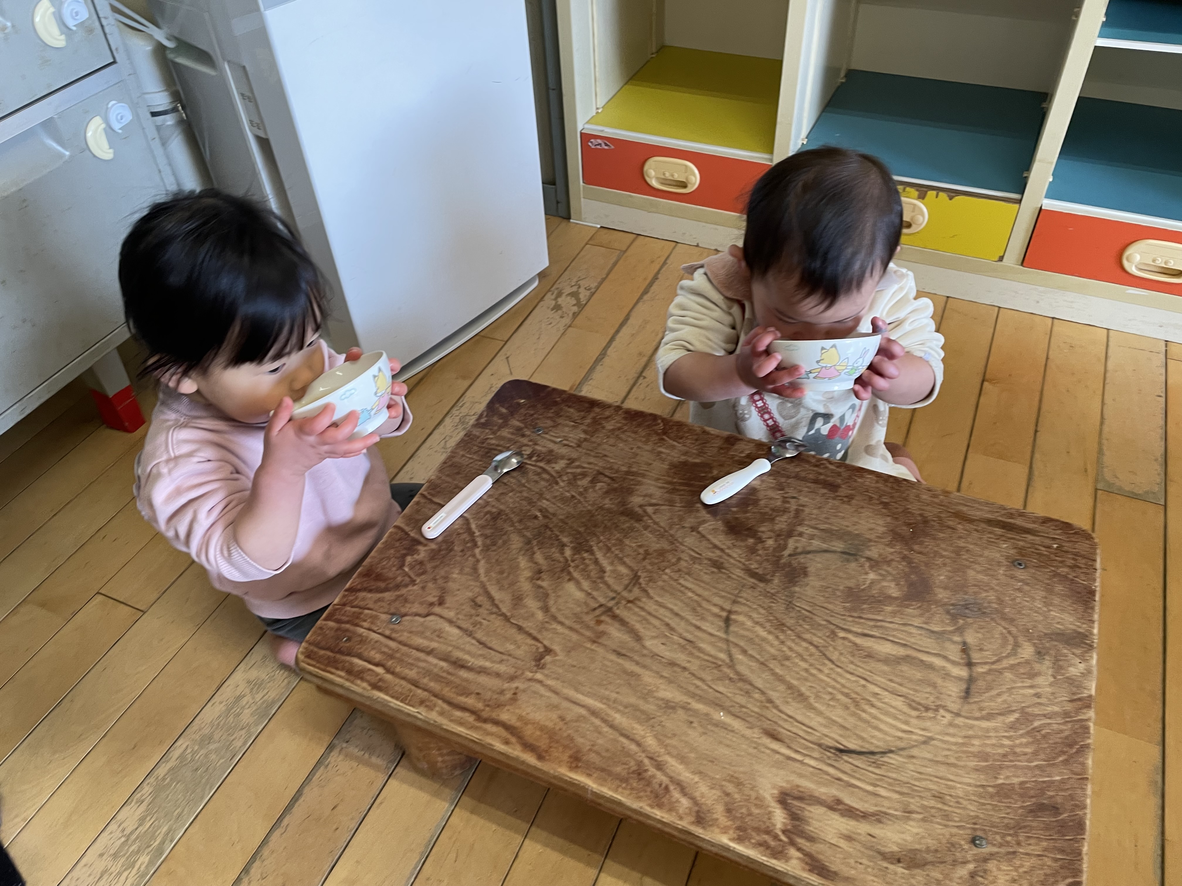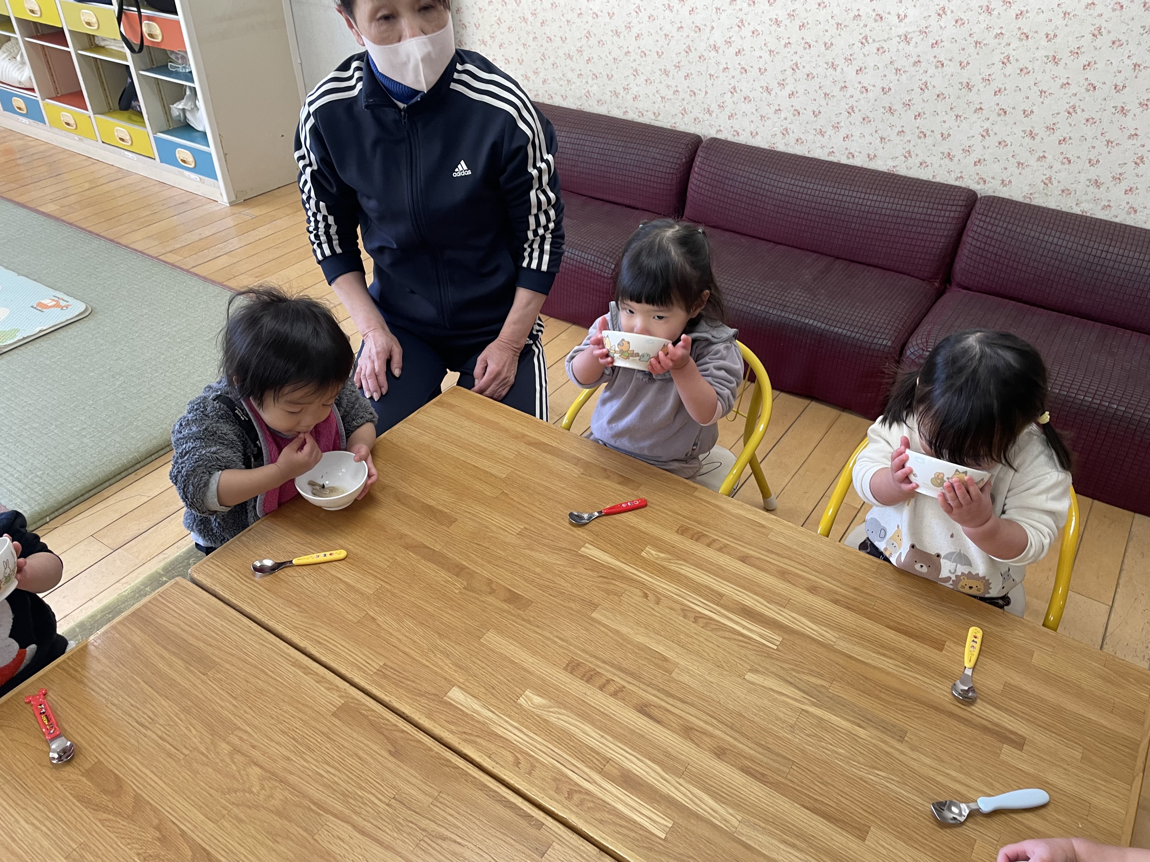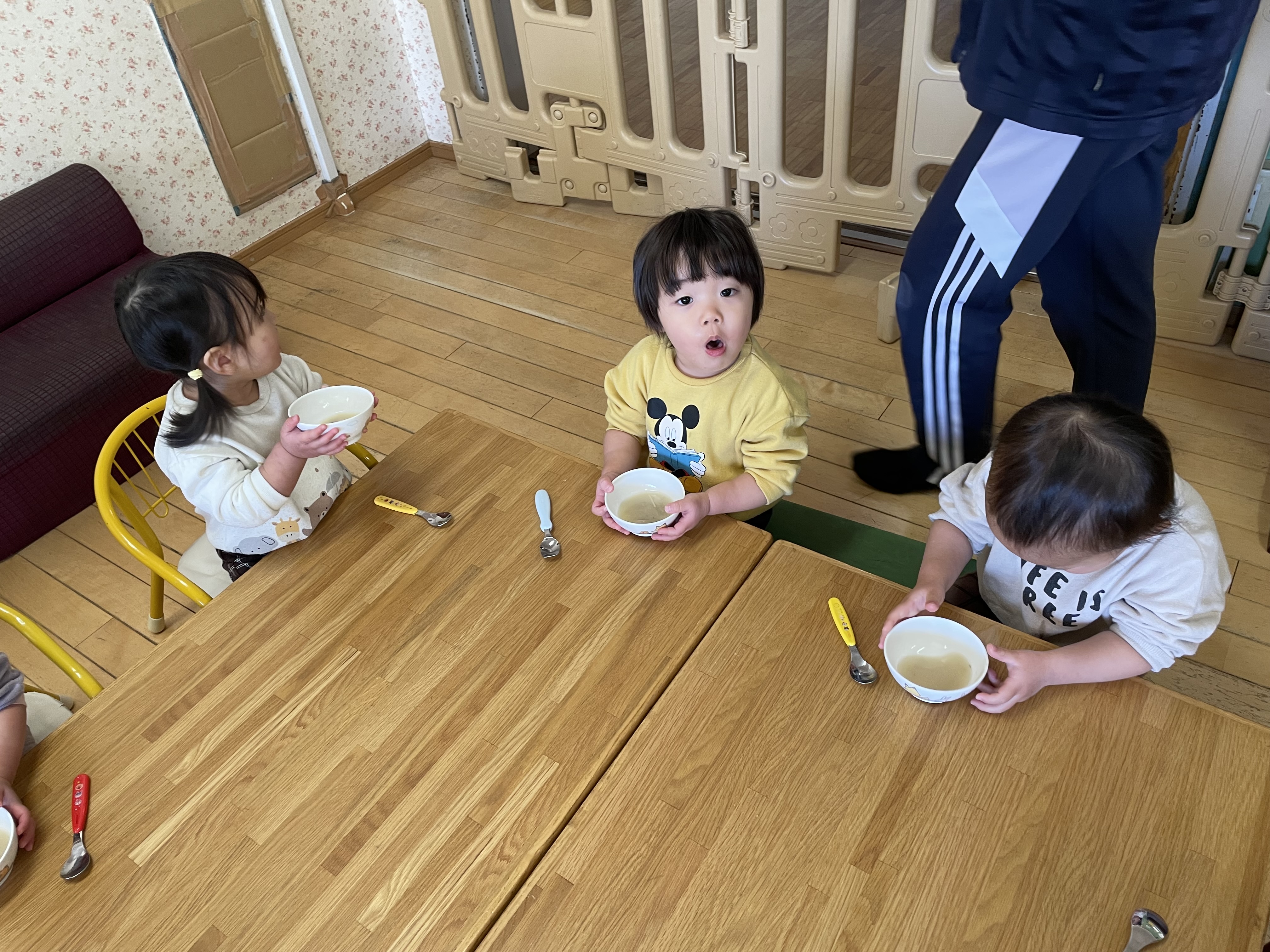 2月に入り朝晩厳しい寒さが続いていますが、子ども達は1月から始まった10時の味噌汁作戦の効果?で毎日元気に登園しています。もも組の子ども達は、味噌汁作戦が始まった頃は保育教諭が味噌汁が入ったおわんを支えてあげな いと不安定だったのですが、今では「いただきます!」をするとしっかり自分で持って飲む事が出来るようになりました。「おいしい?」と聞くと、おわんを下げて「おいし!」と言ってくれる幸せそうな笑顔に癒されます。もも組の子ども達も出来なかった事が少しずつ出来るようになってきています。1つ1つ出来るようになった喜びを味わえるよう、一人一人に必要な援助をしながら新しい事に挑戦させていきたいと思います。