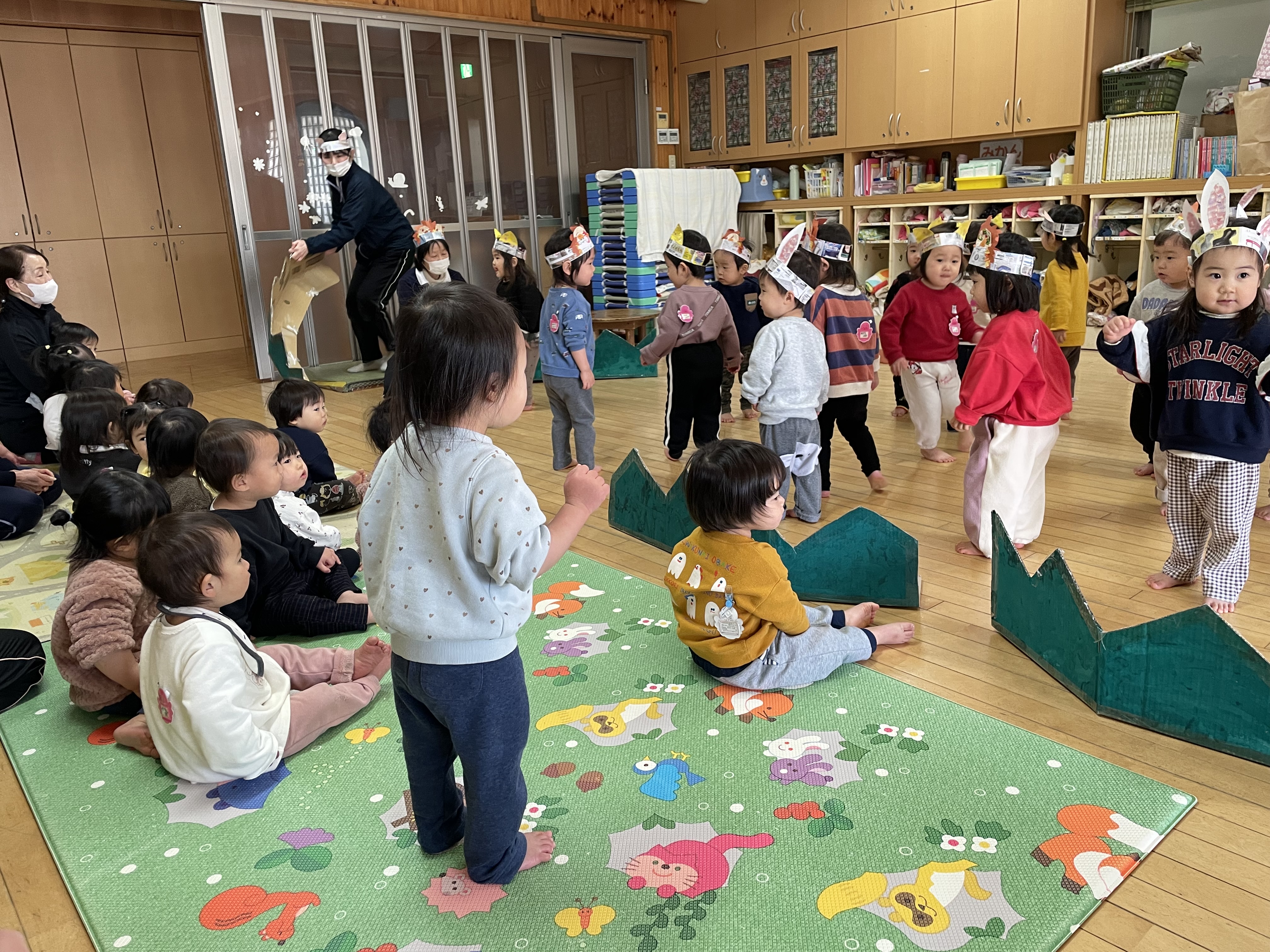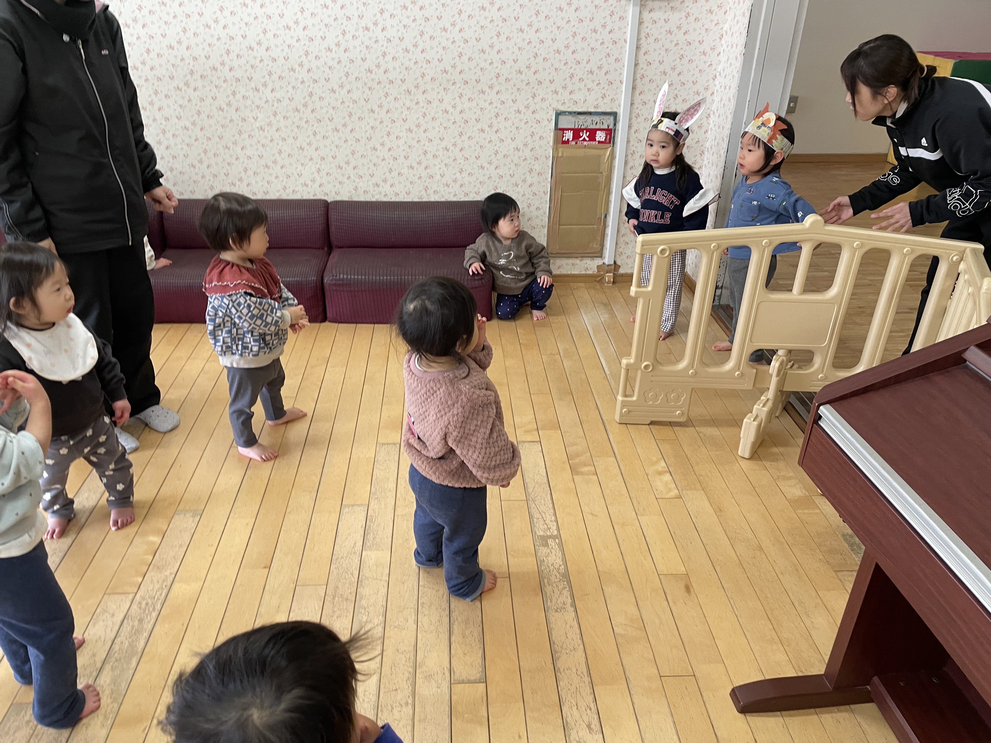 ひよこ組は2月28日のおゆうぎ会に向けて各クラスで練習を始めています。もも組では、まず楽しく踊りや手遊びが出来るように遊びに取り入れています。その日の気分で踊ったり、踊らなかったりする子ども達ですが、少しずつ自分達のペースでやっていく事が出来るようにしていきたいと思っています。お客さんや他の人達に見られる事にも少しずつ慣れさせたいと、みかん組の子がもも組に「きてね!」と誘いに来てくれました。子ども達に「踊り見に行く?」と聞いてみると「いく!」「やったー!」と大喜びでした。もも組の子ども達もお部屋で踊っているので、立ち上がって踊り始める子、手拍子をする子、終始笑顔でじっと見ている子、さまざまですがみんな楽しみながら見る事が出来ていました。「もも組にも見に来てね!」と約束をして、タッチをしてくれる子もいて、嬉しそうな子ども達です。初めての事が多いもも組の子ども達ですので、見てもらう事にも少しずつ慣れさせ、見てもらう事の楽しさを感じられるように工夫していきたいと思います。今、いろいろな事に興味を持つ時期なので、子ども達と楽しみながら練習をして、本番ではとっても可愛い姿を見て頂けるよう練習をし、準備をしています。