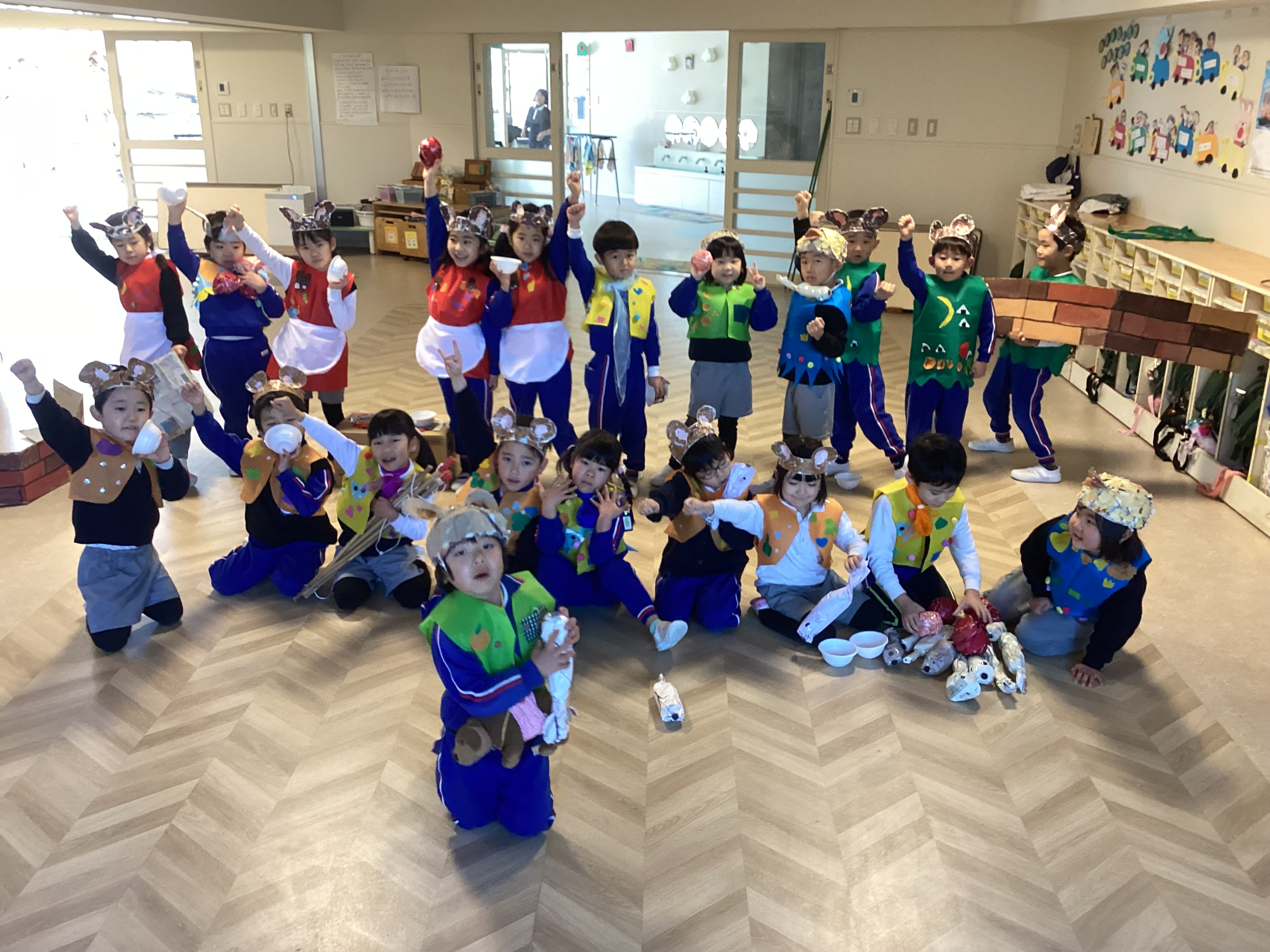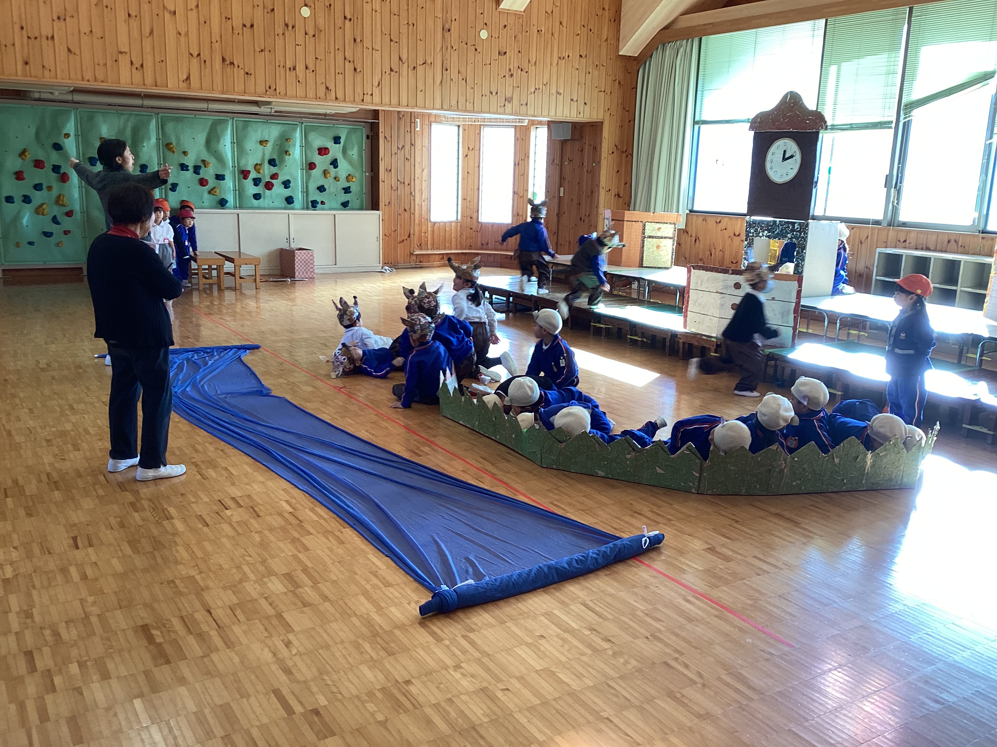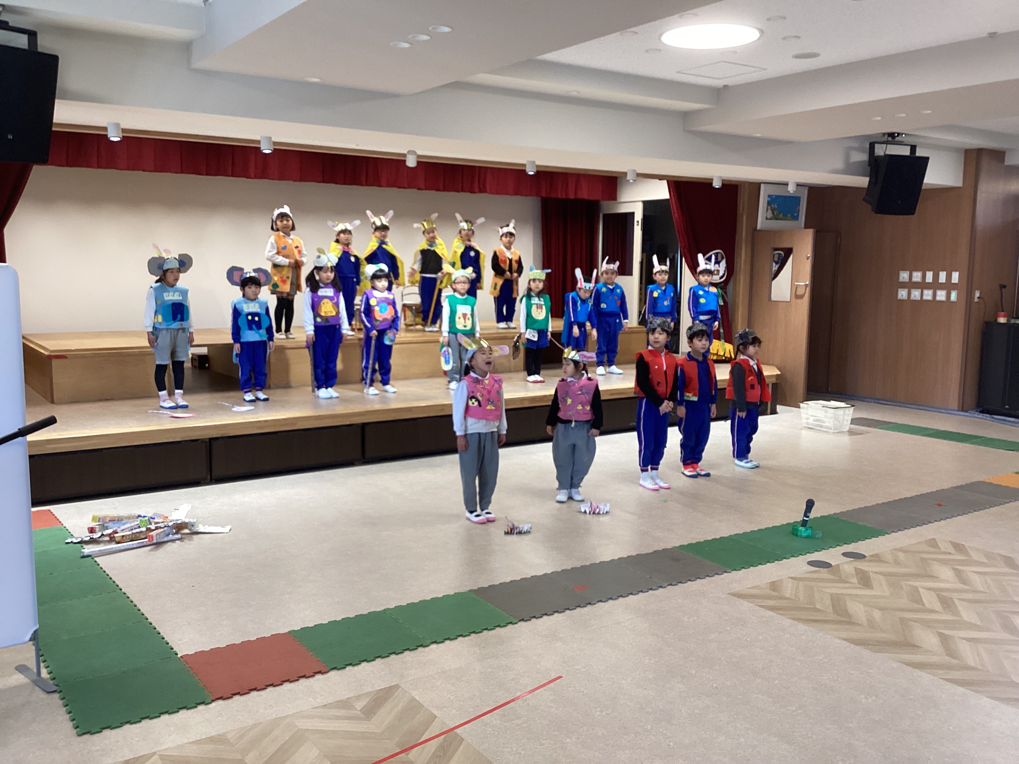 昨日、松前文化センターでリハーサルを終えた子どもたちは、朝からいつも以上に張り切った表情で登園してきました。「明日が本番やね!」「おじいちゃんとおばあちゃんも見に来てくれるんよ。」「先生、私たちの劇ちゃんと見てよ!」「今日が最後の練習やけん、頑張らんといかんね!」と、あちらこちらで期待にあふれた声が聞こえてきます。その瞳はキラキラと輝き、自分たちの舞台を心から楽しみにしている様子が伝わってきました。