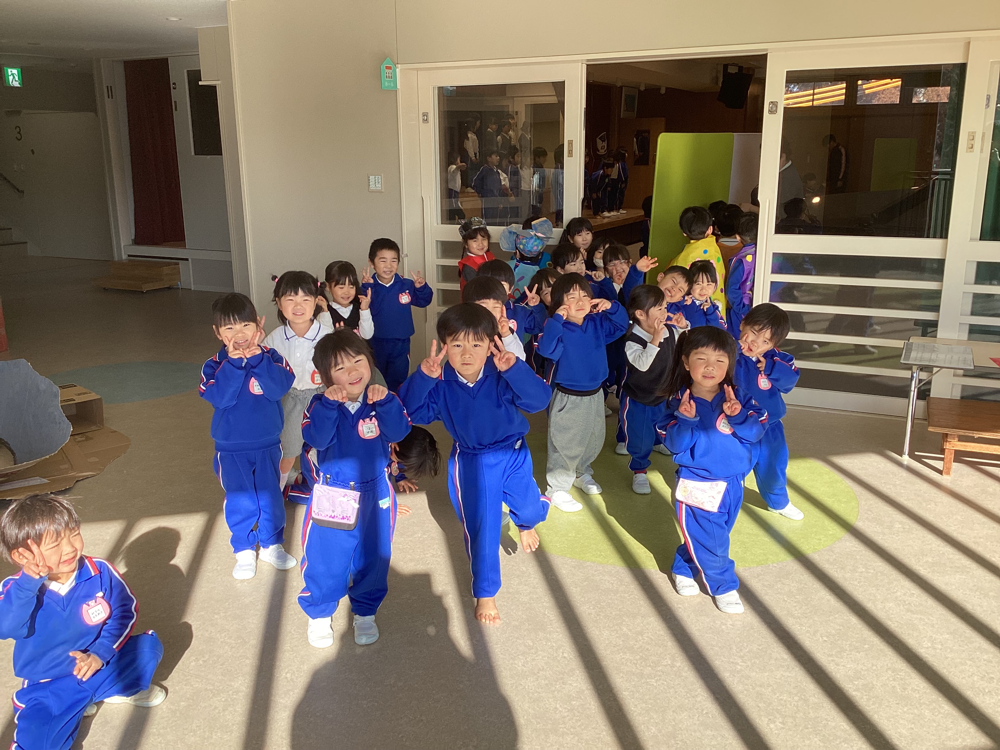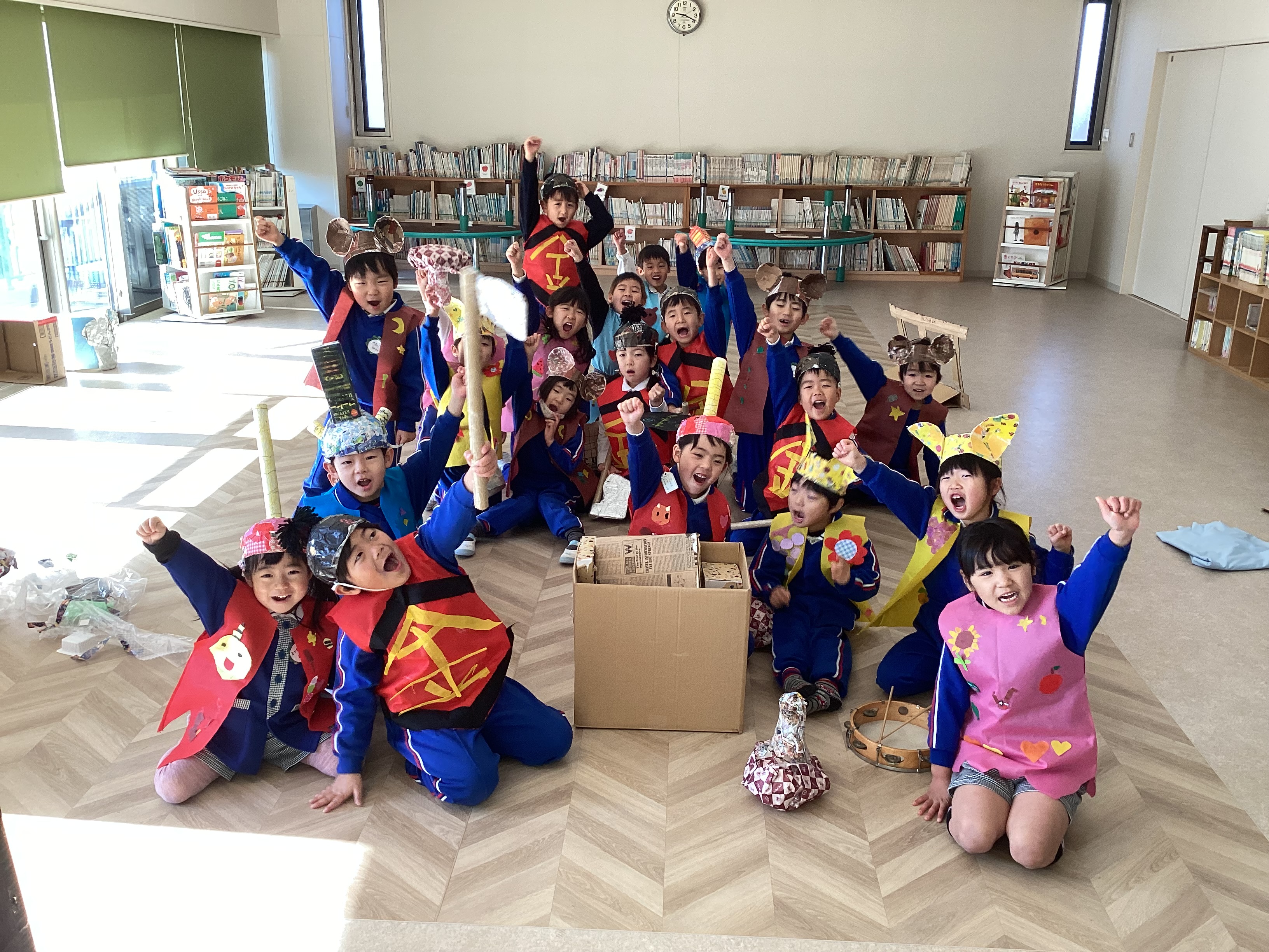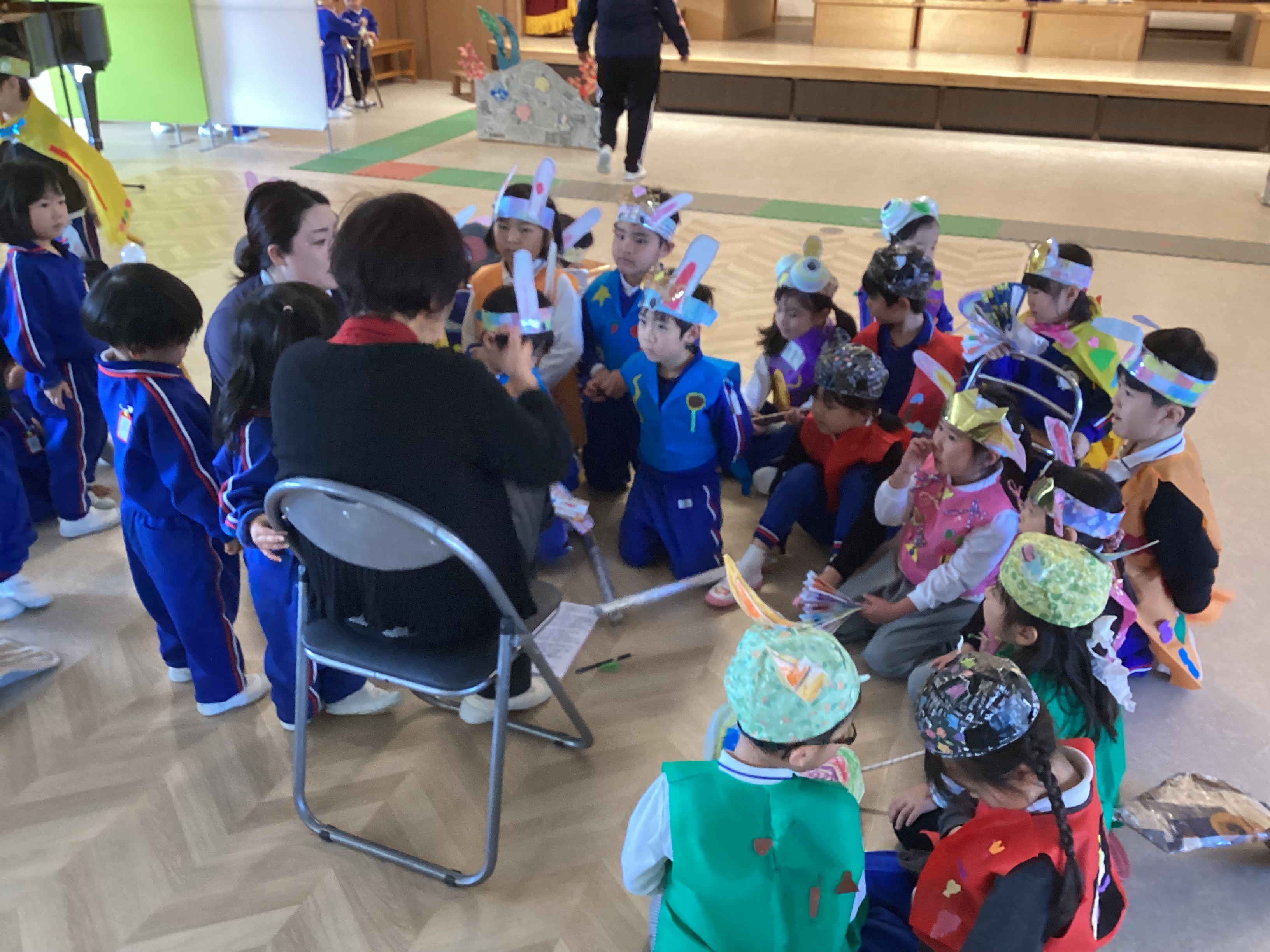 昨日、松前文化センターでリハーサルを終えた子どもたちは、朝からいつも以上に張り切った表情で登園してきました。「明日が本番やね!」「おじいちゃんとおばあちゃんも見に来てくれるんよ。」「先生、私たちの劇ちゃんと見てよ!」「今日が最後の練習やけん、頑張らんといかんね!」と、あちらこちらで期待にあふれた声が聞こえてきます。その瞳はキラキラと輝き、自分たちの舞台を心から楽しみにしている様子が伝わってきました。