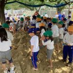 今日はまず、年中年長組が戸外に出て遊びました。今日は特に砂場と泥場が大盛況!仮園舎にも砂場を作ってはいたもののみんなで遊ぶには狭く、30人入ってもまだゆとりのある本園の砂場は魅力的に見えるのでしょう!学年関係なくみんなが楽しそうに協力したり、相談したりしながら砂を掘って遊んでいました。泥場では、「先生、おれ泥団子作るん久しぶり!」と言いながら、らいおん組のKくんが上手に丸めていました。できあがった泥団子は大切そうに「これ持って帰ってお母さんに見せる!」とカップに入れていました。一年ぶりの遊びの姿が教師たちにとってはなんだか懐かしく思えます。