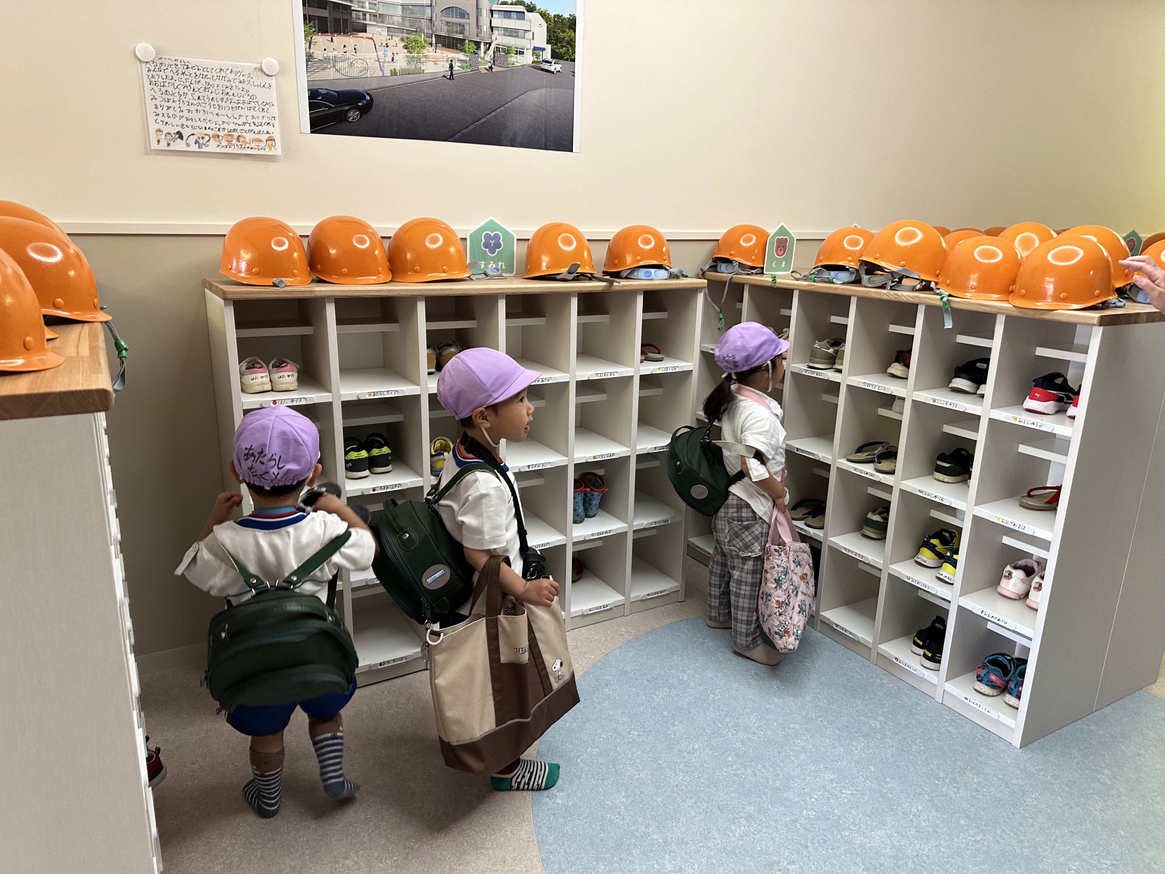 さて玄関も今までとは違います。新園舎正面のガラスのパネルドアが全開で、まるで子どもたちを待ち構えていたかのように見えました。年中・年長児が新園舎の保育室に入ると先週末にはなかったロッカーや戸棚、ピアノが入っていて、目をまんまるにして「うわぁ~!」とまたまた喜びのジャンプ♪土曜日のうちに教師・お引越し屋さん、業者さんと大人数で大型家具を入れました。今日タイミングよく、業者さんが古森先生とお部屋の前を通りかかったので子どもたちと、お引越しの手伝いのお礼を伝えました。まだまだ新しい備品を持って来てくれるそうです。土曜日に子ども達のロッカーのシールを貼っていたのでさすが年中・年長児!自分で探したり、わからない友達の名前を見つけて教えてあげたり、まるで宝探しのようでした。所持品の始末をしながらぱんだ組のYちゃんが私の所へ来て「先生、Yのお母さんも新しい幼稚園いいな~って言よったんよ。新しいお部屋入りたいんやって。Yがね、楽しいよっていっぱい話したんよ。今度お母さんも幼稚園来ていい?」とかわいい話をしてくれました。50年に一度の建て替え工事!こんな良いタイミングに巡り合えて子どもたちも私たちも幸せです。