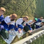 お弁当も、さんさんらんどで食べました。木陰を探して食べたり、芝生の上にビニール袋を敷いて食べたり、思い思いの場所でみんなと一緒に食べるお弁当は最高です。りす組のRくんは「たまごを食べると元気になる!」と言いながらお母さんの卵焼きをほおばっていました。そのうち「先生食べ終わったんだけど・・・」とうずうずする子が出てきました。「いいよ。」と声をかけると「やった~!!」と大喜びでビニール袋を片手に駆け出してあっという間に園庭中を袋の風船がぽんぽん飛び始めました。子ども達の袋を縛っている時に、道路を通る車からの視線を感じました。「なにしてるんだろう?」「わぁ、かわいい!楽しそう!」と言わんばかりの表情で地域の方々が通っていくのが面白くて笑ってしまいました。