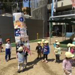 空を見上げると年中・年長さんのこいのぼりが風に吹かれて気持ちよさそうに揺れていました。そこで、今日は年少・たんぽぽ組のこいのぼりも飾るということで、早速青組の子どもたちは自分達の作ったこいのぼりを部屋から園庭へと運んで来ました。