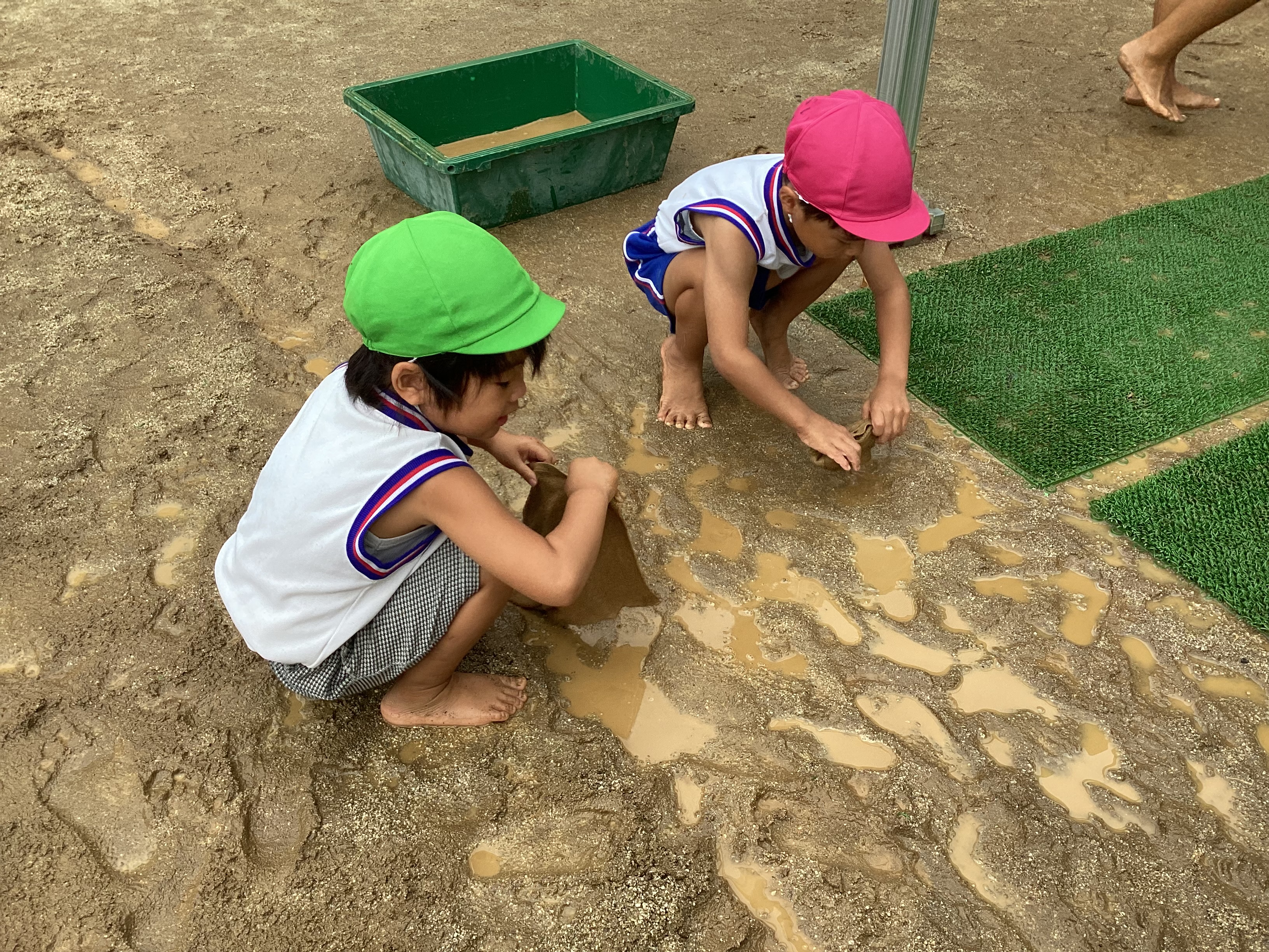 それを見ていた古森先生は近くに居た年中児のK君とA君に水たまりの水を早く上手に取る方法を教えてくれました。穴を少し掘ることで周りの水が流れてきて小さな池ができるので、その水を取る、という画期的な方法でした。泥水に雑巾をつけ水を吸わせて絞る・・・雑巾の絞り方も教わりながら何度も繰り返し楽しんで行っていました。