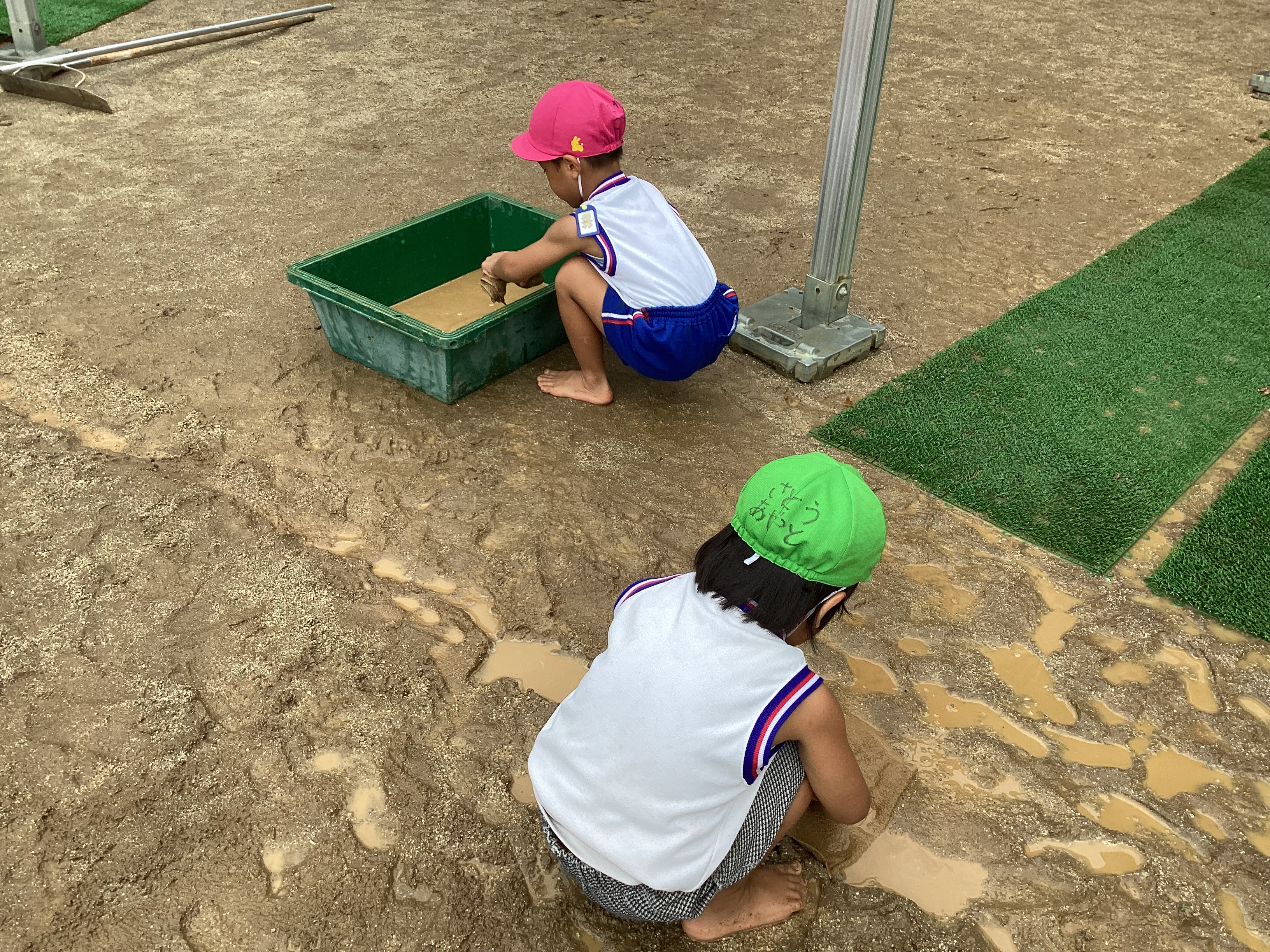 今朝の園庭は昨夜からの雨で沢山の水たまりができていました。今日は青コースが運動会のオープニング練習をする予定だったので、教師たちが水を取り除いて土を入れ園庭をならしていました。