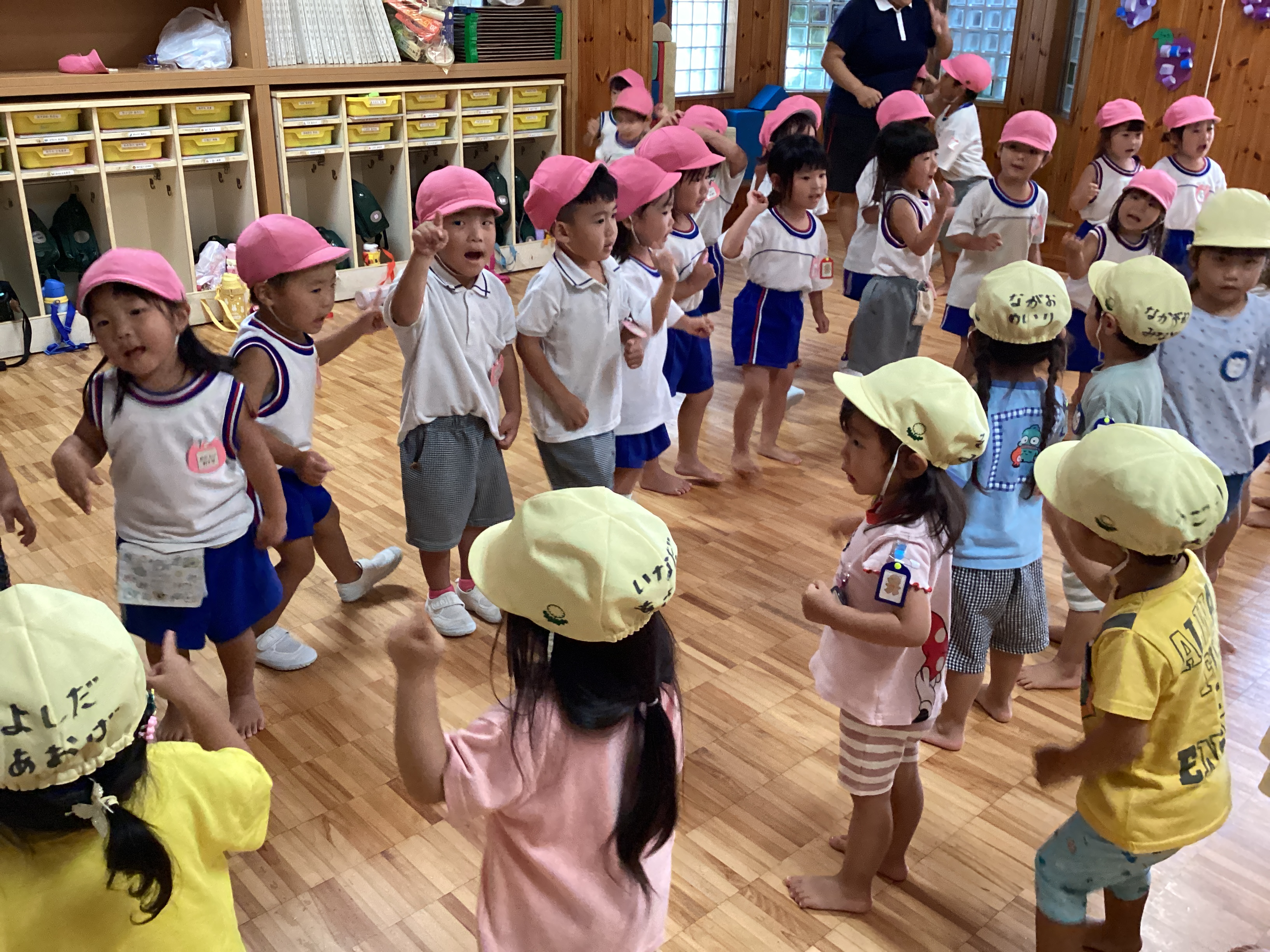 その後は、オープニングの踊りを一緒に踊りました。さくら組さんは歌を歌いながらダイナミックに堂々と踊っていたので圧倒されていたのですが、それを見ながらとても楽しそうに踊る姿が見られました。いつもとはまた違った雰囲気で、異年齢の子と関わる時間の大切さも改めて感じました。