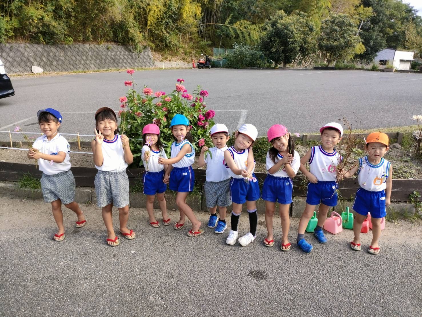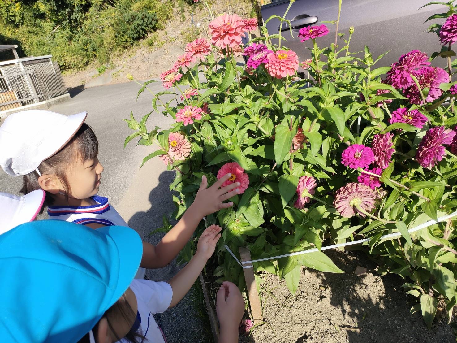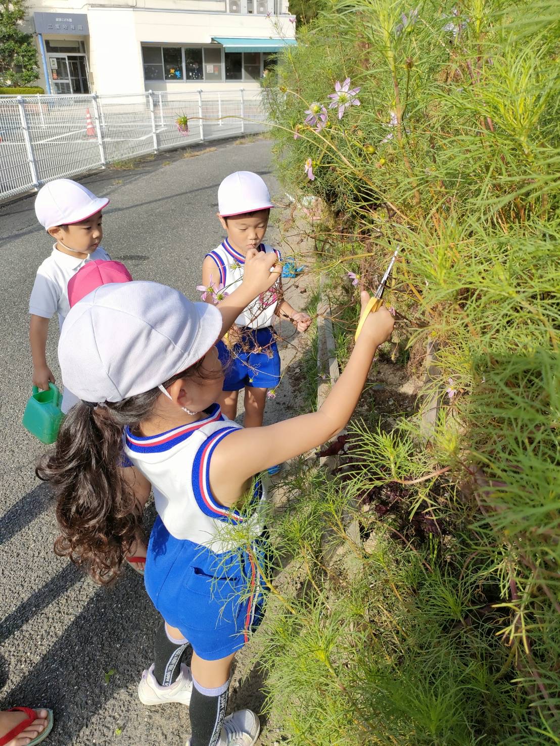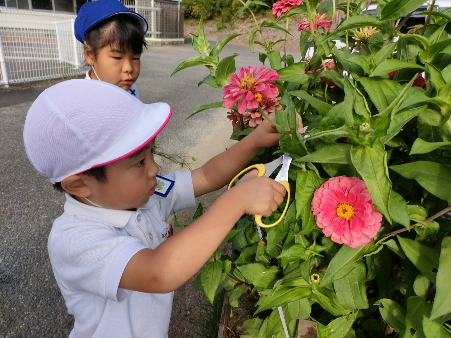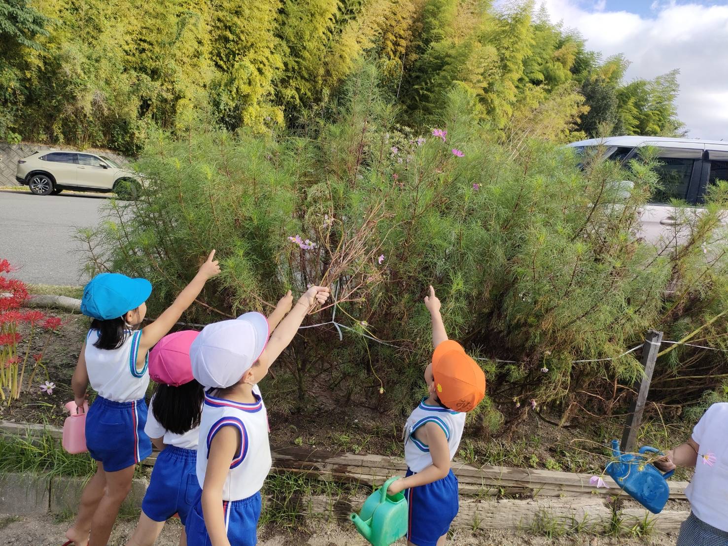 昨日のこと古森先生が駐車場に咲いていた百日草の花を摘んできて、運動会の退場門、さくらんぼちゃん?!に持たせてくれました。そこで、今日は久しぶりに駐車場の花壇の様子を見に行くことにしました。早速行くと、一番に出迎えてくれた百日草は、濃桃色や薄桃色の鮮やかな色をしていて、お日様に当たってより一層色鮮やかに輝いて見えました。花を見た子ども達は「きれーい!!」「結婚式のお花みたい♪」「いいにおいがする〜♪」と、あまり見たことのない百日草の花を興味深く、色々な角度から観察していました。その隣には、1学期に年中組のみんなで植えかえをしたコスモスが咲いていました。植えかえた頃は、手の平にのるくらいの小さな苗でしたが、今では大人でも見上げるほど背丈が伸びていました。ところが大きく生長はしているのに花はほんの2、3本しかついていません。なんでかなー?と分からないことは古森先生に聞こう!と急いで聞きに行きました。すると、その原因は栄養不足で背丈だけがぐんぐん伸びたのかもと教えてくれました。コスモスが満開に咲いていないのは残念でしたが、それを聞いたTちゃんは「雑草抜きした方がいいよね?」とみんなに声をかけて、水やりと雑草抜きの世話した後2、3本だけ花を摘んで帰りました。その花をさくらんぼちゃんの頭や胸元に飾っておしゃれすると「可愛い〜♪」と満足そうにしていました。朝のたった30分ほどの出来事でしたが子ども達のちょっとした発見や発言がとても可愛らしく、楽しい時間となりました。運動会の練習も大切ですが、小さな自然の変化や発見も見過ごさないように保育をしようと感じた一日でした。