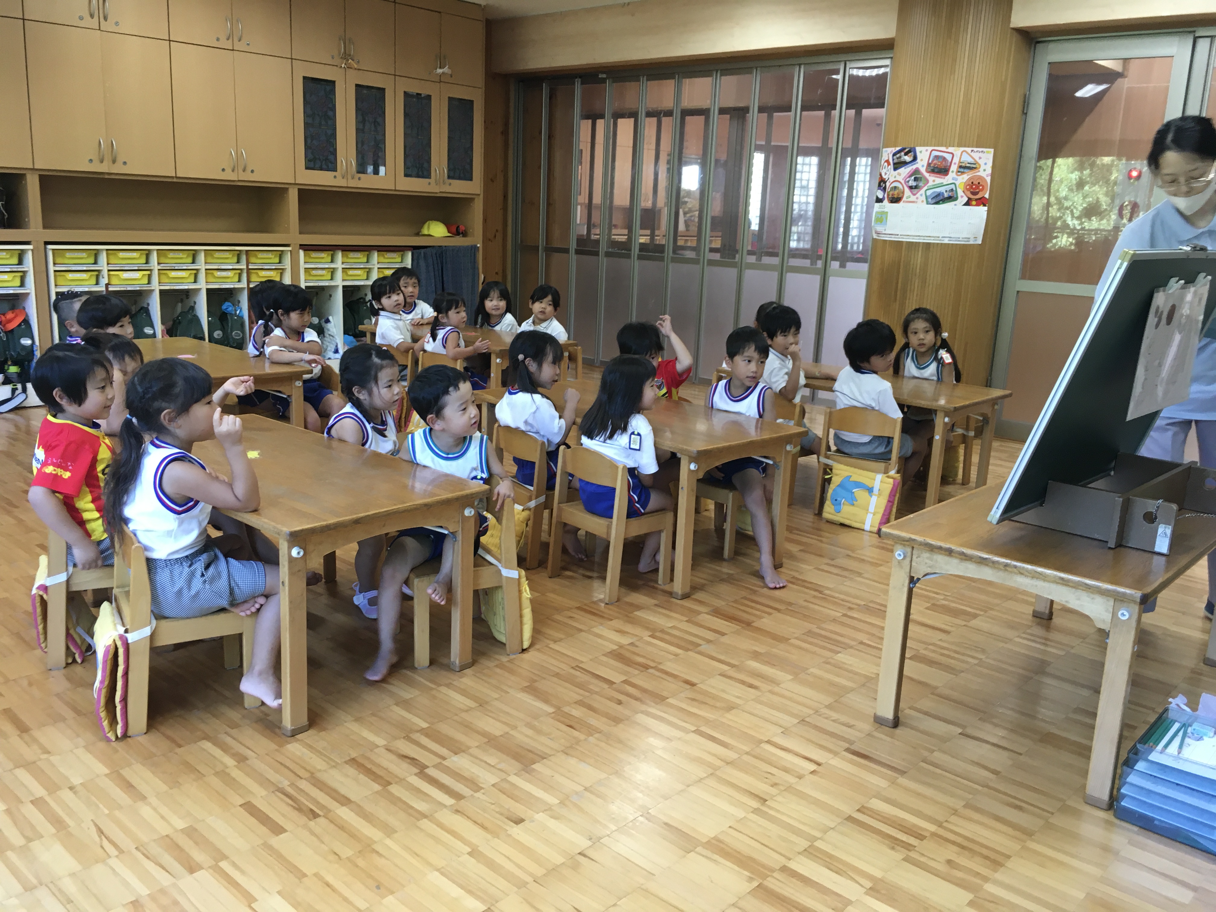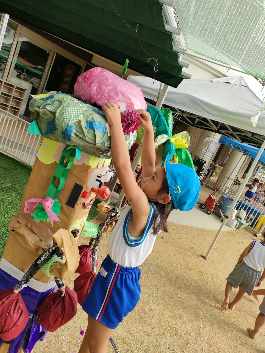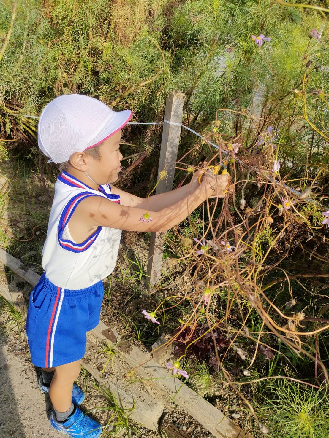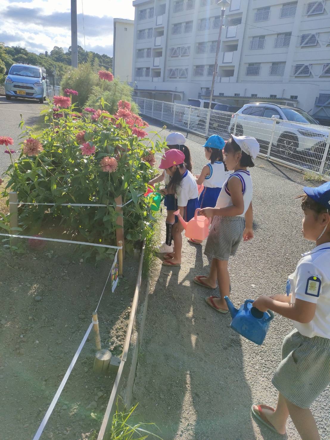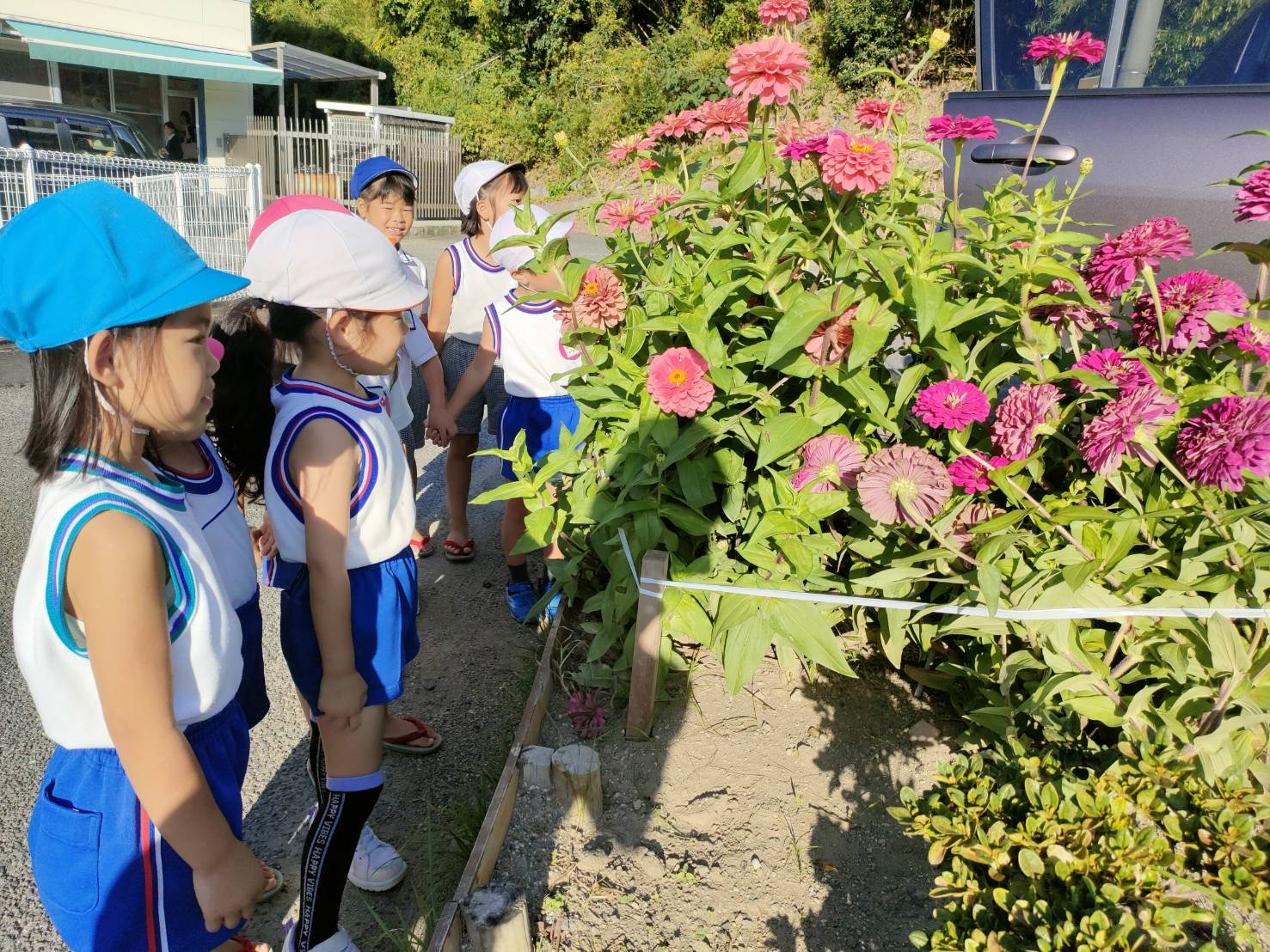 昨日のこと古森先生が駐車場に咲いていた百日草の花を摘んできて、運動会の退場門、さくらんぼちゃん?!に持たせてくれました。そこで、今日は久しぶりに駐車場の花壇の様子を見に行くことにしました。早速行くと、一番に出迎えてくれた百日草は、濃桃色や薄桃色の鮮やかな色をしていて、お日様に当たってより一層色鮮やかに輝いて見えました。花を見た子ども達は「きれーい!!」「結婚式のお花みたい♪」「いいにおいがする〜♪」と、あまり見たことのない百日草の花を興味深く、色々な角度から観察していました。その隣には、1学期に年中組のみんなで植えかえをしたコスモスが咲いていました。植えかえた頃は、手の平にのるくらいの小さな苗でしたが、今では大人でも見上げるほど背丈が伸びていました。ところが大きく生長はしているのに花はほんの2、3本しかついていません。なんでかなー?と分からないことは古森先生に聞こう!と急いで聞きに行きました。すると、その原因は栄養不足で背丈だけがぐんぐん伸びたのかもと教えてくれました。コスモスが満開に咲いていないのは残念でしたが、それを聞いたTちゃんは「雑草抜きした方がいいよね?」とみんなに声をかけて、水やりと雑草抜きの世話した後2、3本だけ花を摘んで帰りました。その花をさくらんぼちゃんの頭や胸元に飾っておしゃれすると「可愛い〜♪」と満足そうにしていました。朝のたった30分ほどの出来事でしたが子ども達のちょっとした発見や発言がとても可愛らしく、楽しい時間となりました。運動会の練習も大切ですが、小さな自然の変化や発見も見過ごさないように保育をしようと感じた一日でした。