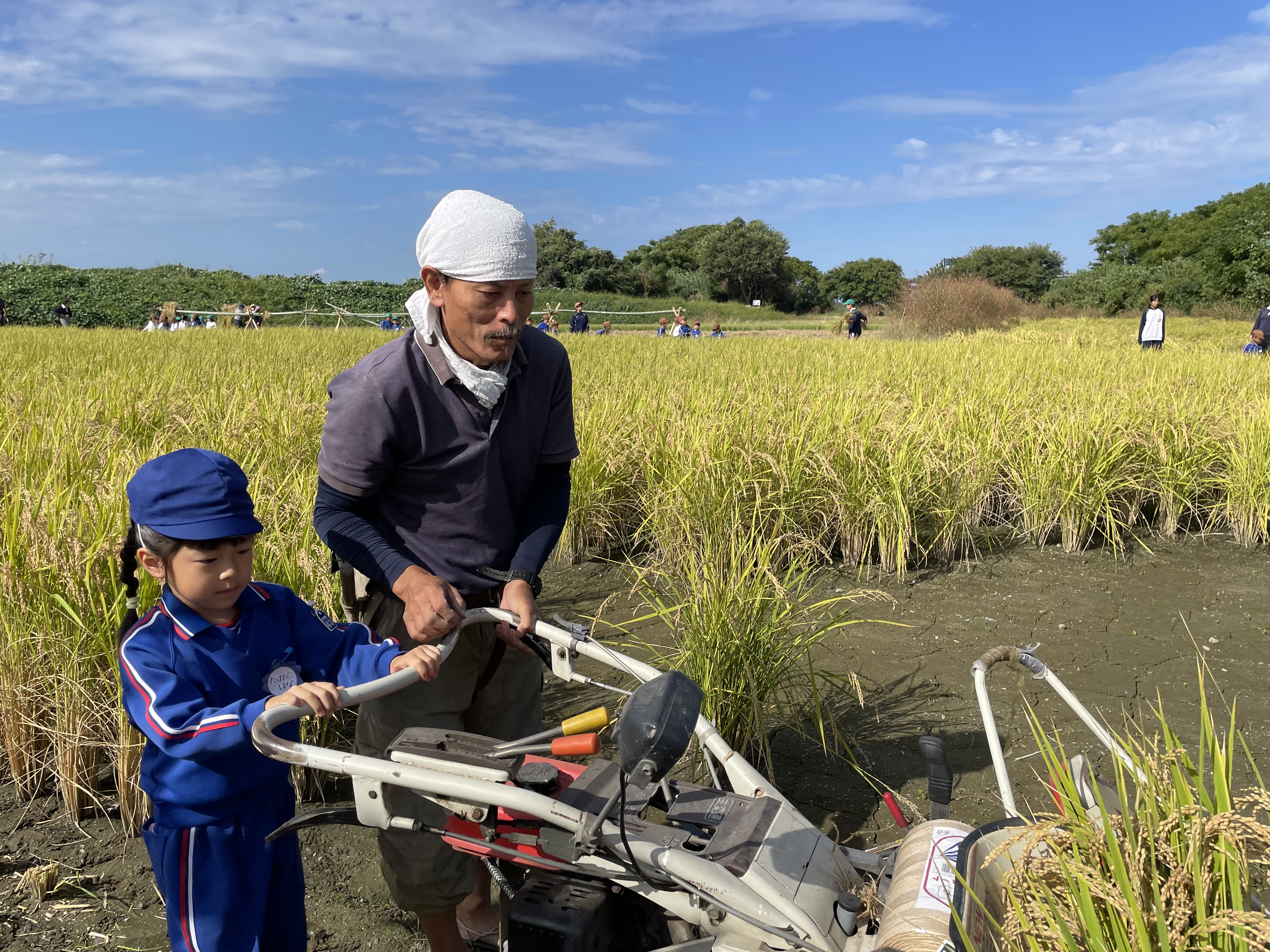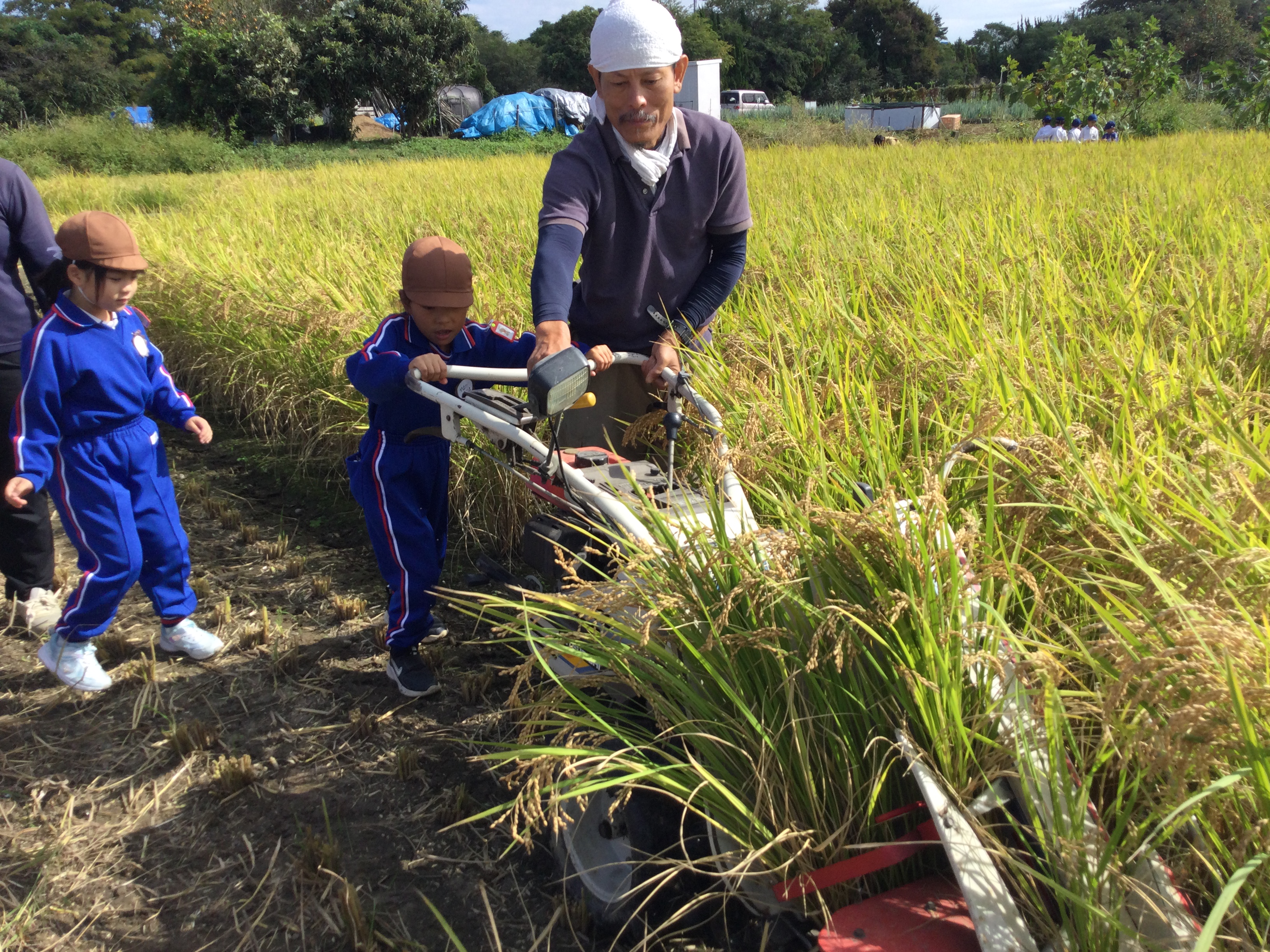今年の稲刈りは学さんの稲刈り機を使ってスタートです。子ども達が学さんと一緒に稲刈り機を押すとガタガタガタガタ…と数株進むとガタン!と稲が束になって出てきます。きりん組のYくんはその仕組みがどうなっているのだろうと不思議そうに身体を傾けて覗き込んでいました。稲刈り機が進んでいくにつれて子どもたちは要領をつかんだようで束になった稲をぱっと受け取る子、そのタイミングで次の人に変われるようぞろぞろと稲刈り機の後ろを付いて歩く子どもたちがとてもかわいかったです。稲刈り機がぐるっと一周回るまでに待ち時間があった子たちを見て古森先生が「みんな鎌で刈ってみる?」と声をかけてくれました。なんでも好奇心旺盛な子どもたちは「やってみた~い」と二つ返事でぴょんぴょん飛び跳ねていました。やってみたいと言ったものの初めての鎌を手にするとちょっぴり緊張したような様子でした。足を開いて、左手を逆手にして稲を持って右手でぎこぎこ鎌を動かすよと教えると「か…固い!」一本だと弱い稲も数十本集まるとすごい固さです。昔の人は大変だったんだなぁとしみじみ感じる体験でした。