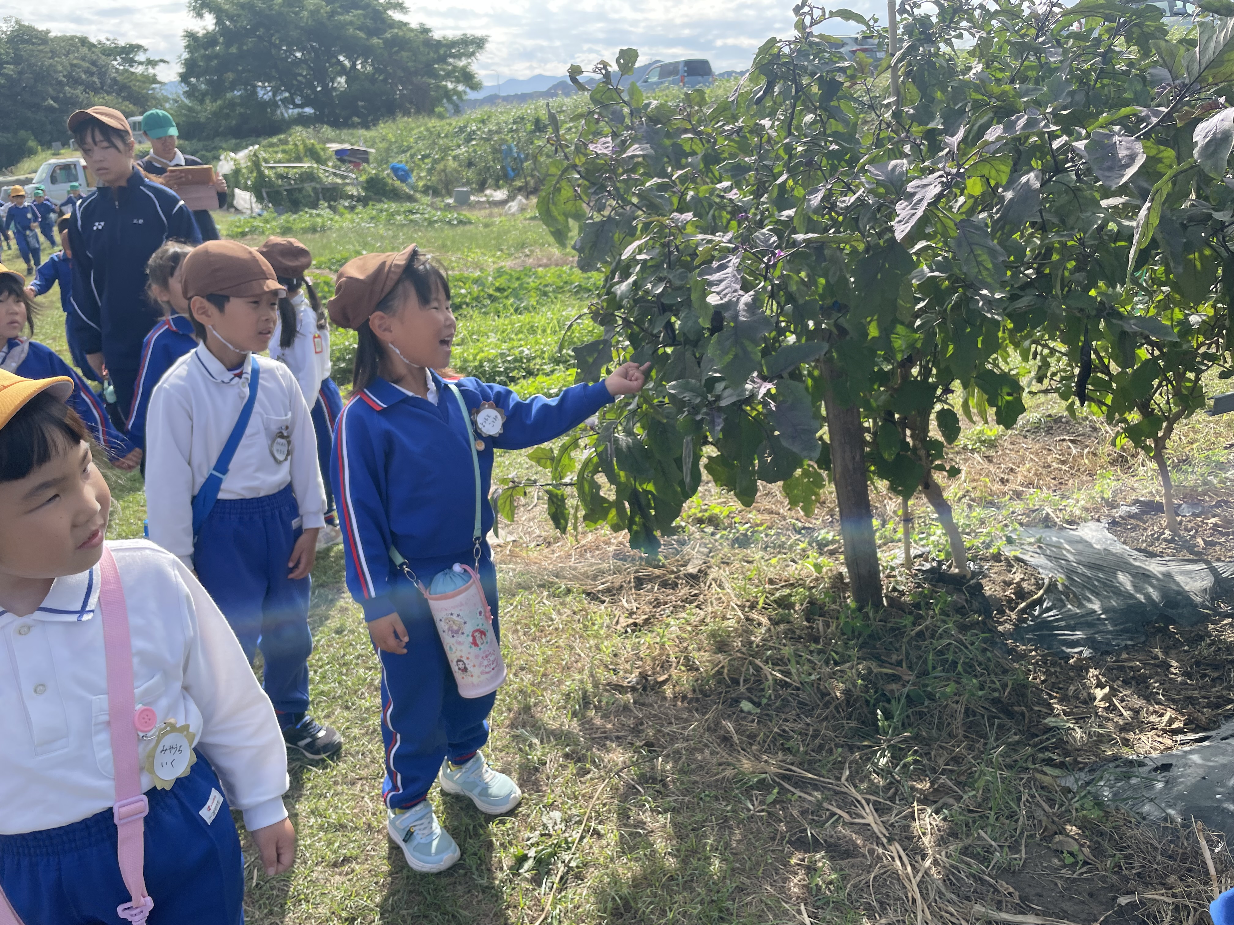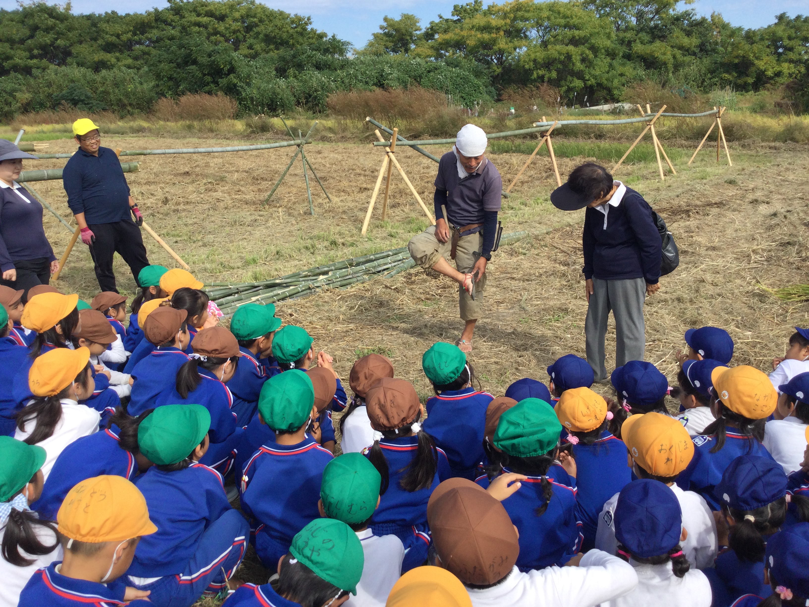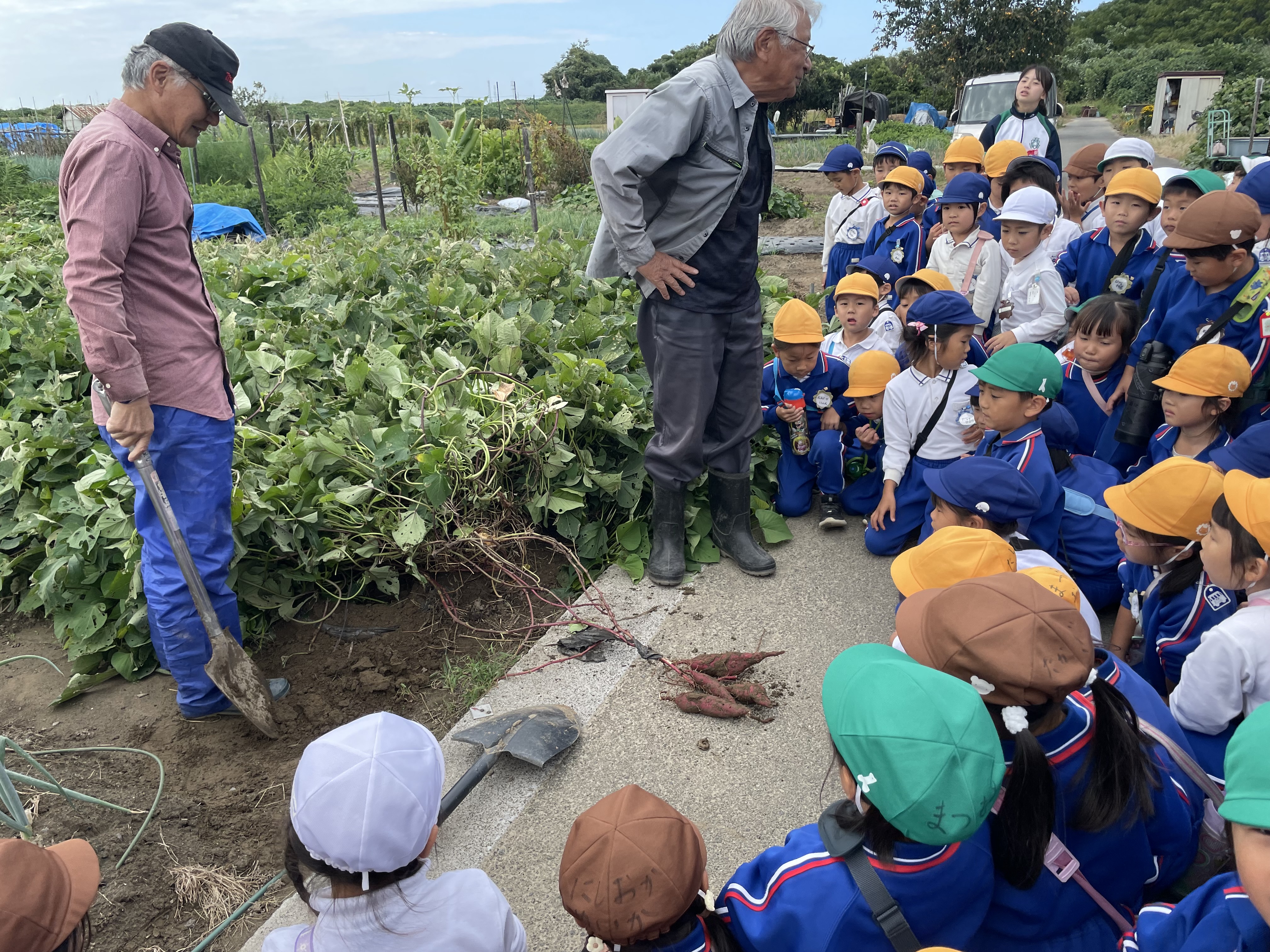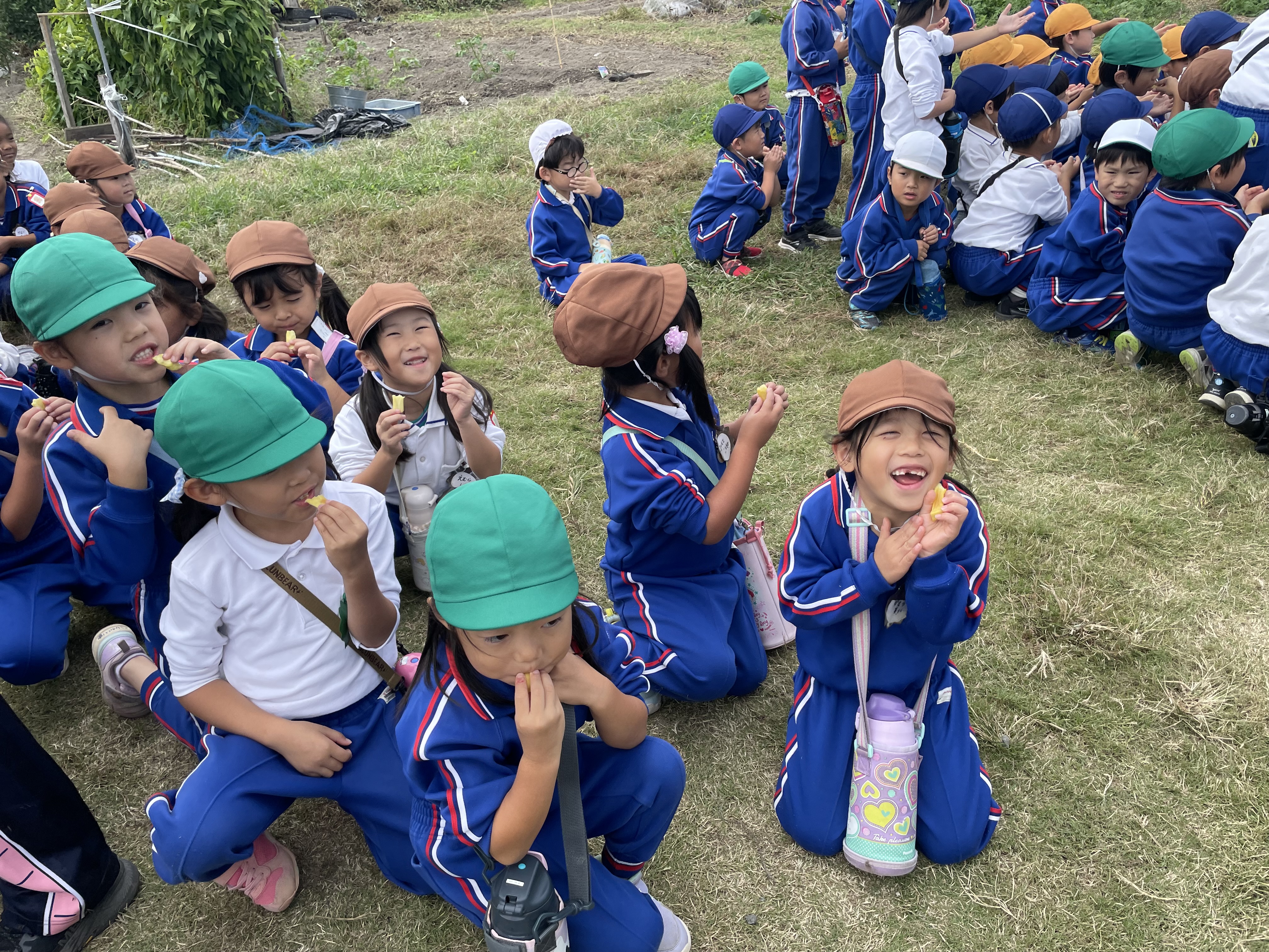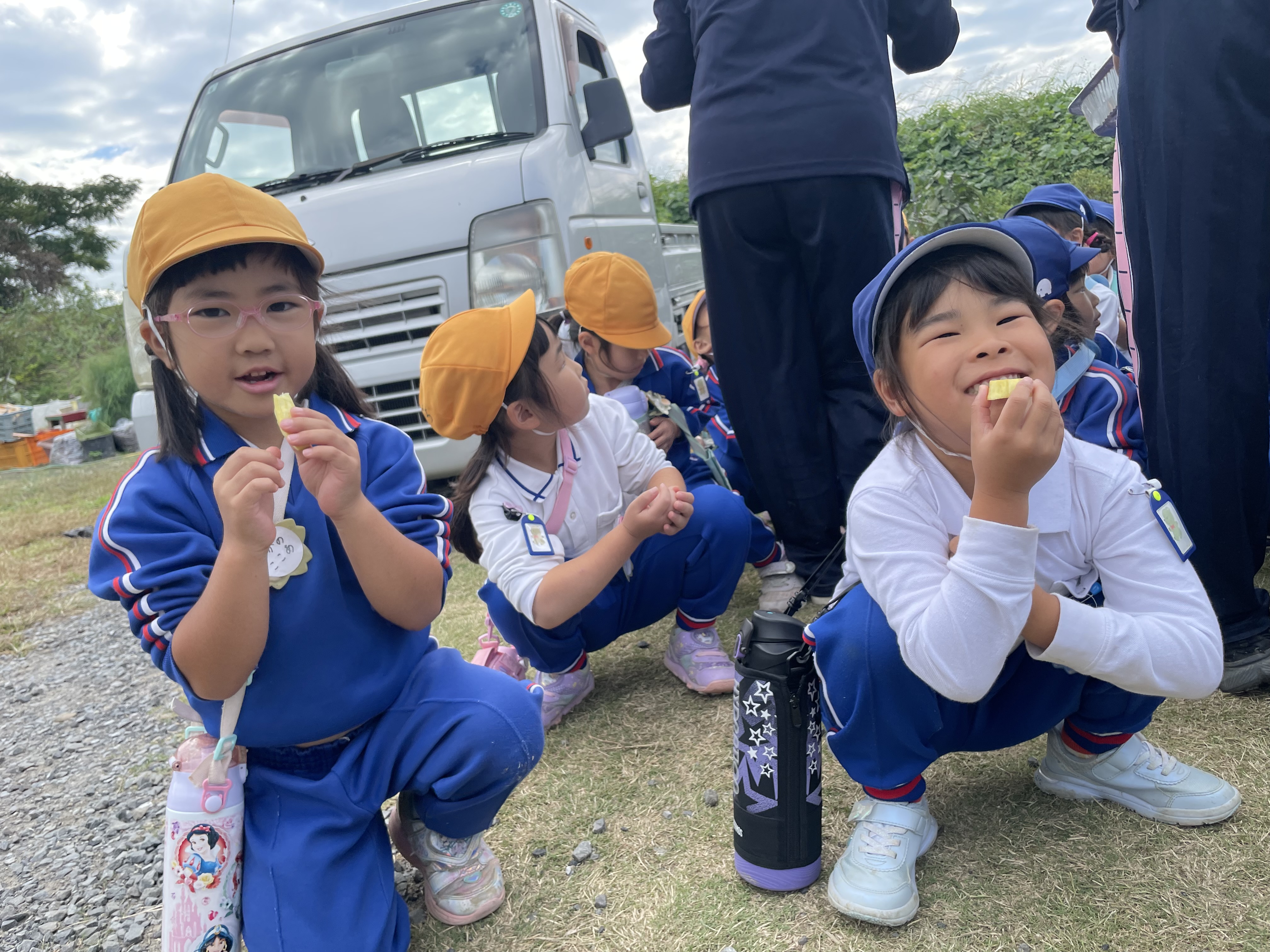 みんなが稲刈り機も鎌も経験できたので学さんにお礼を伝えて畑の方に戻りました。するとレインボーファームのおじちゃんとおばちゃんが「稲刈りできたかな?お疲れ様!」と笑顔で待ち構えてくれていました。おじちゃんが「じゃあみんな手を洗ってくる?」と、にこっと笑いました。その笑顔に勘の鋭い子どもたちが「ん?手を洗う?手を洗うってことは…?」とニヤニヤわくわくし始めました。すると「おばちゃんがね、いいもの作って待ってくれてるから!」とおじちゃんが一言!「やった~!!」とあっという間に集合できました。おばちゃんが二種類の真っ黄色のお芋を用意してくれていました。「紅はるか」というお芋を一つは素揚げしてお塩をまぶした物、もう一つは素揚げしたお芋に砂糖蜜(お鍋にお砂糖とお水を入れてとろっとするまで煮詰めて作るそうです)をかけた物です。恒例の?先生たちのお味見タイムでやきもきする子ども達。年長児にもなるとぷんぷん怒って私たちに「ずるい!早く食べさせて!そんなに大人ばっかり食べたら子どものがなくなっちゃうでしょ!!!!」と口々に言っていました。その怒る顔もかわいくてついついからかってしまう悪い教師たちです(笑い)一生懸命稲刈りをしてちょうどお腹がすいてきた子ども達。おやつは格別のお味です。一口食べるとぱあっと“おいしい顔”になっていました。Eちゃんはぱくんと口に入れると手を口元にぱっと持っていき隣にいたOちゃんとまん丸の目を見合わせてうんうん!と頷いていました。何も言わない二人でしたが「おいしい!」と聞こえてくるような二人が微笑ましかったです。おやつでも食べたいな~なんて話す子どもたちでしたが調理師さんへのお土産分も全部食べてしまいました。その姿を見てレインボーファームのおじちゃんおばちゃんはとても嬉しそうでした。