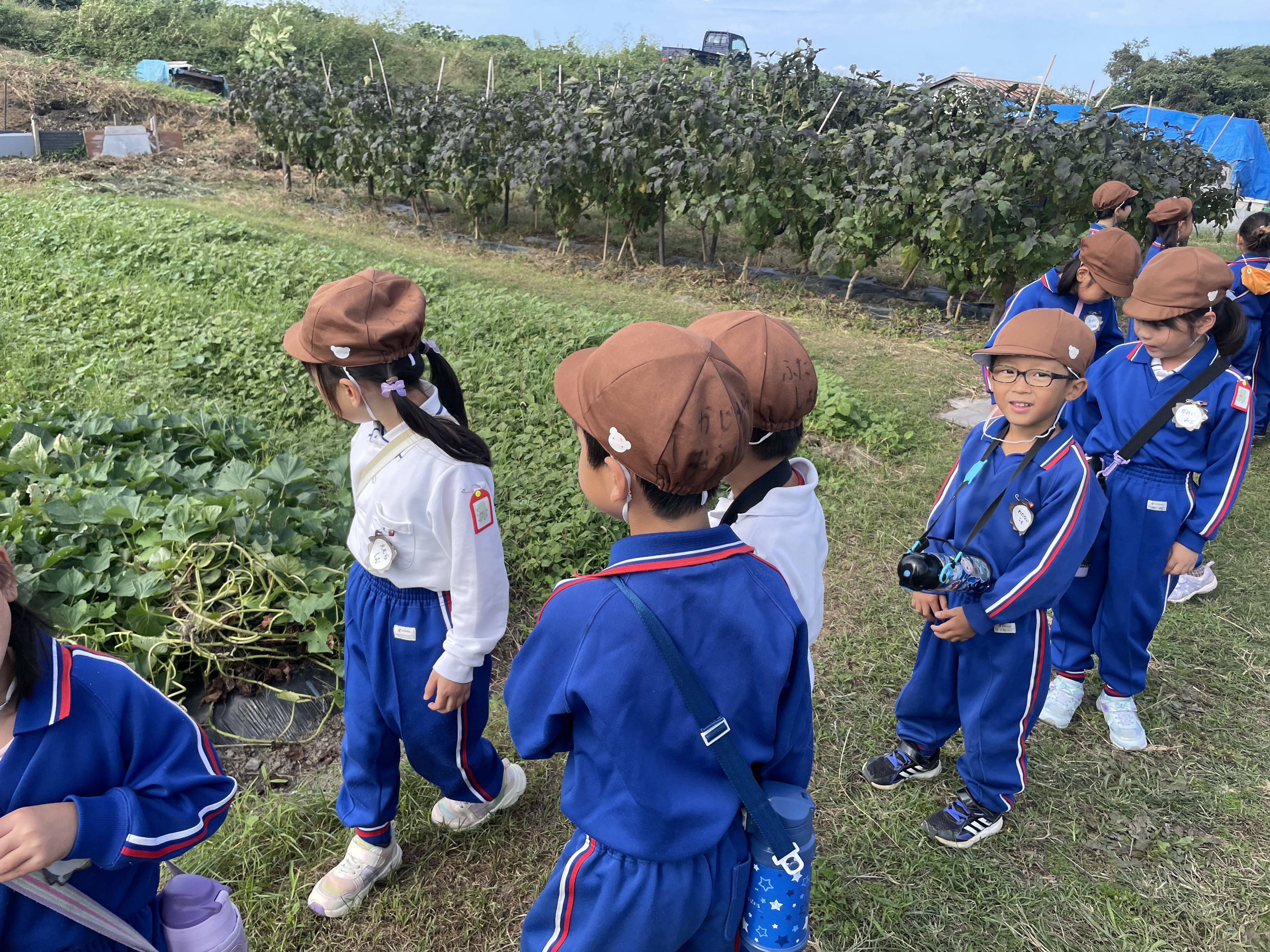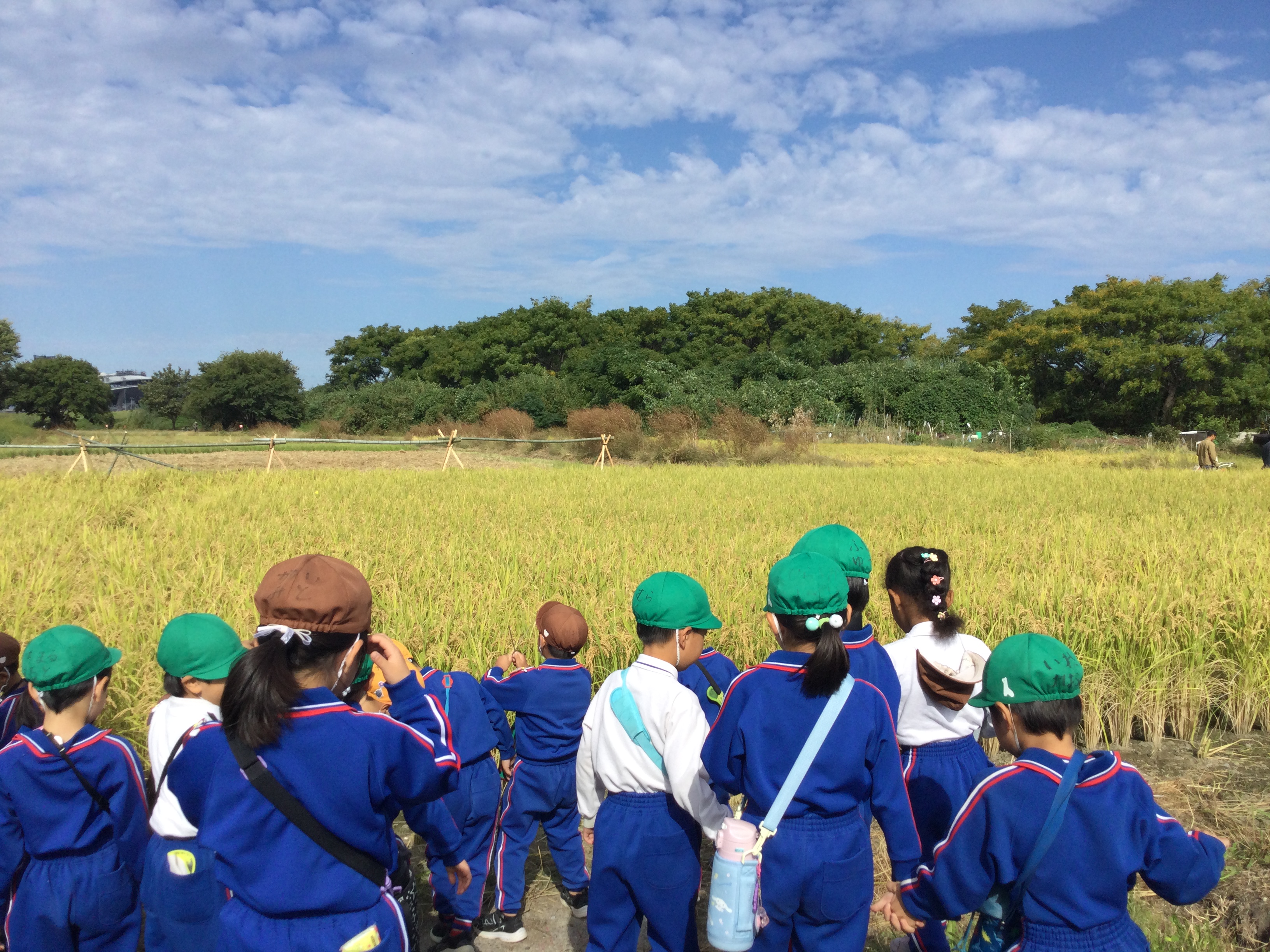 レインボーファームを通り抜けると学さんの田んぼがあります。レインボーファームの畑にはたくさんの野菜が育っています。「先生これ何かなぁ?」「これ白菜?」みんなが自分の知っている野菜の名前をいくつもあげていました。田んぼに近づくと一面黄金色の稲穂がぺこりとおじぎをしているようにさらさら揺れていて子どもたちは大喜び!「すっげ~!!」「なんかお米がいっぱいになってる~!!」…園内で育てた稲よりも一株の本数も、一本に実るお米の粒の数も格段に多い学さんの田んぼ!澄んだ青空と、さわやかな風とたくさんのお米、とても気持ちの良い場所でした。