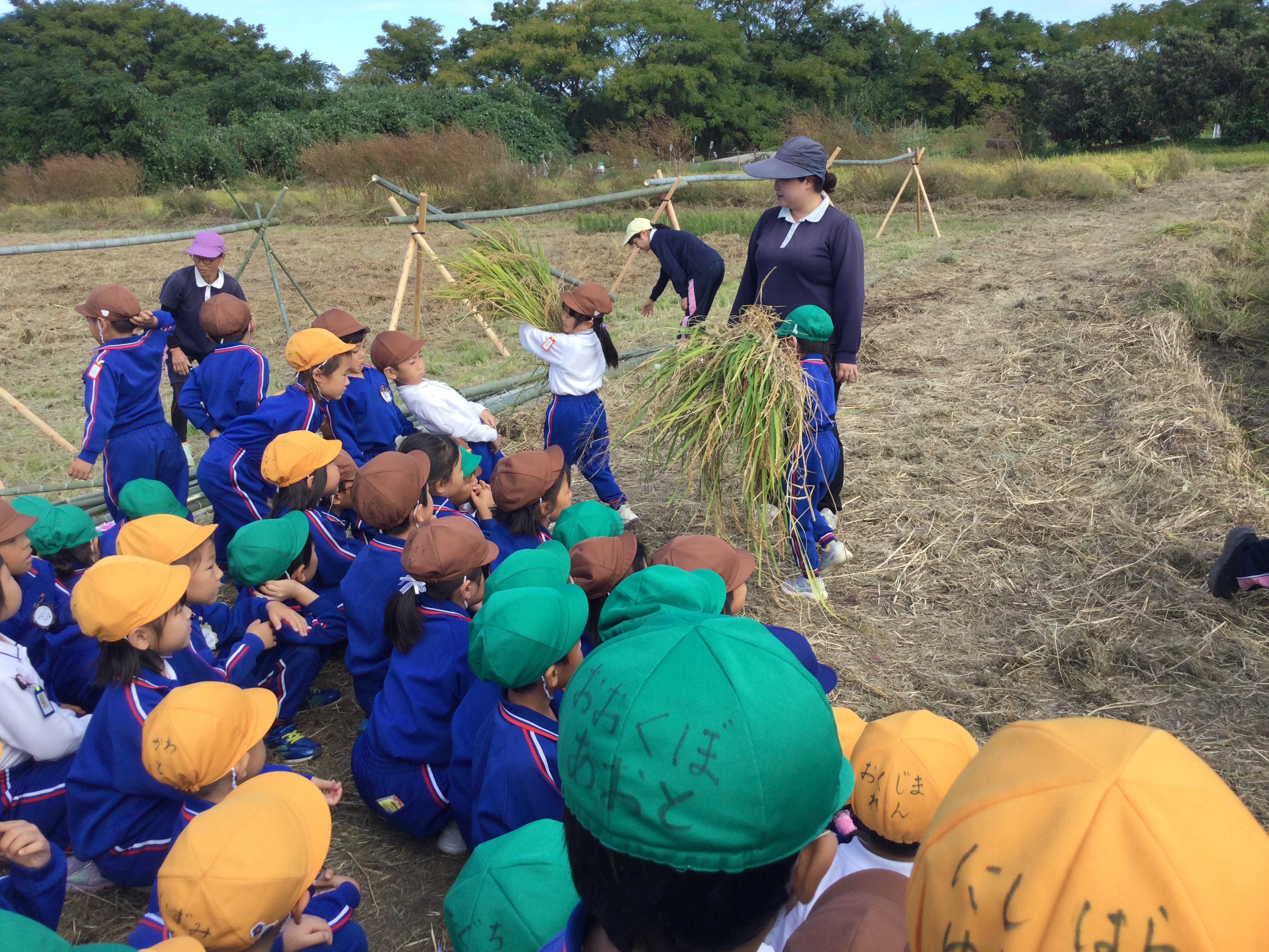 22日水曜日の予定だった稲刈り。残念ながら雨が降って延期になりました。子ども達と「金曜日は晴れるかな?稲刈り行けるかな?」とわくわくしながら今日を楽しみにしていました。バスに乗って出発しようとすると恒例の年中さんや年少さん、たんぽぽさんたちがみんなでお見送りをしてくれました。小さい子たちはどこまでわかっているのか「いってらっしゃ~い、よろしくね~!!」と声をかけてくれます。一緒に見送ってくれている先生たちの方が「ほら!年長さんはみんなのおもちになるもち米を収穫しに行ってくれるのよ。お願いしますって言わなくっちゃね!!」と言いながら張り切ってお見送りしてくれていたように感じました。食べるの大好き三葉っ子?たちです。
