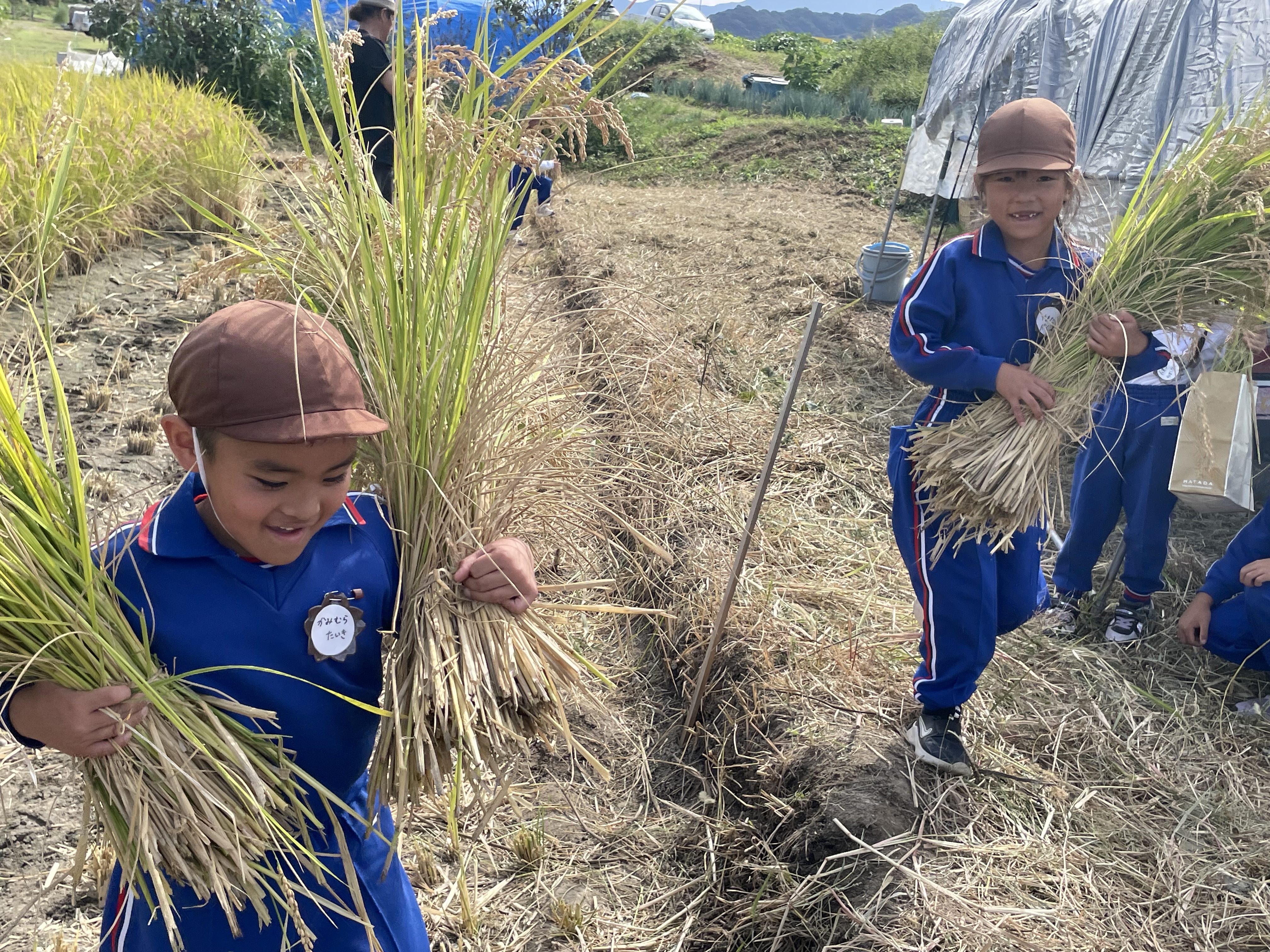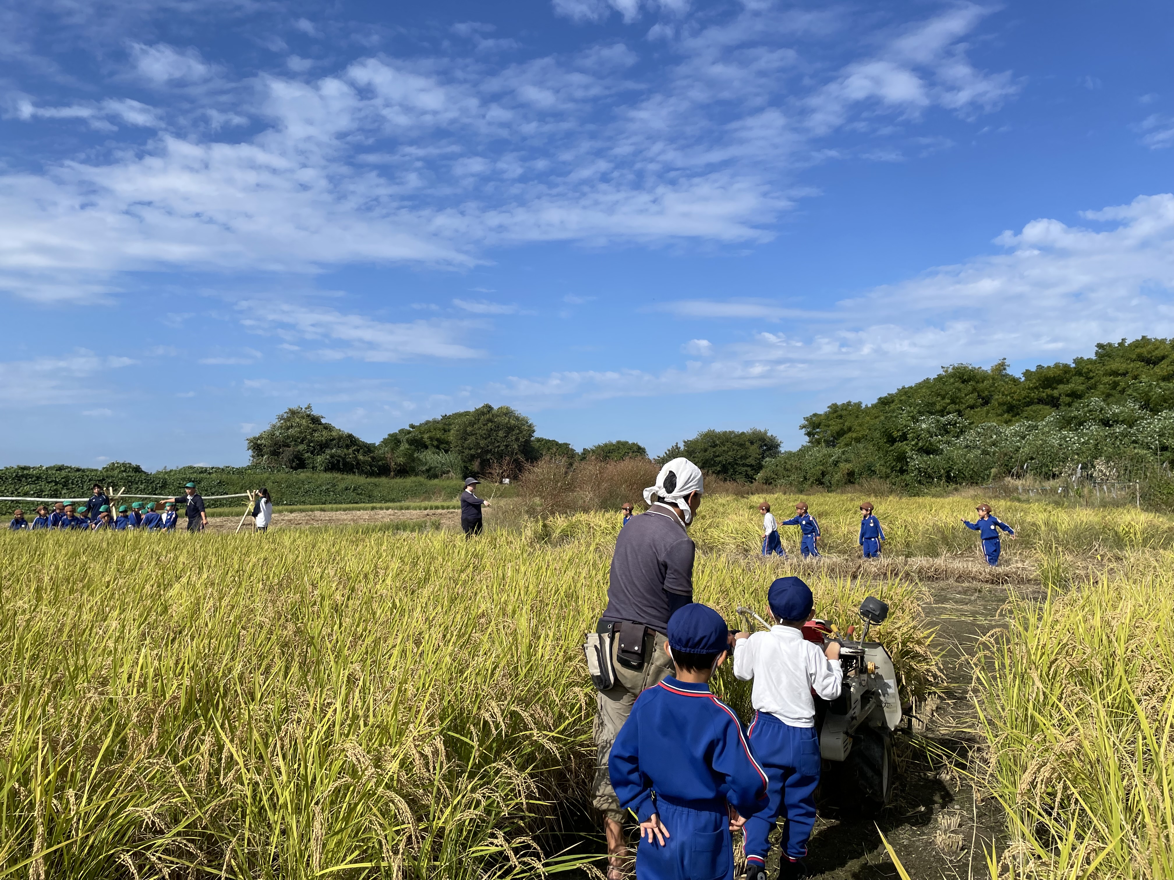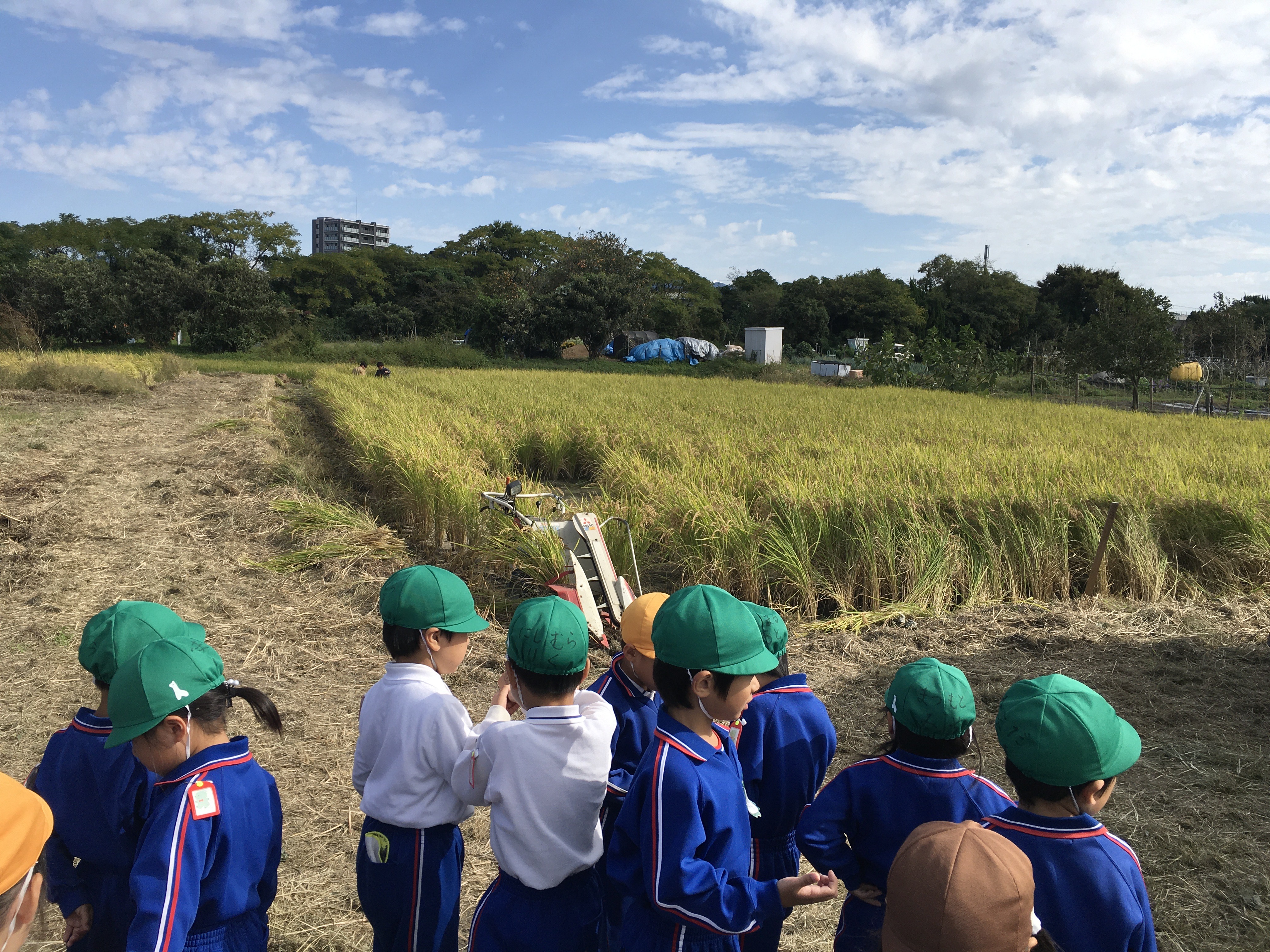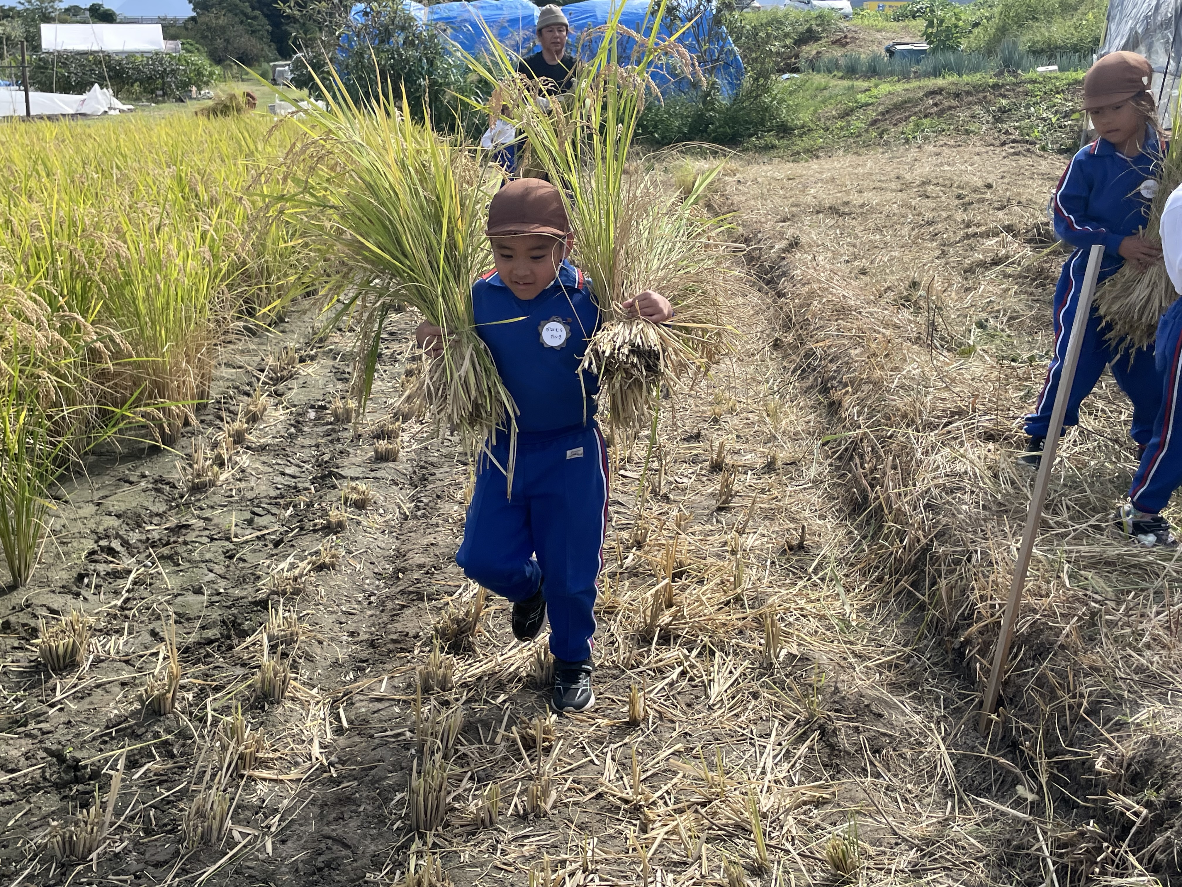 6月に年長児の手で植えたもち米がどれくらい大きくなっているか行きのバスの中でも楽しそうに話していました。いつも幼稚園で食べているお米を作ってくれている学さんが暑い夏の間ずっと世話をしてくれていたと知り、自分たちもペットボトルや桶で育てたお米がすずめに食べられたりお水がすぐに乾いてしまったりと大変だったことを思い出してお米を育てる苦労を感じる姿がありました。そして「お米は一粒も落とさないくらい大切に、落穂も絶対踏まない!」と決意を固めてバスを降りました。