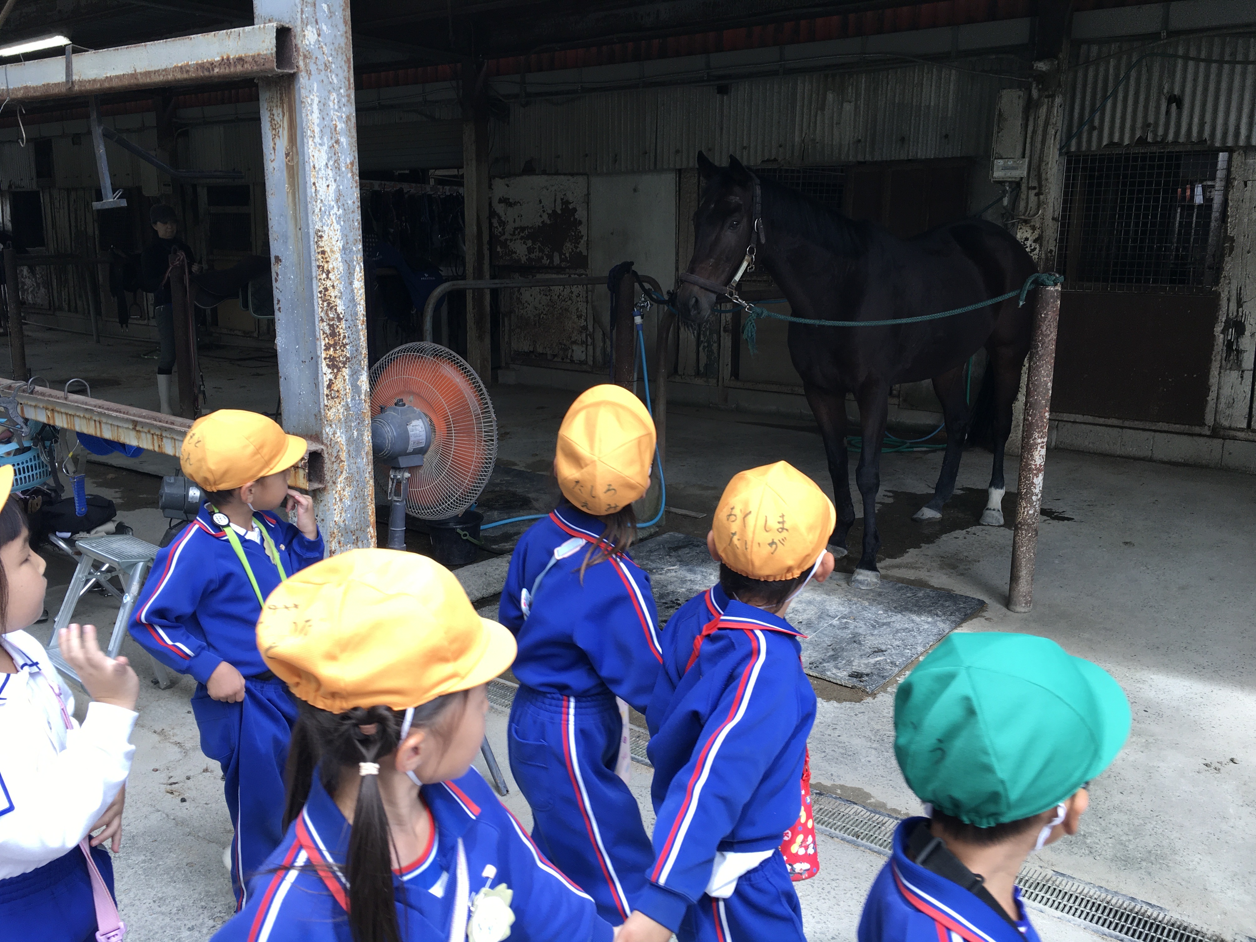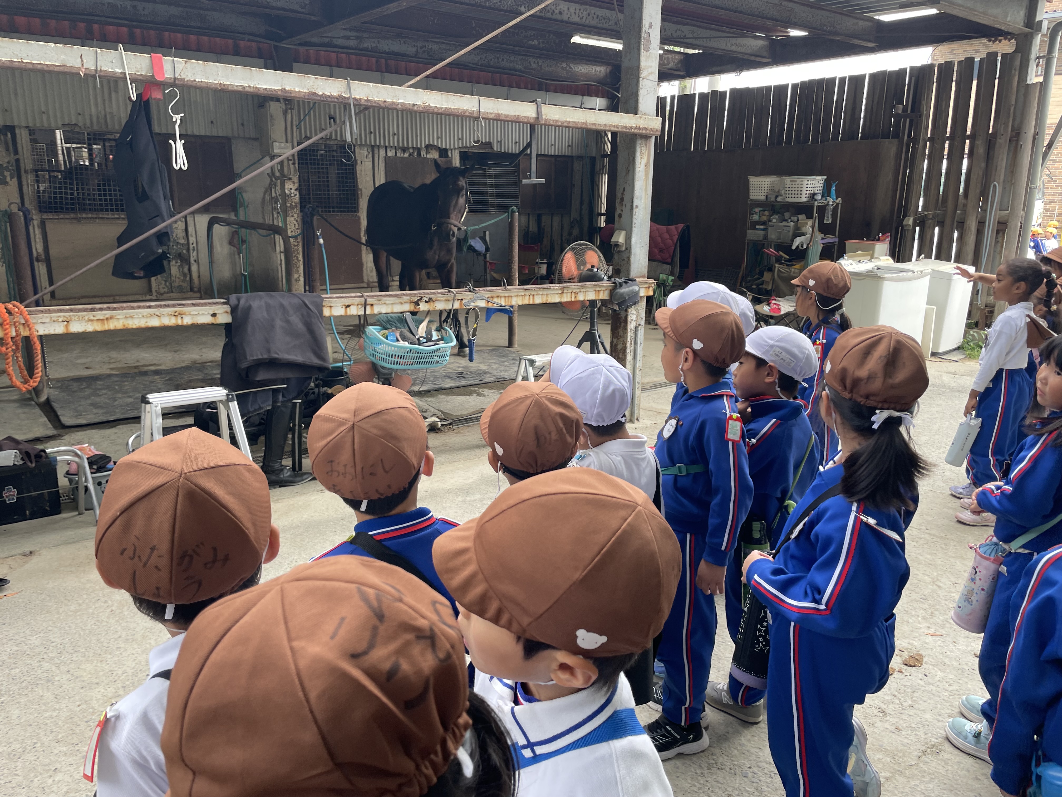 おやつを頂いた子どもたちとさつま芋畑の様子を見に行きました。おじちゃんが試しに一つ!とお芋を掘って見せてくれました。大きな紫色のお芋を見て来週月曜日のお芋掘りが更に楽しみになりました。そしてその後通りかかった乗馬センターのお馬さんを少し見せてもらいました。なぜかお馬さんと通じ合い、ぺこぺことおじぎし合う三葉っ子たちに笑いが止まりませんでした。いろんな経験ができた今日の稲刈り。来週月曜日はさつま芋掘り!いっぱい掘るぞ~!!また楽しみです♪