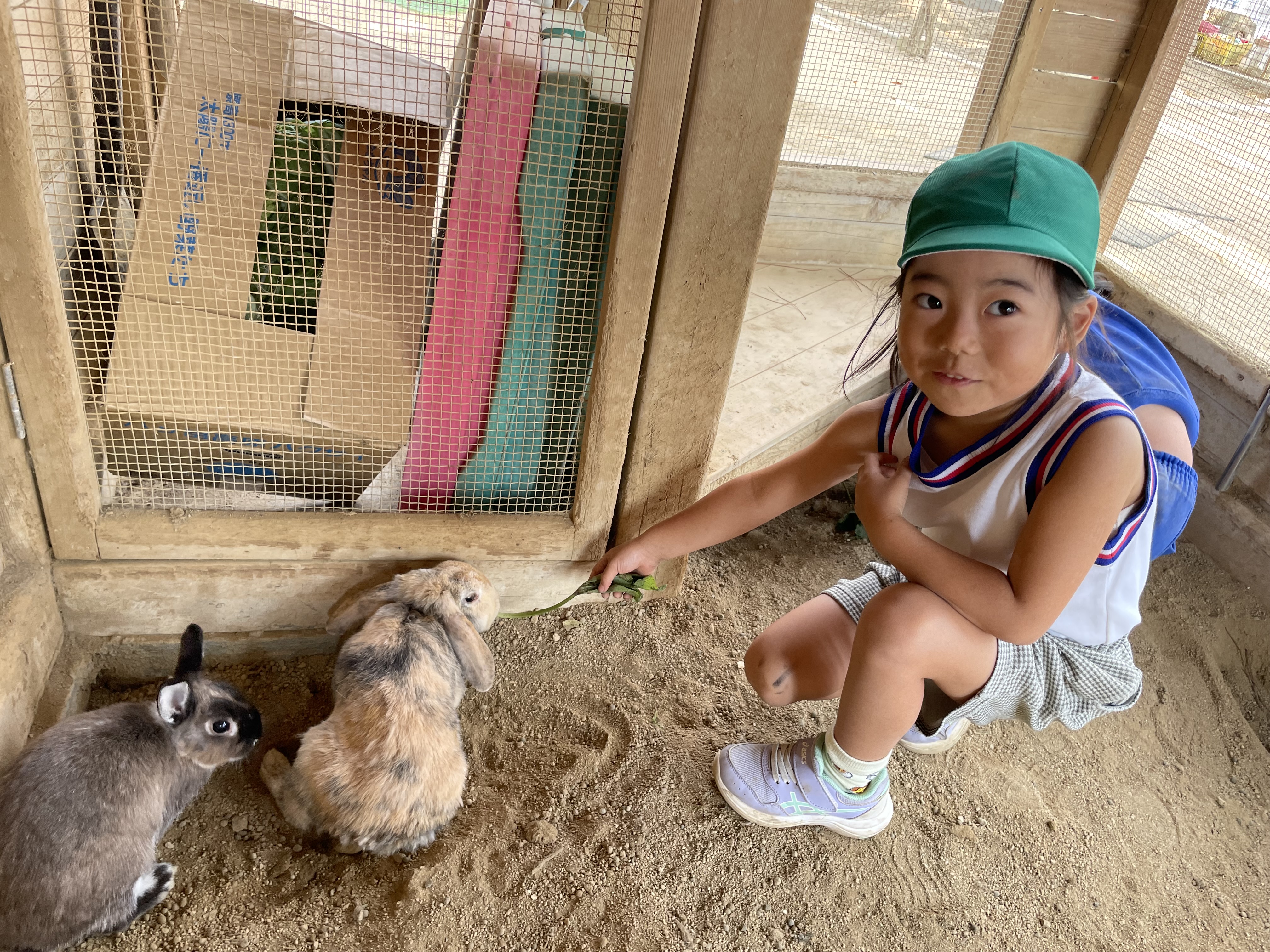 幼稚園に帰ってからはお芋を乾かしたり、明日もつるで遊べるように片付けたりしました。うさぎさんはお芋のつるが好きなんだよと古森先生に教わり、1本うさぎ小屋に持っていきました。おいしそうに食べるうさぎに大喜びの子ども達。Iちゃんが「お腹すいてたんかなぁ?」とつぶやくときりん組のMちゃんは「違うよ、このお芋のつるがおいしいから食べてるんよ」と言いました。自分たちが植えて収穫したものが特別だと思っているのでしょう。その言葉がかわいくて、今日のお芋掘りがとても楽しかったんだろうなと思えて私はとても嬉しかったです。