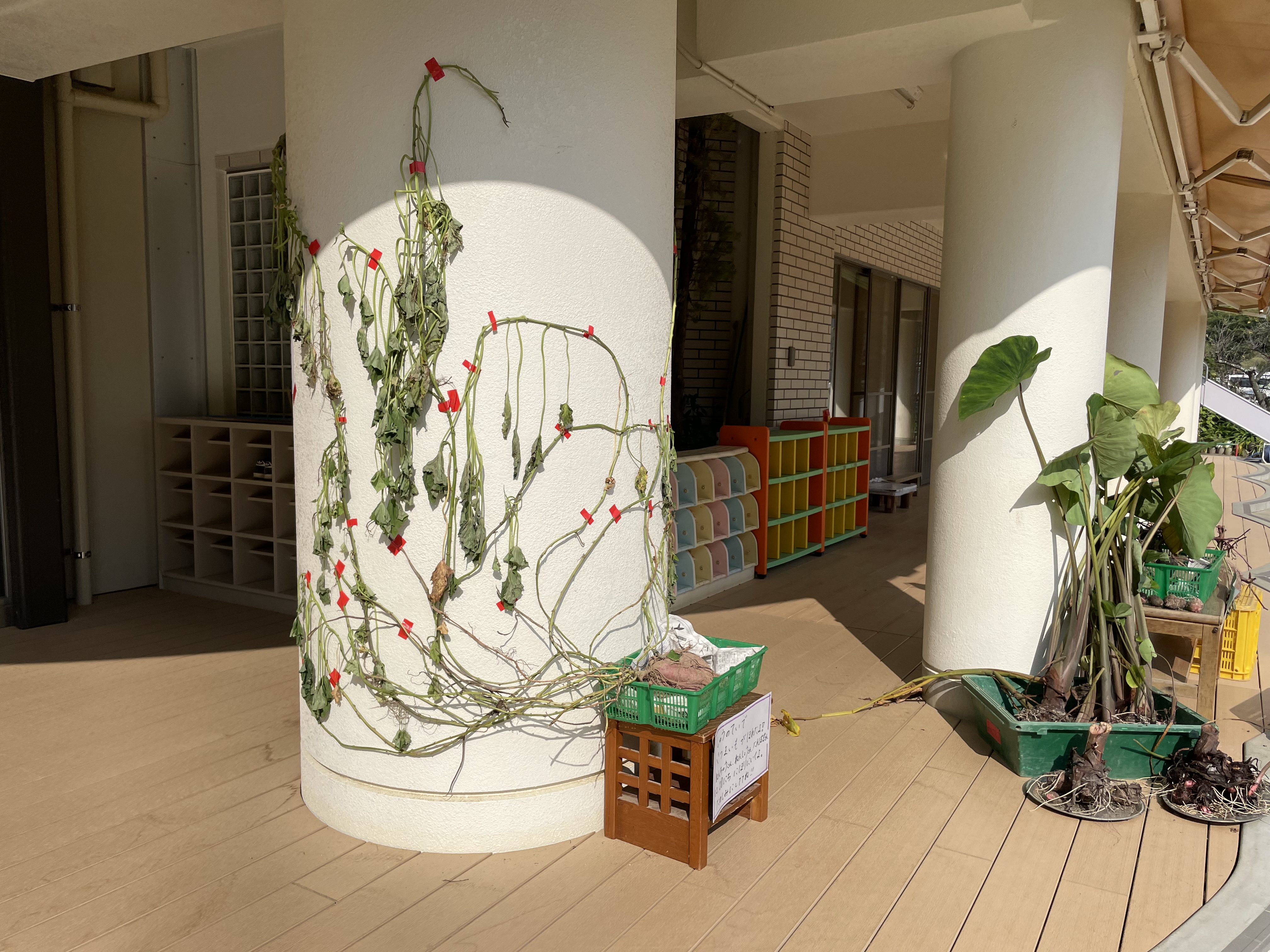 さて、そんなお芋掘り祭り!!の中、Tくんは畑の隅で何やら楽しそうにつるで遊んでいました。「あれ?参加できていないかな?」と「Tくん」と声をかけようとすると古森先生が「先生、違うのよ。Tくんは最初にお芋を掘ってからこのつるを見つけてそれから夢中なのよ」と教えてくれました。恐竜や生き物が大好きなTくんは一本の太いつるからたくさん細いつるが伸びているこの形が面白くていろんな物に見えていたそうです。最初はドラゴン、恐竜、そして畑の横の乗馬センターでぱっかぱっかと走る馬!特に馬に見えてからが楽しくてつるにまたがりぱっかぱっかと走っては「お馬さーん!こっち向いてー!一緒だよー!!」と一生懸命話しかけていたそうです。そのうちA先生を後ろに乗せ(律儀に末端のつるをしっかり持ってぱっかぱっか走るA先生に笑いました)楽しそうに走っていました。「あれ?参加できていないかも」とお芋掘りに誘っていたらTくんのこの楽しい遊びは生まれなかったでしょう。子どもの興味関心によりそうことも大事だと改めて思いました。