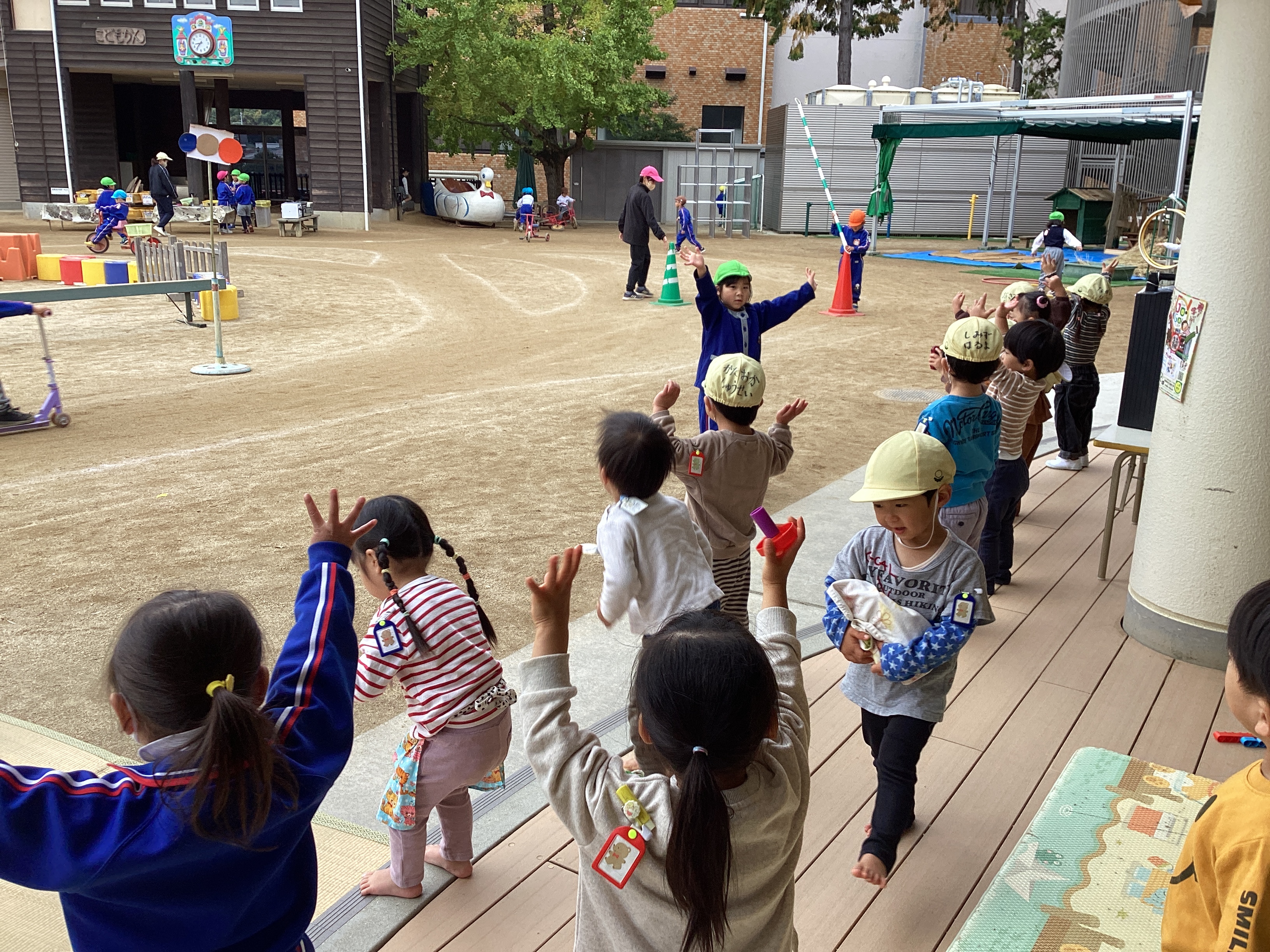 今日も登園して来た子どもたちはすぐに戸外に飛び出して元気に遊んでいました。やはり子どもたちに人気なのは、アスレッチックのコーナーの周囲に作られた三輪車用の三輪車の道路です。いろいろな学年の子どもたちが関わって遊んでいて、それぞれに役割りができています。道路の交通整理をする人、昨日からできたガソリンスタンドで給油をする人、三輪車を遅転する人…その中にしっかりプレ年少さんも混ざって遊んでいて『こどものくに』は大にぎわい!!たくましく育っている様子を見ながら教師達も楽しく見守ります。