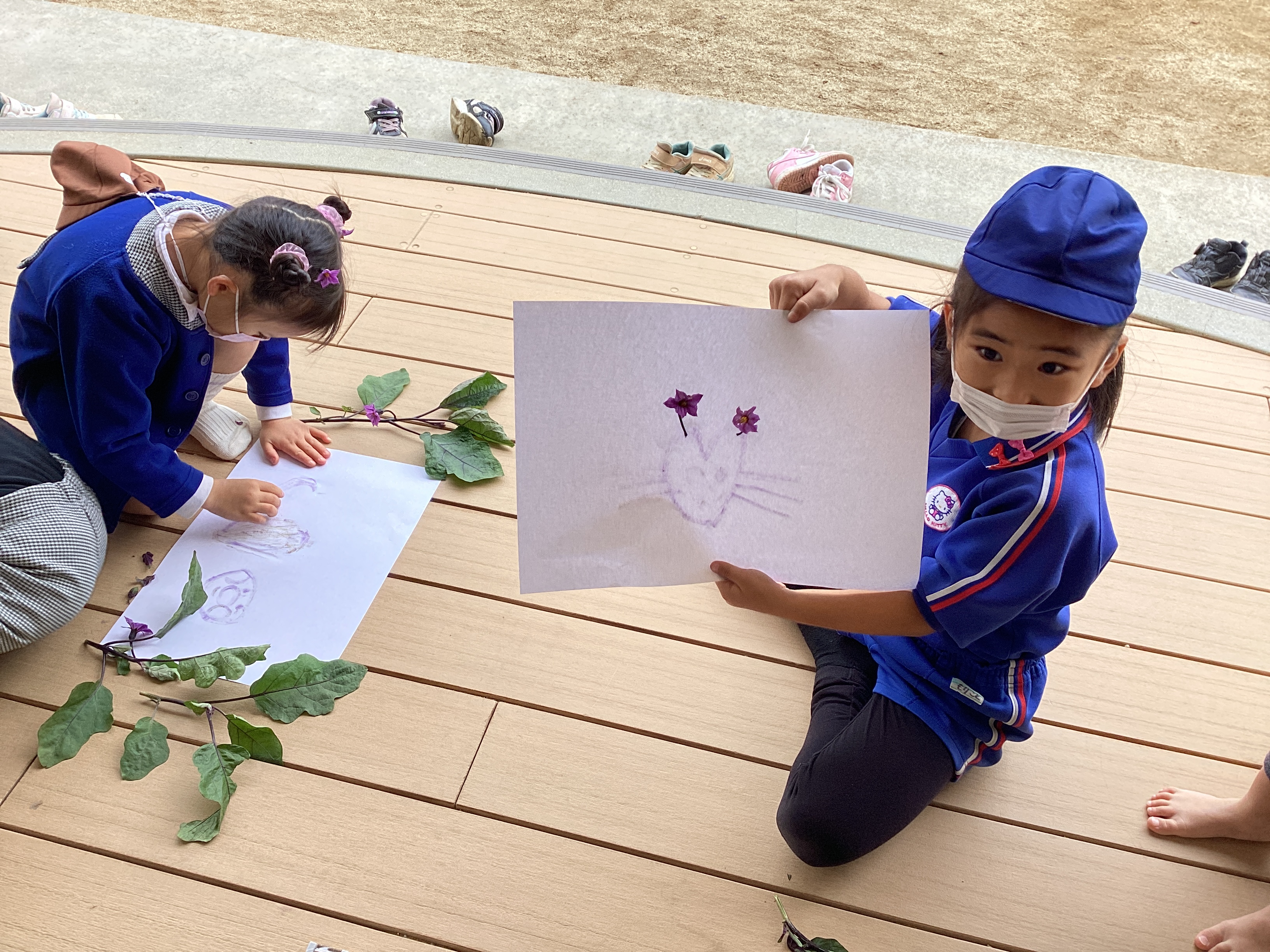 それを見た古森先生が一言、「もしかしたらお絵描きできるかもね。」楽しそう!と手伝ってくれていた子どもたちでなすの葉っぱや花を使って描いてみる事にしました。すると何と白い紙に優しい色合いの紫や緑色が浮き出てとてもかわいい絵になりました。描いた絵に葉っぱや花を飾り付けるとより一層かわいくなり、今日年長さんはなすを使ったお絵描きで盛り上がったようでした。