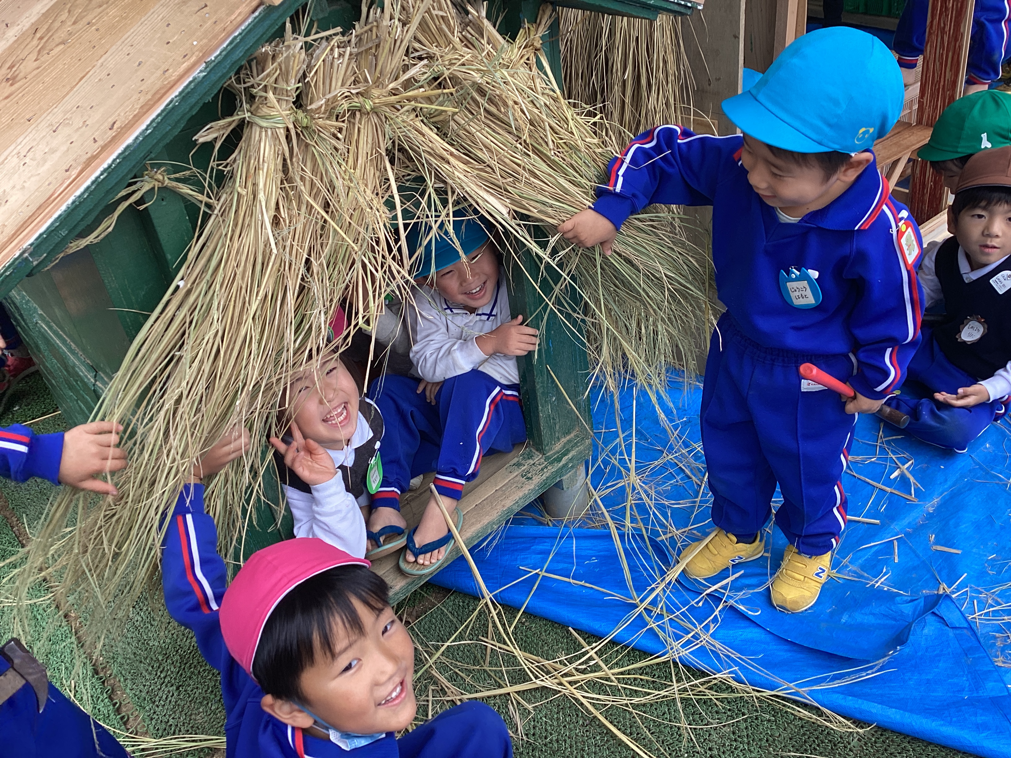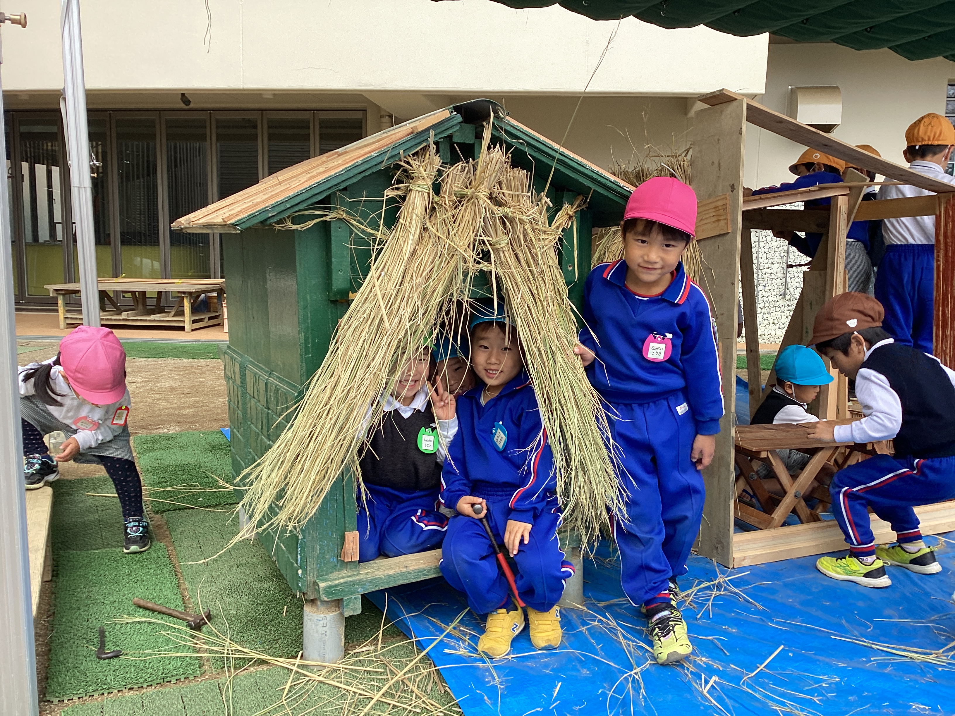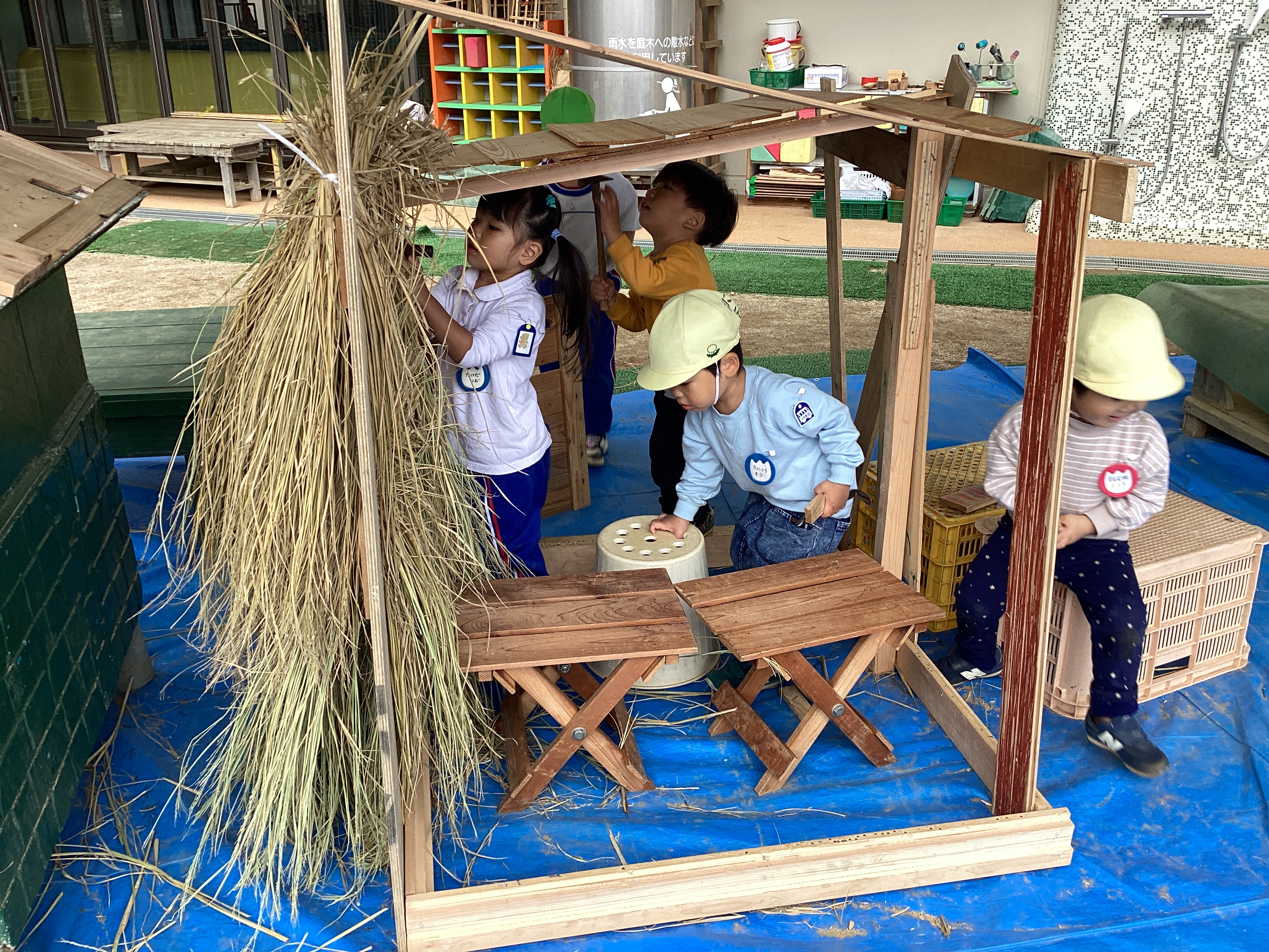 そして不工のコーナーでは昨日もらってきた藁を使ってカーテンがお家の入り口に付きました。するとそこはちょっとした隠れ家のようで、子どもたちが「バァー」と顔をのぞかせていました。それを見つけた年少、たんぽぽさんも楽しそうだなあと集まってきて入り口を「トントントン」と叩いて「いれて~」とお家の中に入っていました。その中は藁のおかげで温かく子どもたちが寄りそって入っている姿はとてもかわいらしかったです。豪が材料に加わった事で他の学年の子どもたちもお家作りに参加しやすくなったようでたんぽぽさんも一緒に見よう見真似で乾いた藁を水に浸して、木づちでトントンと叩いていました。明日はどんな風にお家が変わっていくのか楽しみです。
