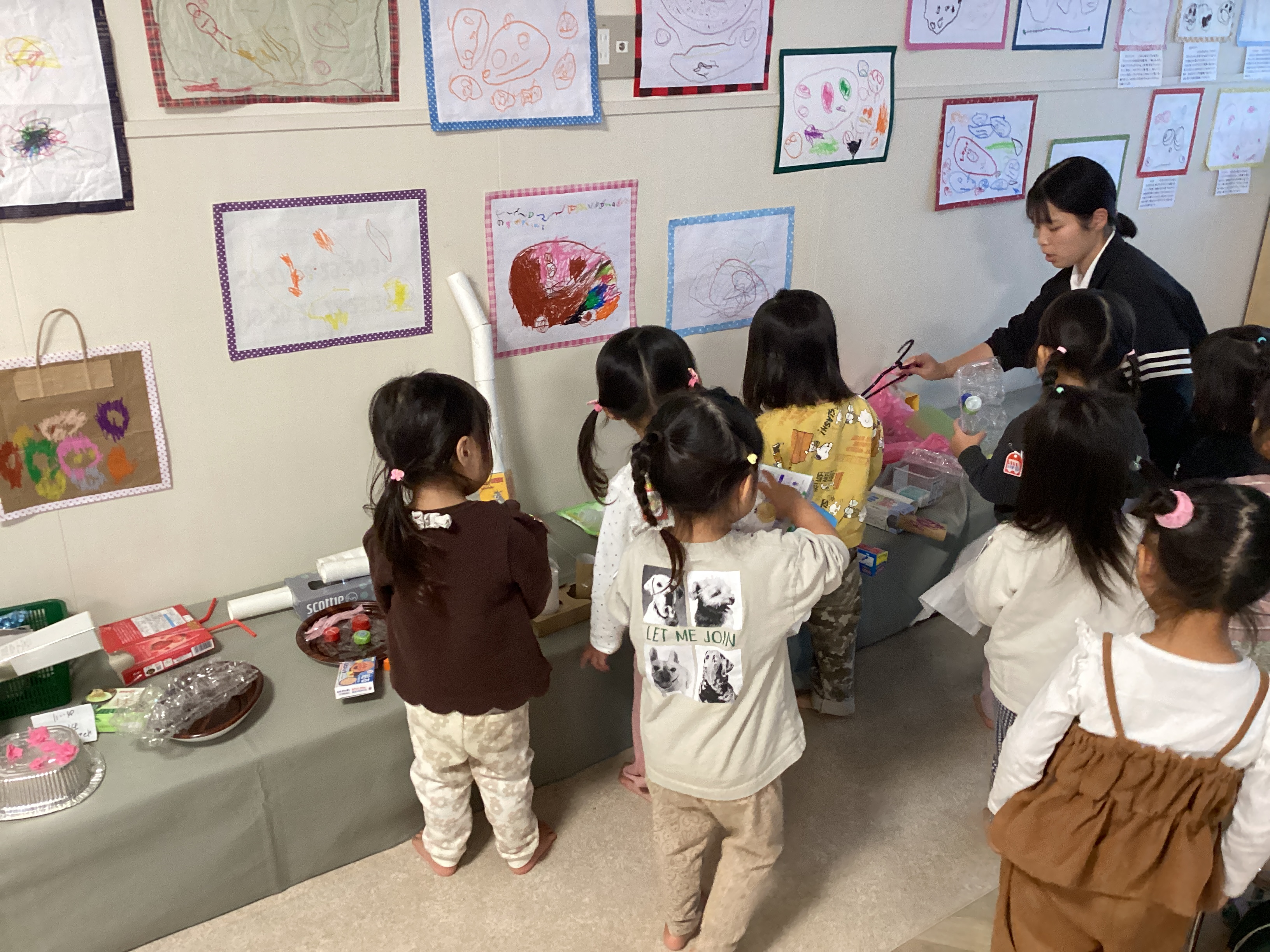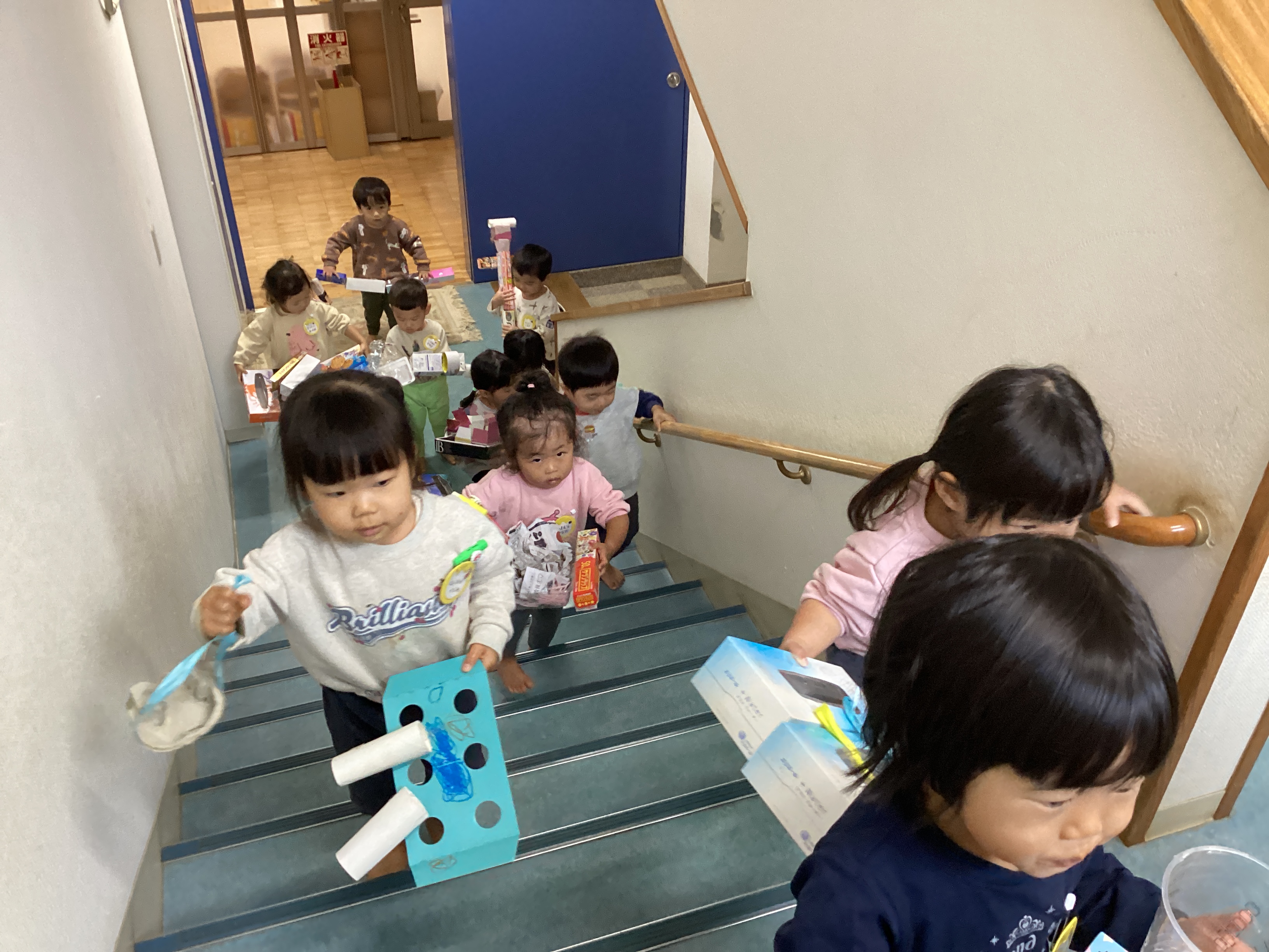 今日は自分たちの作品を展示のお部屋に運びました。「壊れないように~」と気を付けながら持っていく姿はとてもかわいかったです。