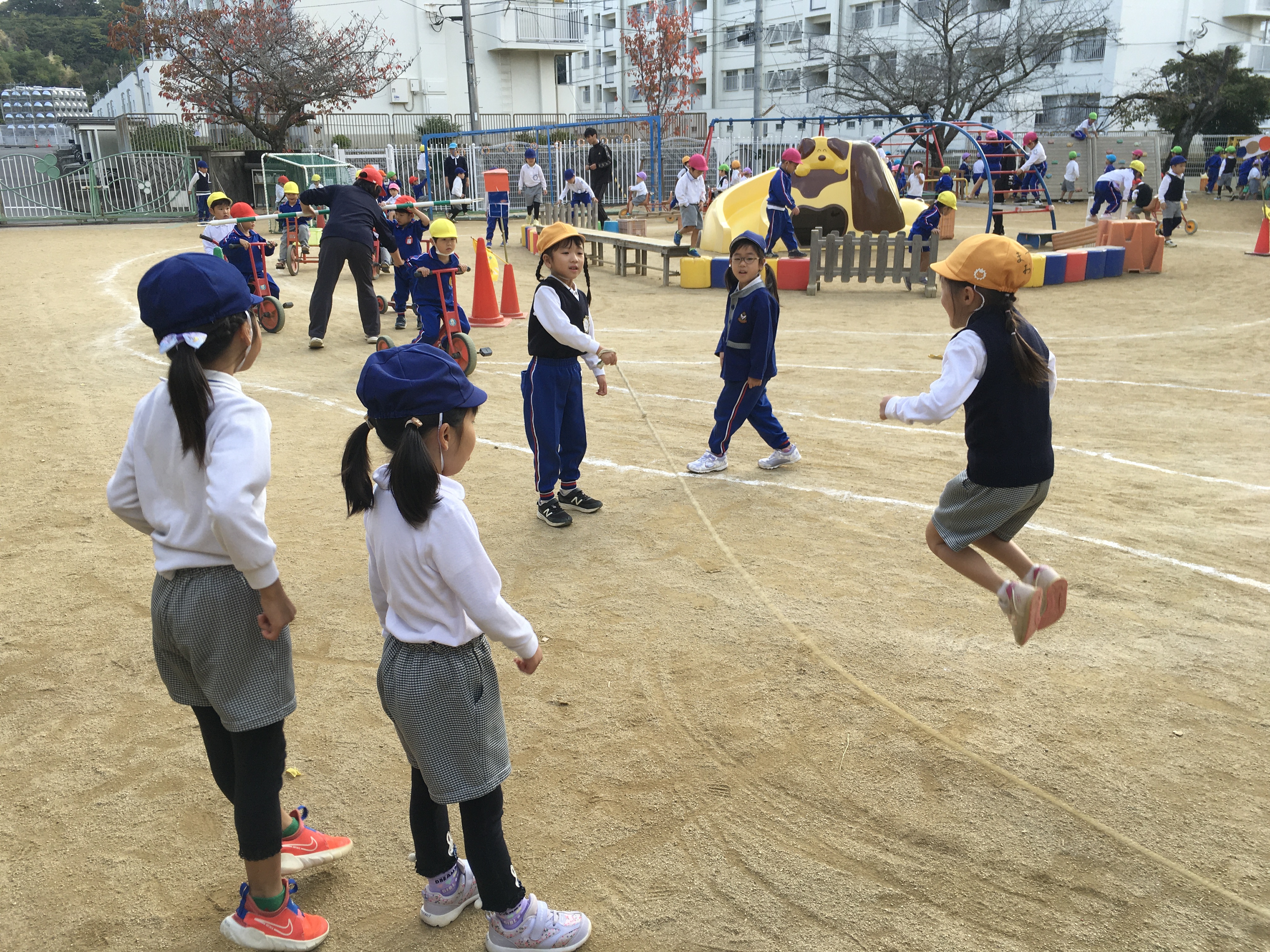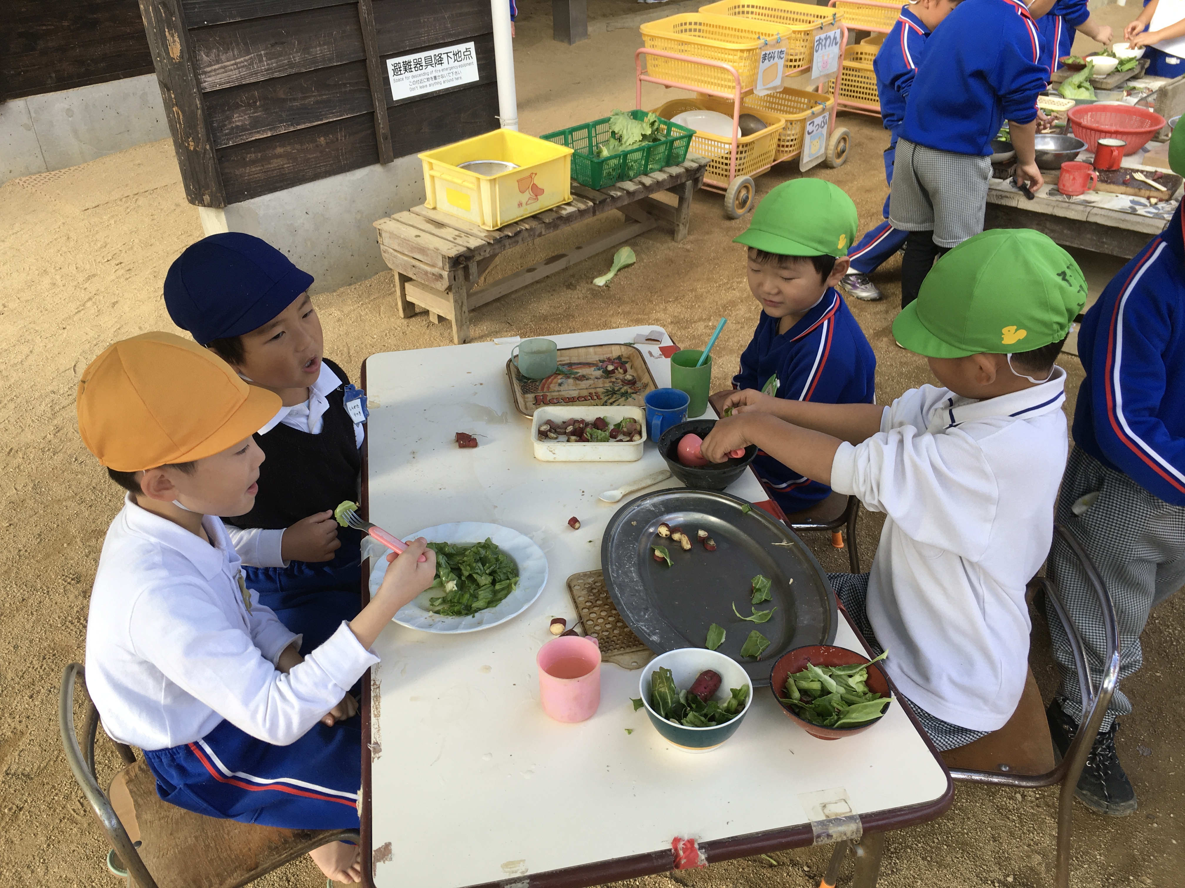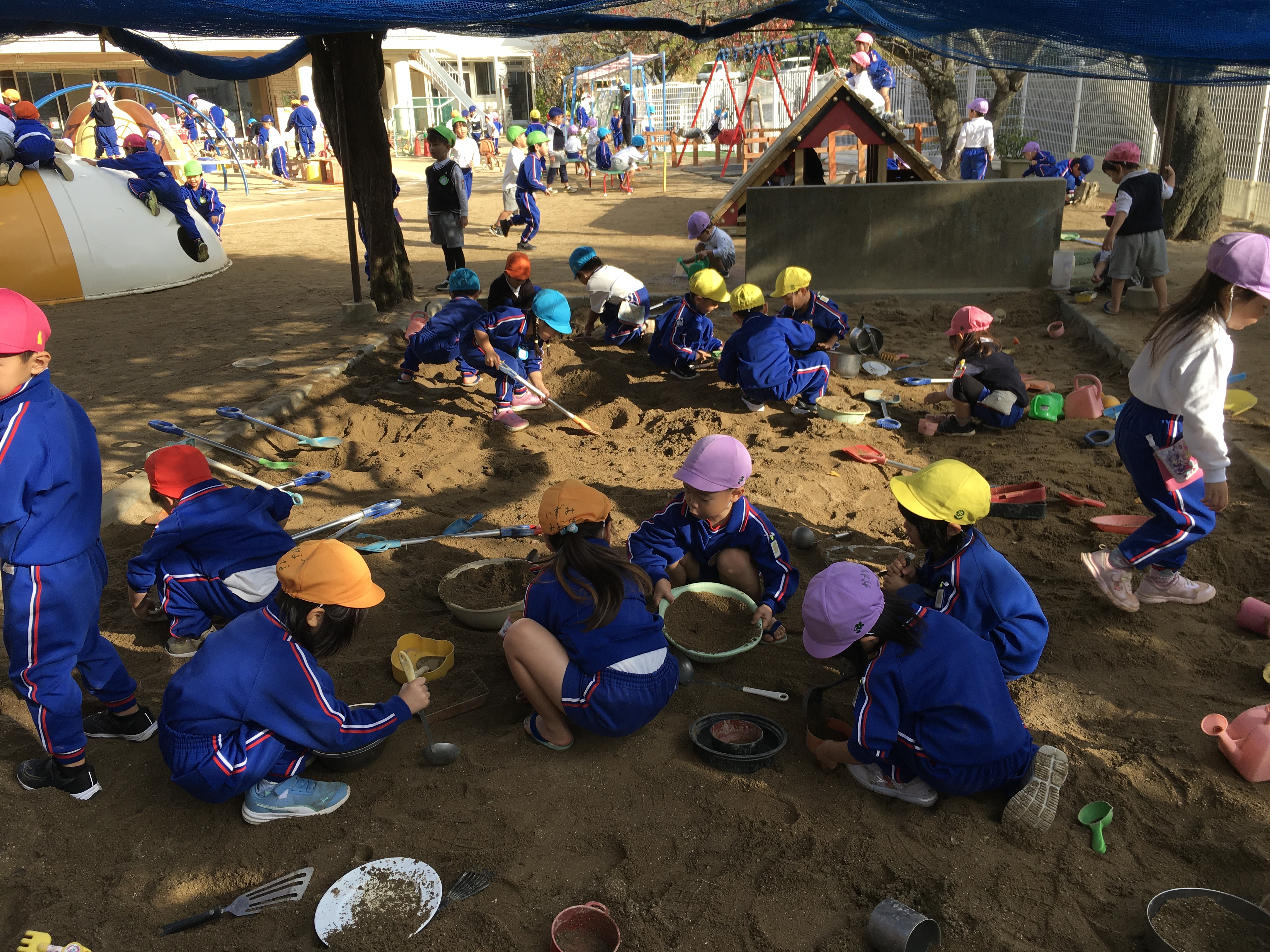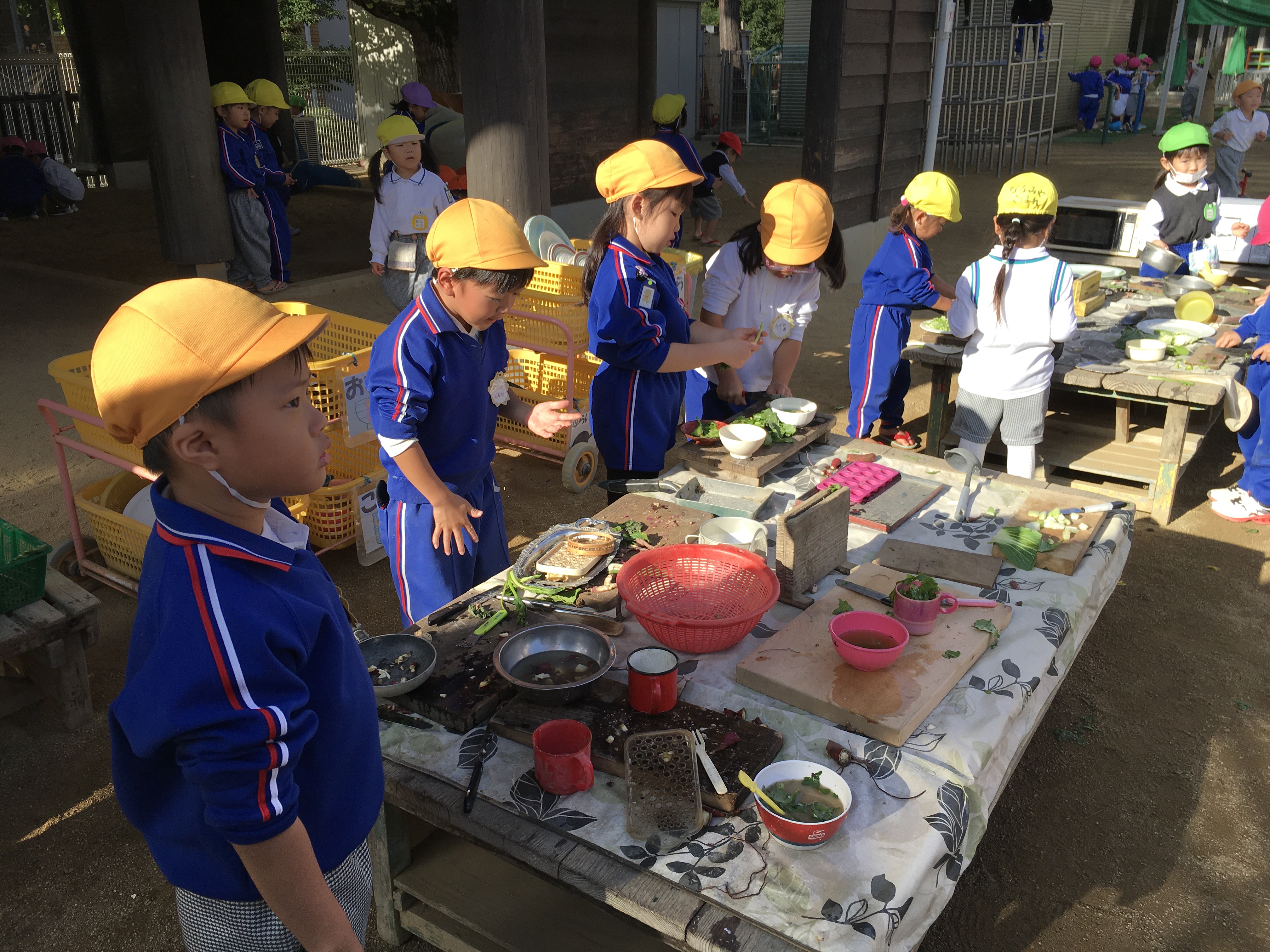 今日は秋晴れの穏やかな天気で、ぽかぽかした過ごしやすい1日になりました。朝、元気よく登園して来た子ども達は、作品展バザーで「お買い物した‼」と手作りのキーホルダーをかばんに付けてきたのを見せてくれたり、お家の人に作品を見てもらい「上手だね‼」「可愛いね♪」って言ってくれた事を嬉しそうに話したりする姿がありました。戸外では、年長児を中心にバザーごっこが始まっており、「すみませーん。カレーくださーい!」「コーヒーくださーい」と店員さんとお客さんになって掛け合いを楽しみながら遊んでいました。その時、「団子お願いしまーす!」と注文が入りました。「団子!?」と困った様子のコックのS君。今日の包丁ままごとの野菜は、葉物野菜とさつまいもでした。どうするのかな?と見ていると、何と、さつまいもをすりおろしそれを丸めて団子にしていたのでした。この発想は私も思い付かずびっくりしました。それを見ていた年少児達は、年長児が部屋に戻るとすりおろし器を持ってきて、見様見真似で、さつまいもを力強くすりおろす様子がとても可愛かったです。結果は、年少児にはまだ力が足りず、上手にはできなかったのですが、年長児の行動や様子を見てそれを真似てやってみよう!!という気持ちが培われていっている事に成長を感じました。