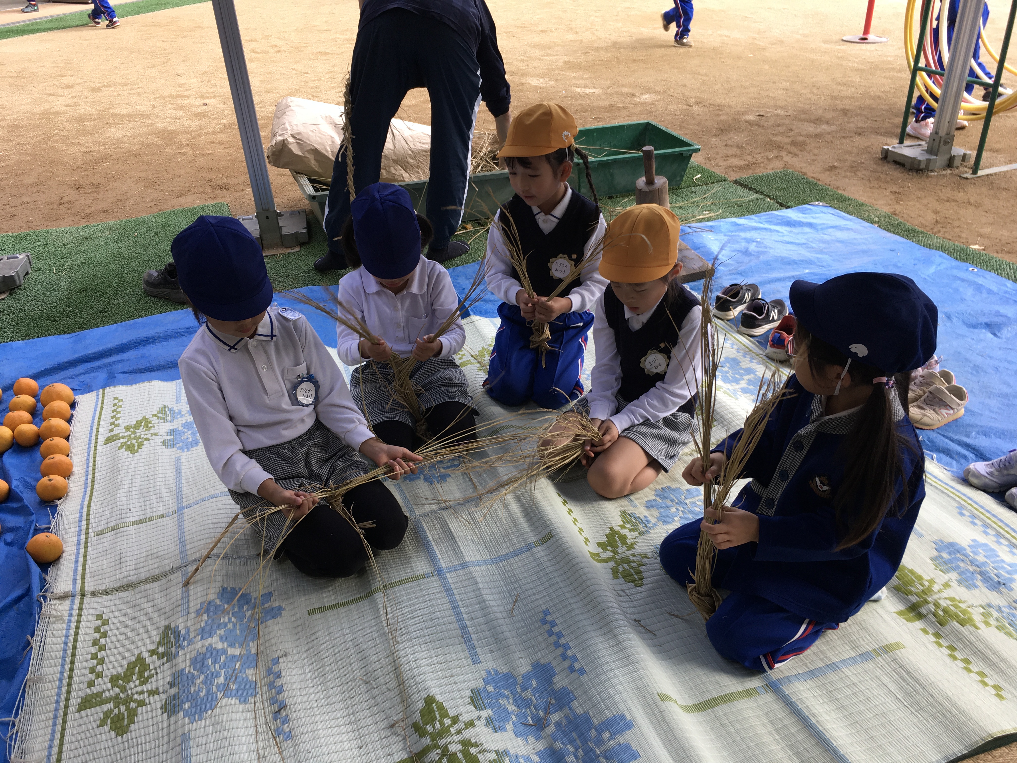 時間いっぱい戸外で遊んだあと、テント下に米袋が沢山置いてある事に気がついたさくら組の子ども達は「お米ー!!」と言いながら寄ってきてました。開けてみるとなんと柿がたーくさん入っていました。河野先生に「何個ぐらいあるんだろう?」と聞かれた子ども達は米袋から柿を1つずつ取り出し、並べ始めました。3歳児ですので10個ずつの固まりに並べるとかはできません。どのように並べていくのか見守っているとコの字のように並べてその中に子ども達が入っていました。「1.2.3.4」と10まで順調に数えていましたが10から18に飛んだり、25から34に飛んだり、年少児らしい光景に自然と笑みがこぼれました。最後「60個あるー!!」と言っていたさくら組の子達ですが教師と数えると100個ありました。この柿は、預かり保育の森さんが高知県から採って来てくれた渋柿です。米袋に100個の渋柿が5袋!!何と500個もあります。明日から少しずつ三葉伝統の干し柿作りが始まりそうです。