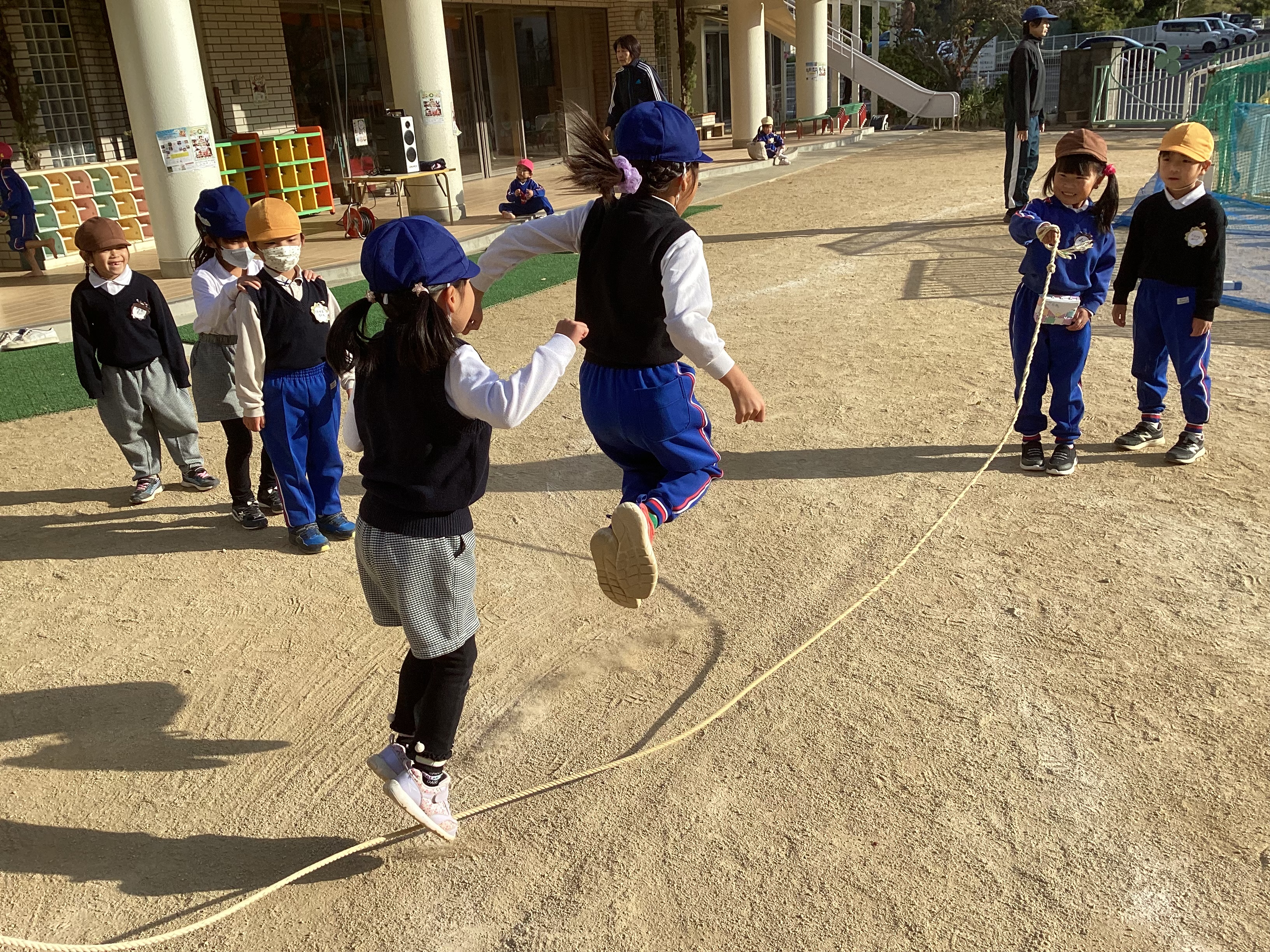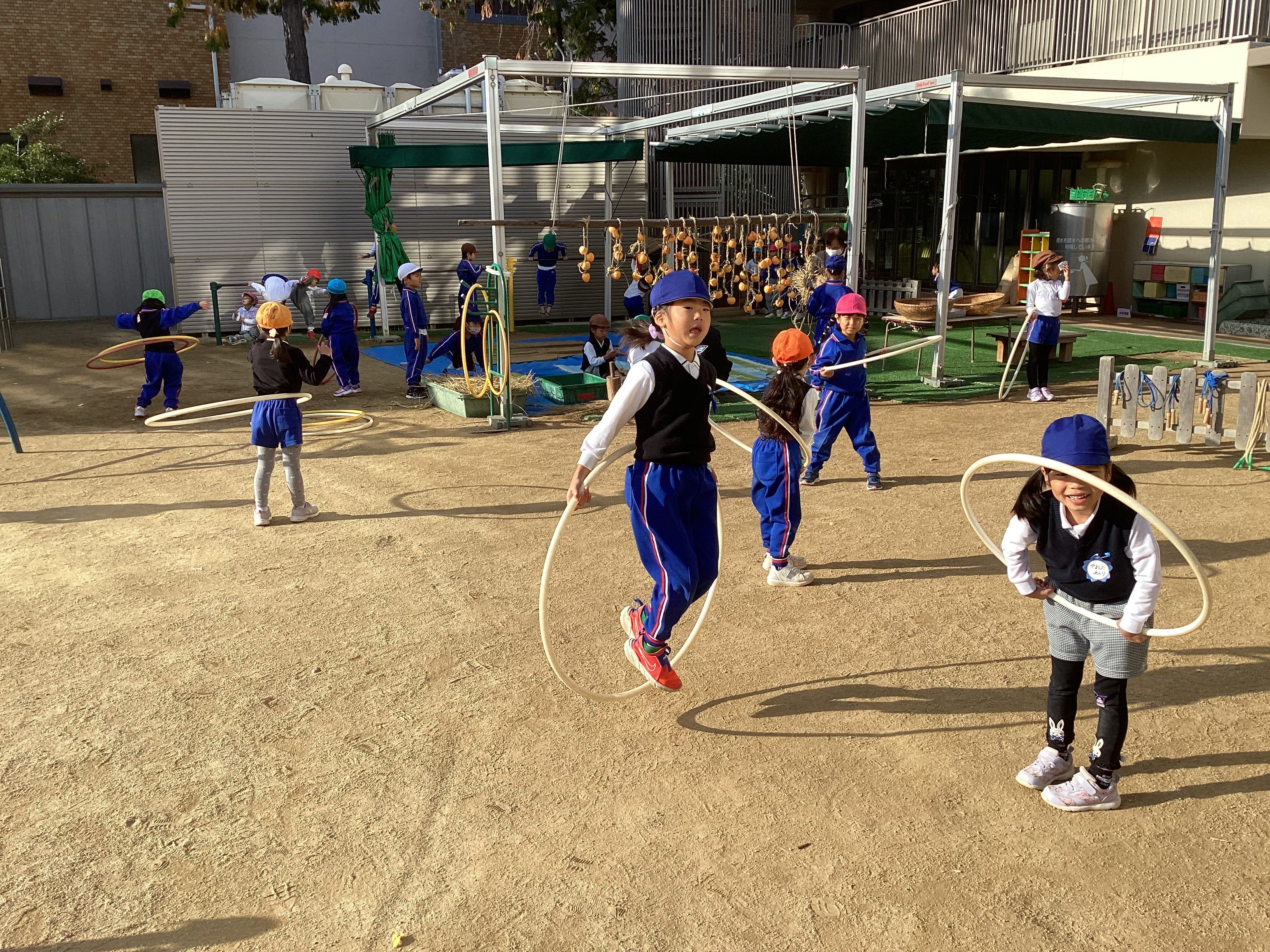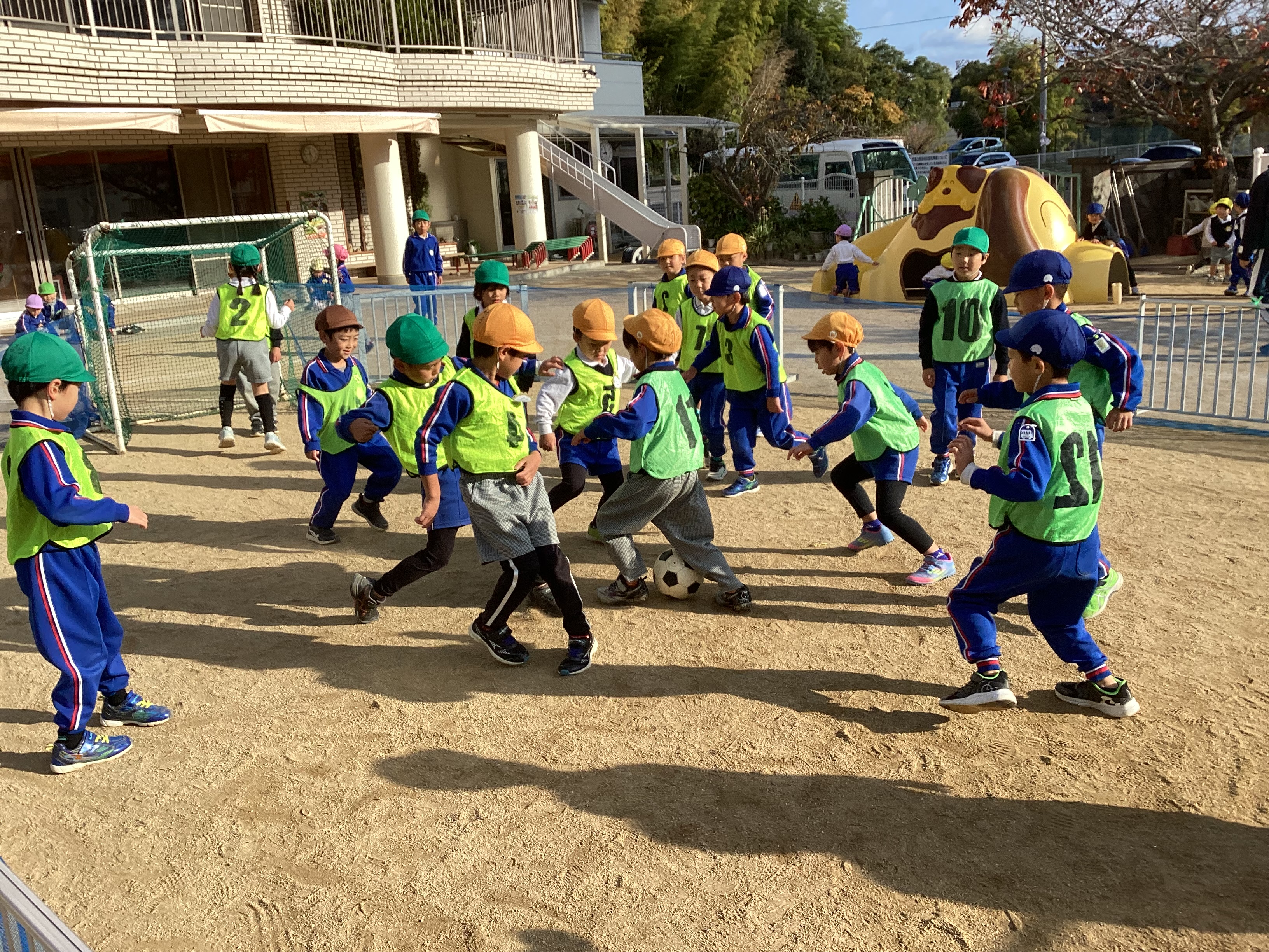 昨日の職員会でのこと。寒くなってきたので戸外遊びをどのように変えていこうかと話し合いました。みつばっ子には、元気いっぱいに体を動かして遊んでほしいということで、園庭にサッカーや長縄跳び、フラフープの遊びや鬼ごっこ等ができる広いスペースを作ってみようということになりました。そして今朝、園庭にサッカーの環境を準備していると、年長児が「先生!サッカーやっていい?」と集まってきました。ボールを蹴ったり追いかけたりしながら「手に当たったけん、ハンドよ!」「こっちのチームが触って外に出たけん、青チームのボールやけん!」と声が飛び交い、ルールも本格的です。そんな年長児の姿を見ていた年中や年少児達は、いつ仲間に入っていこうかなと様子をうかがっているようでした。明日ぐらいから少しずつ小さいクラスの子ども達も、お兄ちゃんやお姉ちゃんに混ざってサッカーを楽しむ姿が見られてくるのではないかと思い、楽しみです。