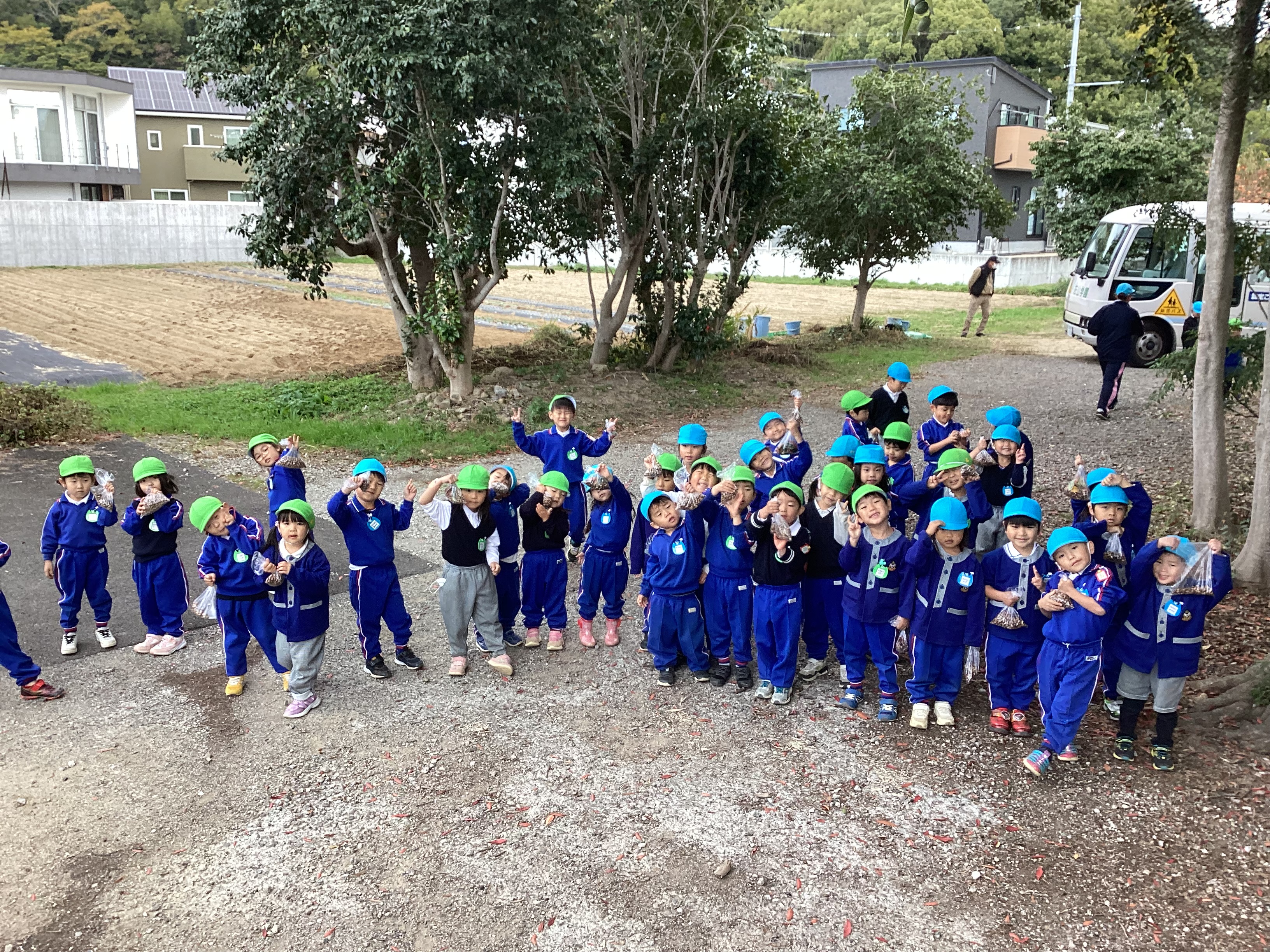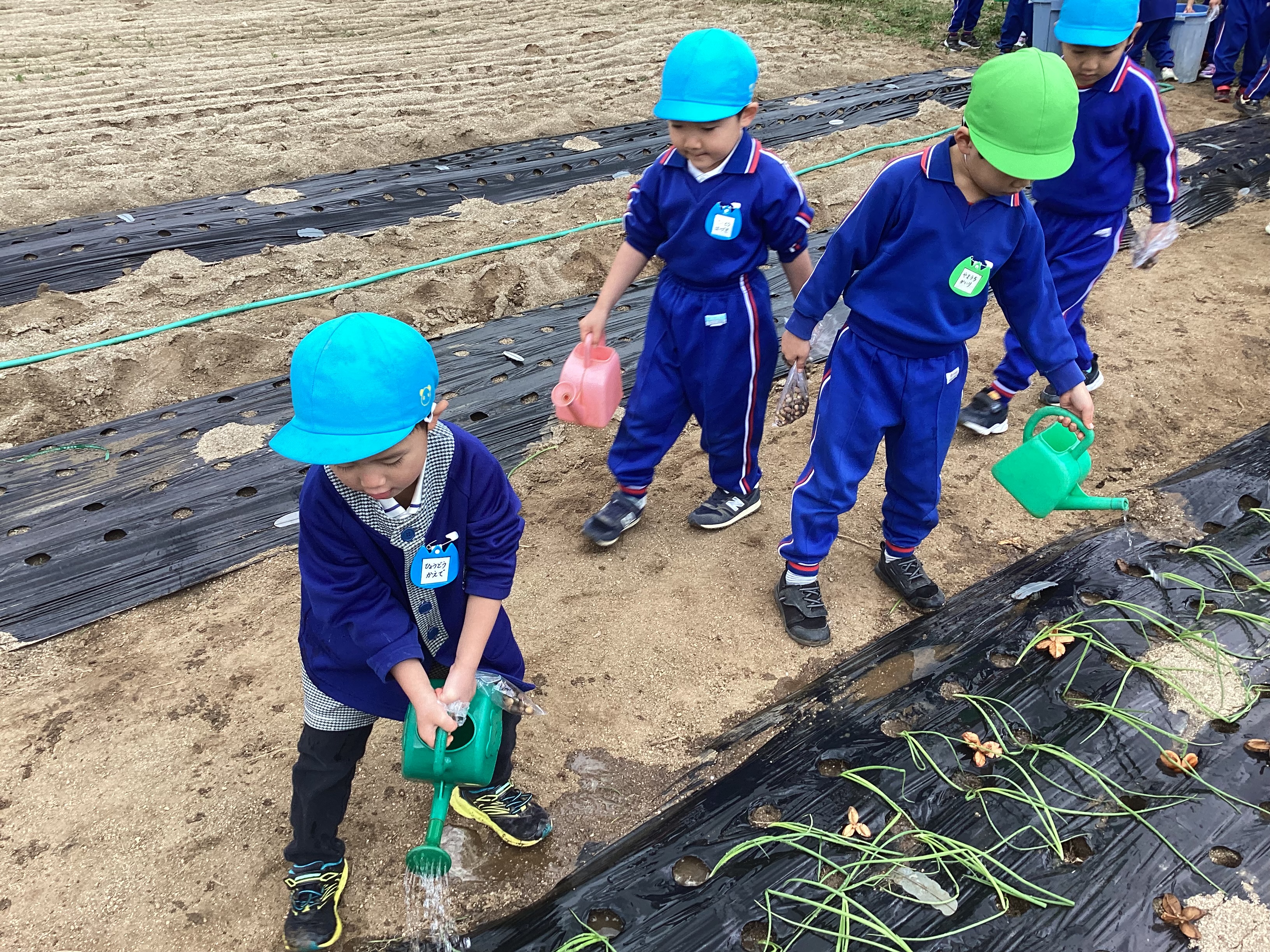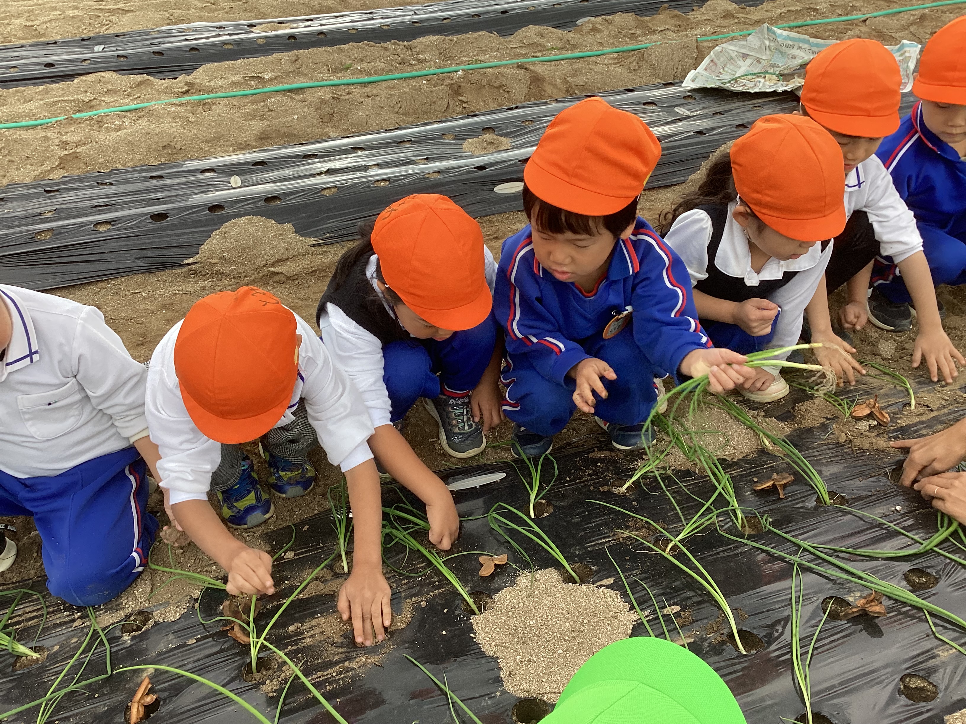 今日は年中組が北斎院町にある秀野邸の畑に玉ねぎの苗を植えに行きました。出発前に古森先生が「これが玉ねぎの苗なんだけれど、お味噌汁に入れるネギに似ているでしょう?ここに玉ねぎができるんだよ。どうやったら玉ねぎができるのかな?」と子ども達に聞くと、「おひさまのパワーがいる!」「水がいる!」と答えが返ってきました。そして、苗を太陽の方向に向けて寝かせて植えることや土を掛け過ぎないこと等、玉ねぎの苗を植える時の約束事をたくさん話してもらって、「みんなが年長さんになった時にカレーライスや給食に使う玉ねぎだからね!幼稚園の代表で頑張って植えてきてね!」と応援してもらいました。畑に着くと、一人4本ずつ苗を持って植えていきましたが、「太陽の方に向けて植えるんよ!」「土を掛け過ぎたらいかんけんね!」と子ども達が声を掛け合いながら、気を付けて植えることができていました。玉ねぎを植え終えると、秀野邸の庭に落ちているどんぐりや椿の実、落ち葉を拾ったり、運転手の山本さんが育ててくれたみかんを収穫したりしてお土産として幼稚園に持って帰りました。