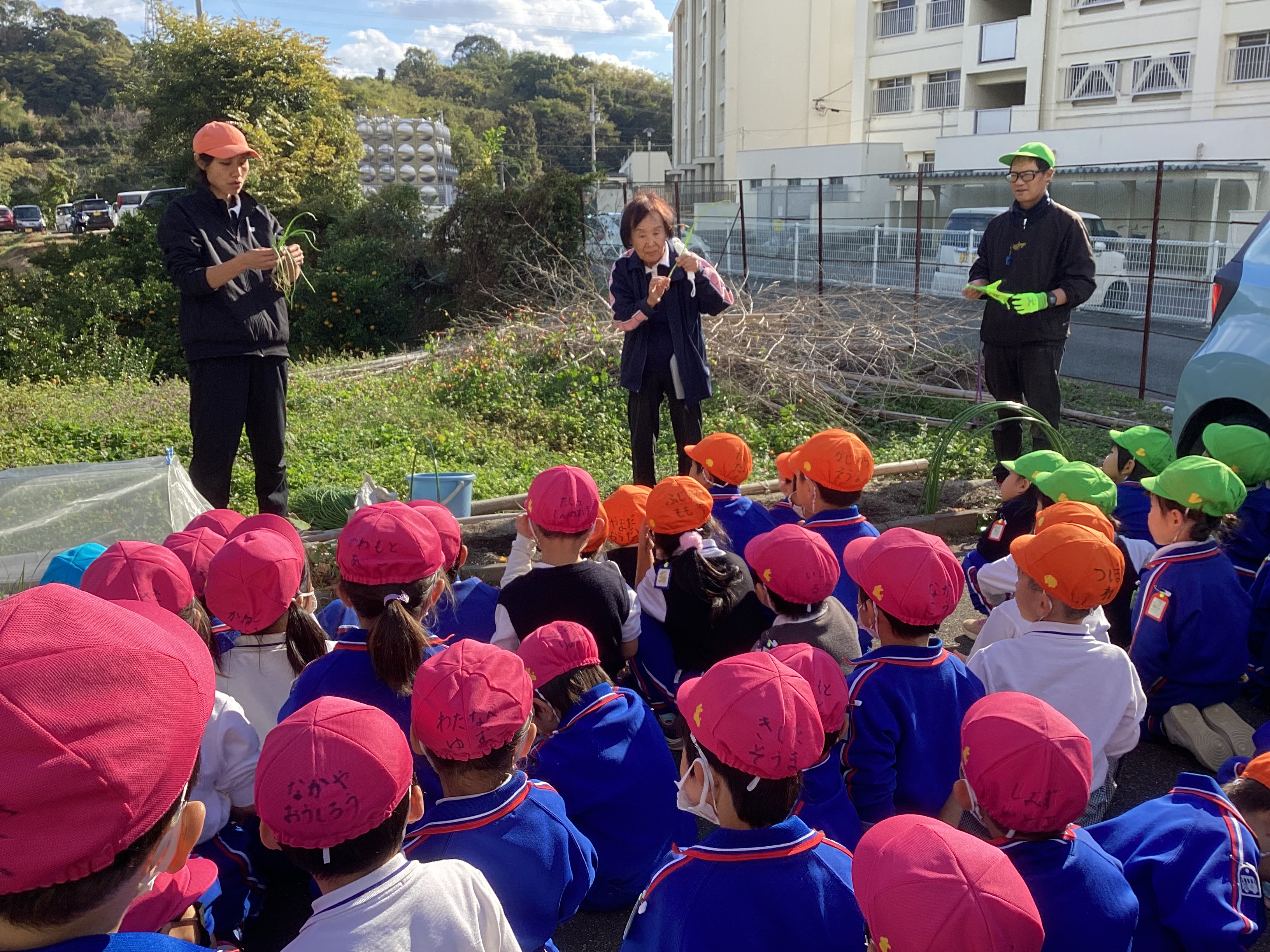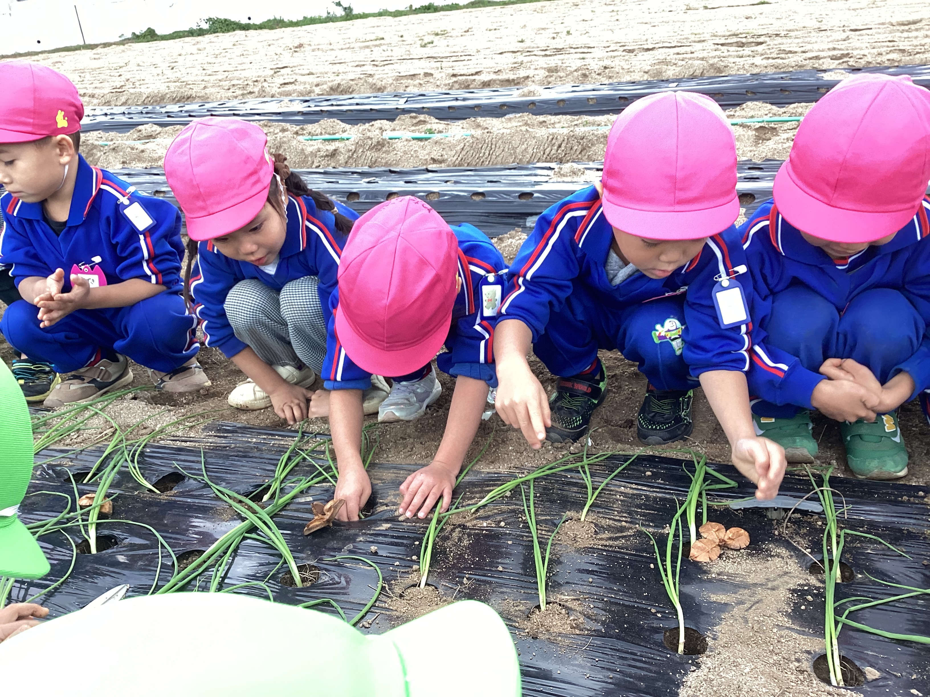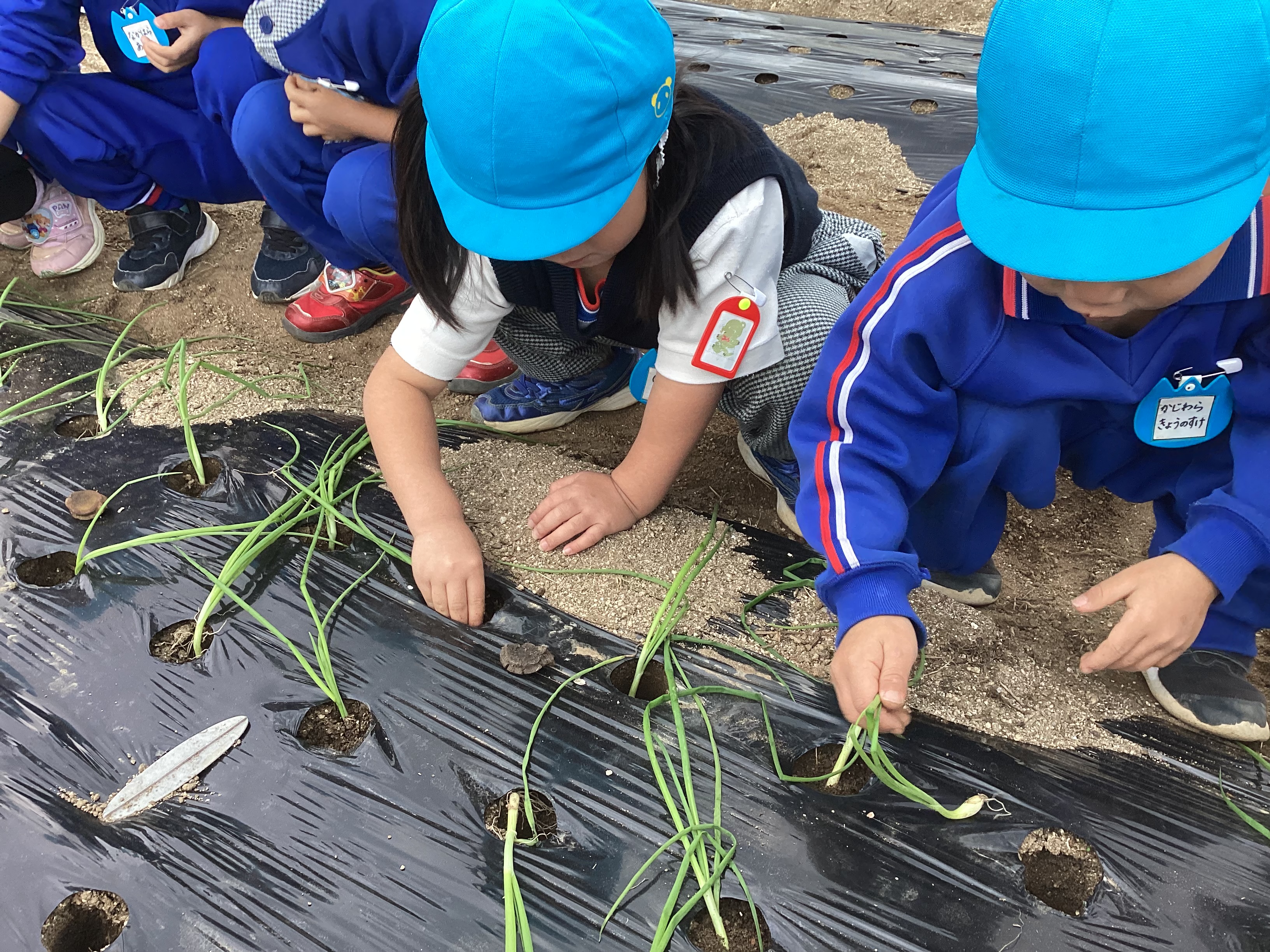 今日は年中組が北斎院町にある秀野邸の畑に玉ねぎの苗を植えに行きました。出発前に古森先生が「これが玉ねぎの苗なんだけれど、お味噌汁に入れるネギに似ているでしょう?ここに玉ねぎができるんだよ。どうやったら玉ねぎができるのかな?」と子ども達に聞くと、「おひさまのパワーがいる!」「水がいる!」と答えが返ってきました。そして、苗を太陽の方向に向けて寝かせて植えることや土を掛け過ぎないこと等、玉ねぎの苗を植える時の約束事をたくさん話してもらって、「みんなが年長さんになった時にカレーライスや給食に使う玉ねぎだからね!幼稚園の代表で頑張って植えてきてね!」と応援してもらいました。畑に着くと、一人4本ずつ苗を持って植えていきましたが、「太陽の方に向けて植えるんよ!」「土を掛け過ぎたらいかんけんね!」と子ども達が声を掛け合いながら、気を付けて植えることができていました。玉ねぎを植え終えると、秀野邸の庭に落ちているどんぐりや椿の実、落ち葉を拾ったり、運転手の山本さんが育ててくれたみかんを収穫したりしてお土産として幼稚園に持って帰りました。