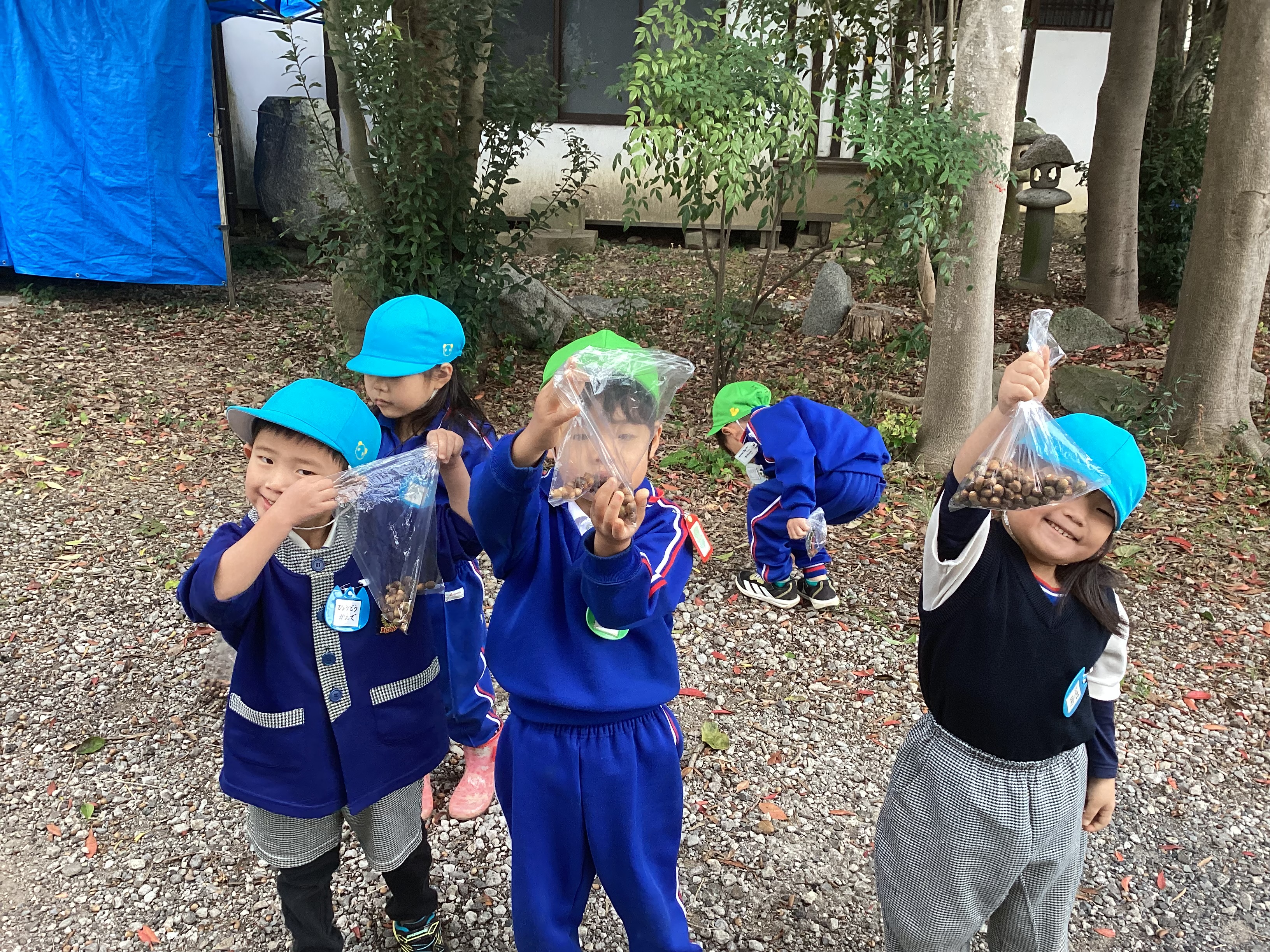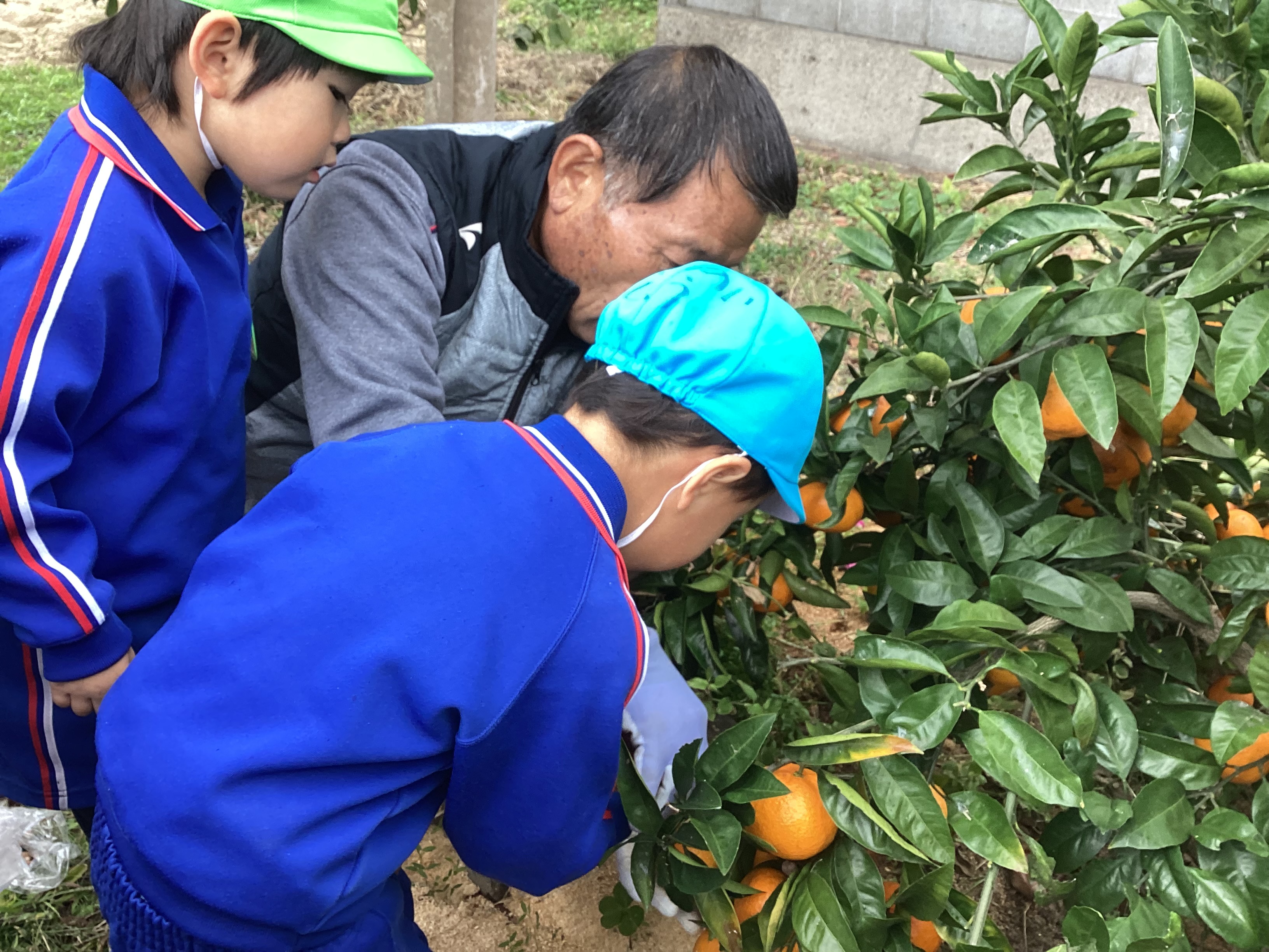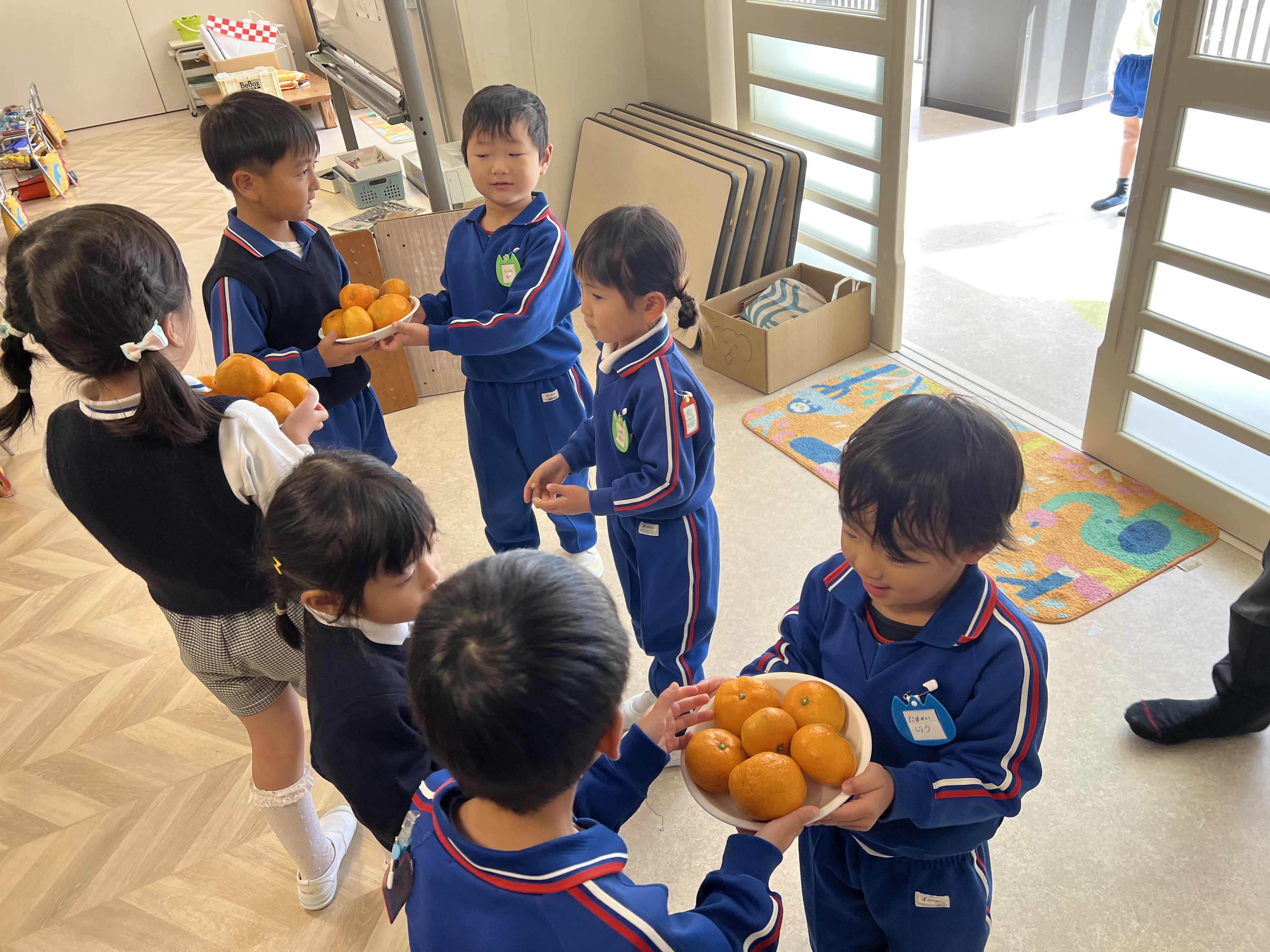 みつばっ子達の仲が良い理由の一つとして、「何でもみんなで分け合うこと」があります。年中児が持ち帰ったどんぐりは「年長さんのお店屋さんで使ってください♪」と渡しに行き、200個程収穫したみかんは「みんなで分けて食べてください♪」と全クラスに配りました。お土産をもらった子ども達も渡した子ども達もにこにこの笑顔で、仲の良さが更に深まったようでした。