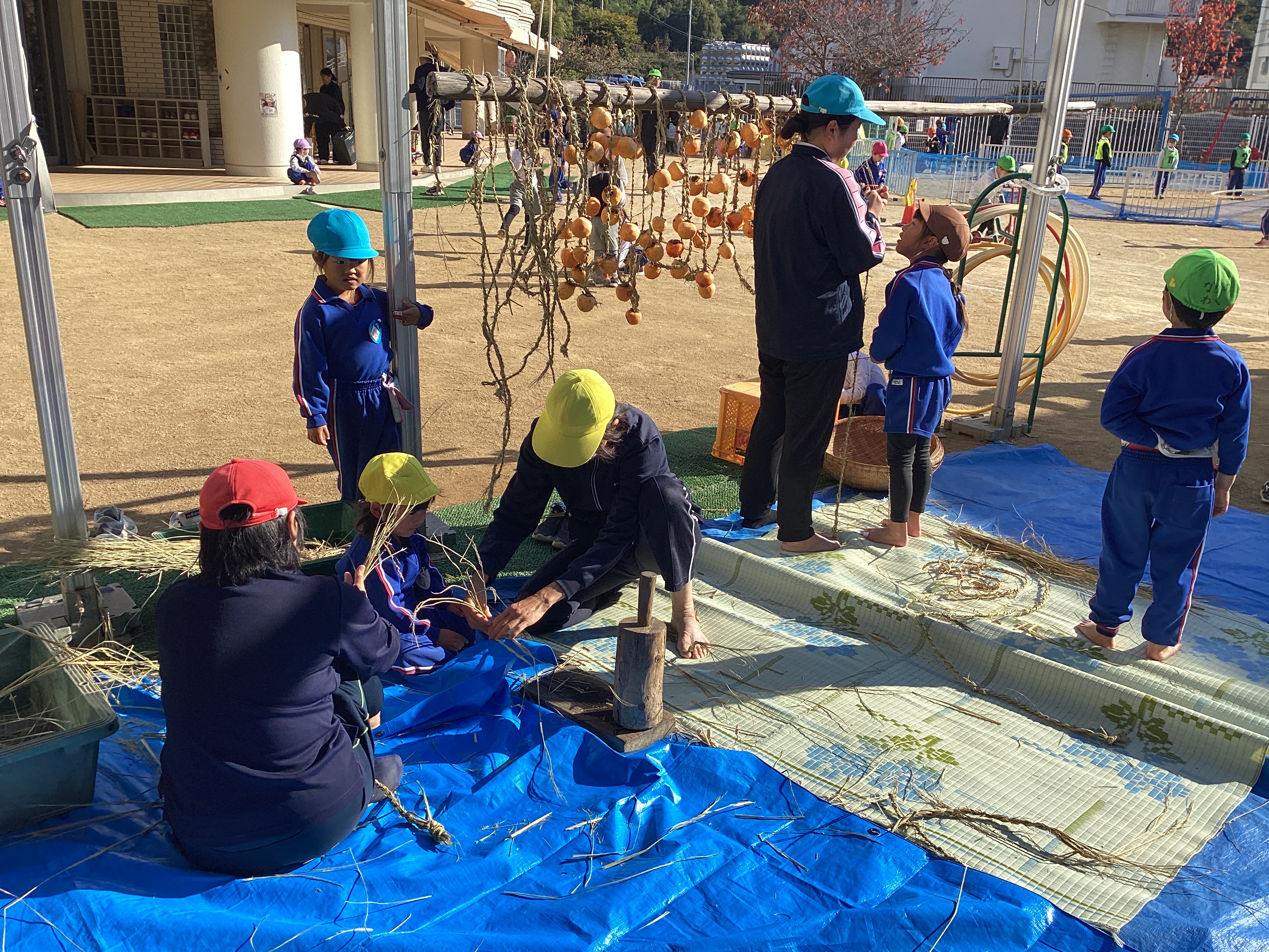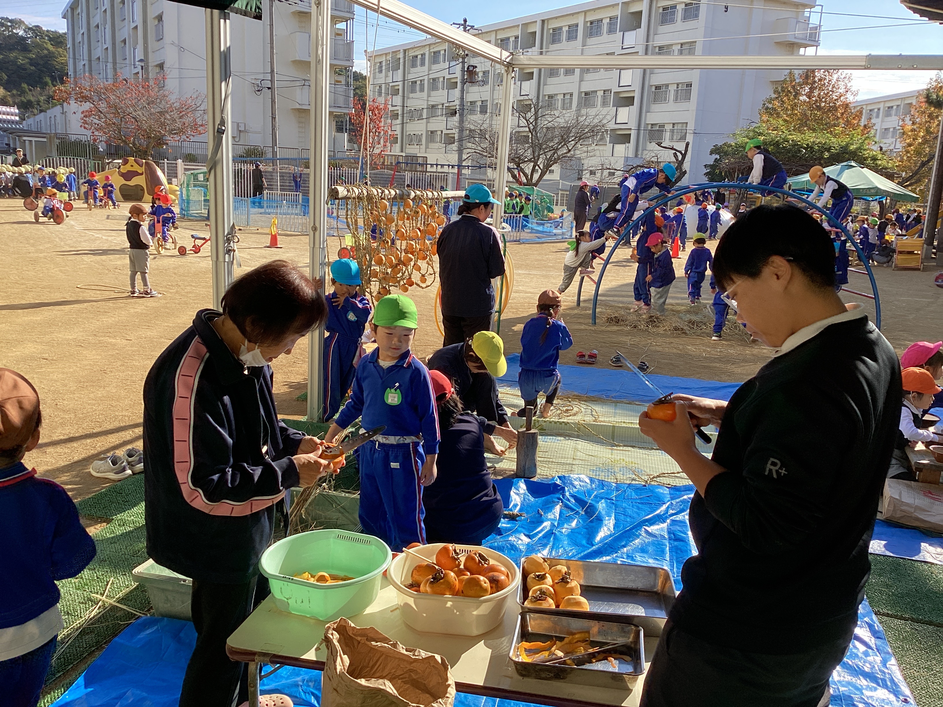 園庭の一角では古森先生を筆頭に、子どもたちや先生たちで渋柿の皮を剥いたり、それをつるす縄を作ったりして干し柿づくりの準備が行われていました。順調にいくと来年一月の始園式には食べられるようになるそうです。子どもたちの楽しみが一つ増えました。