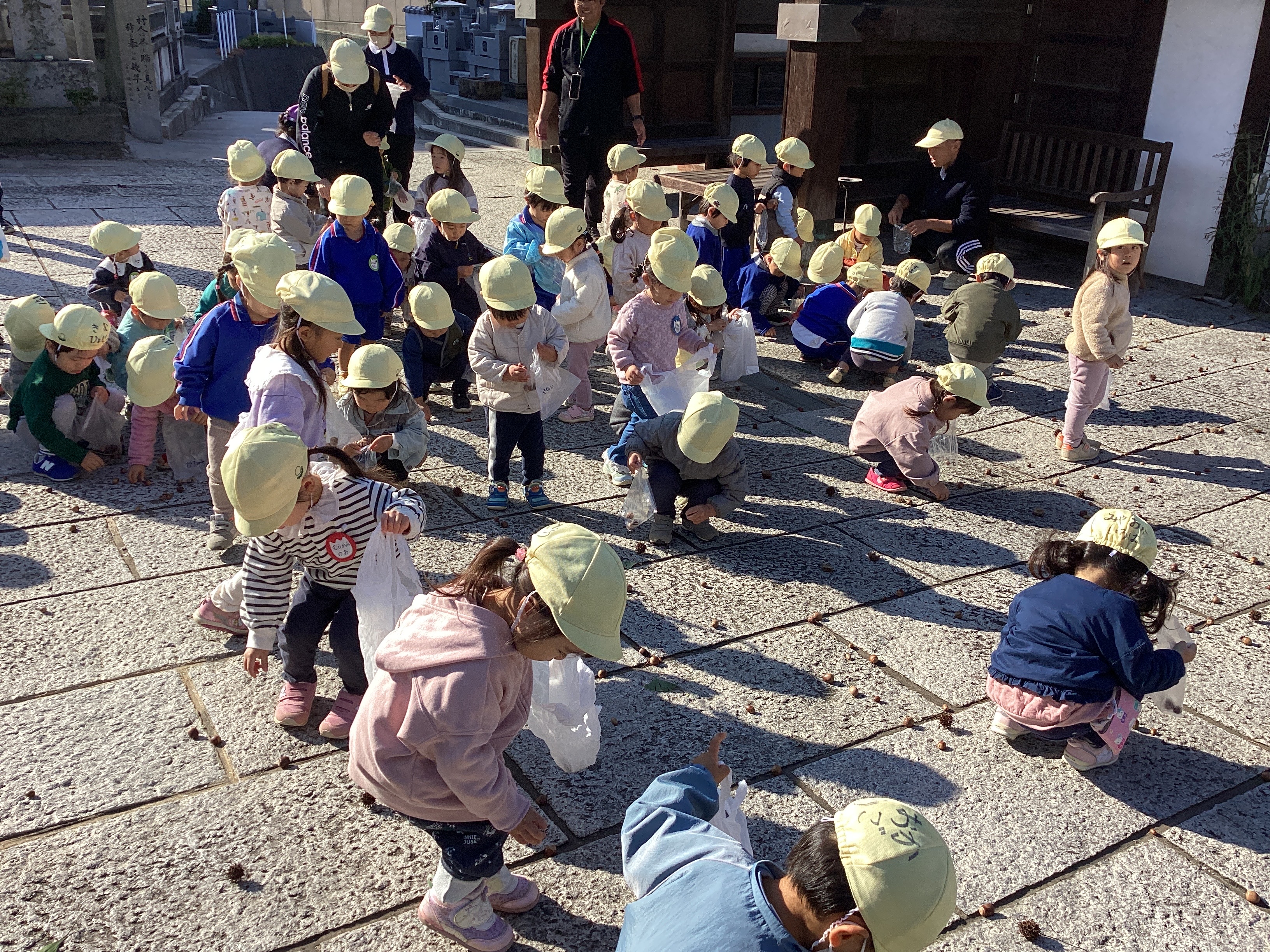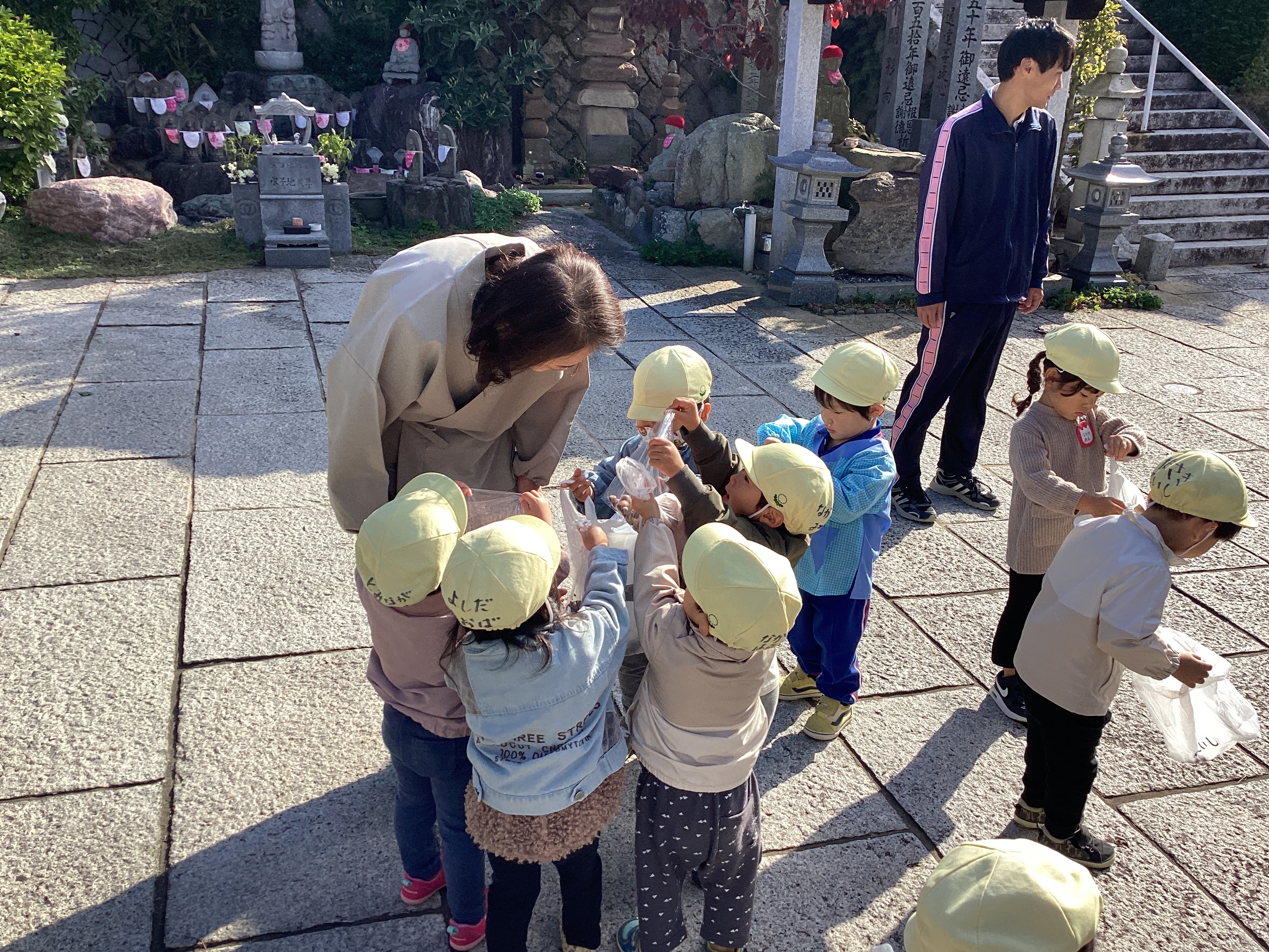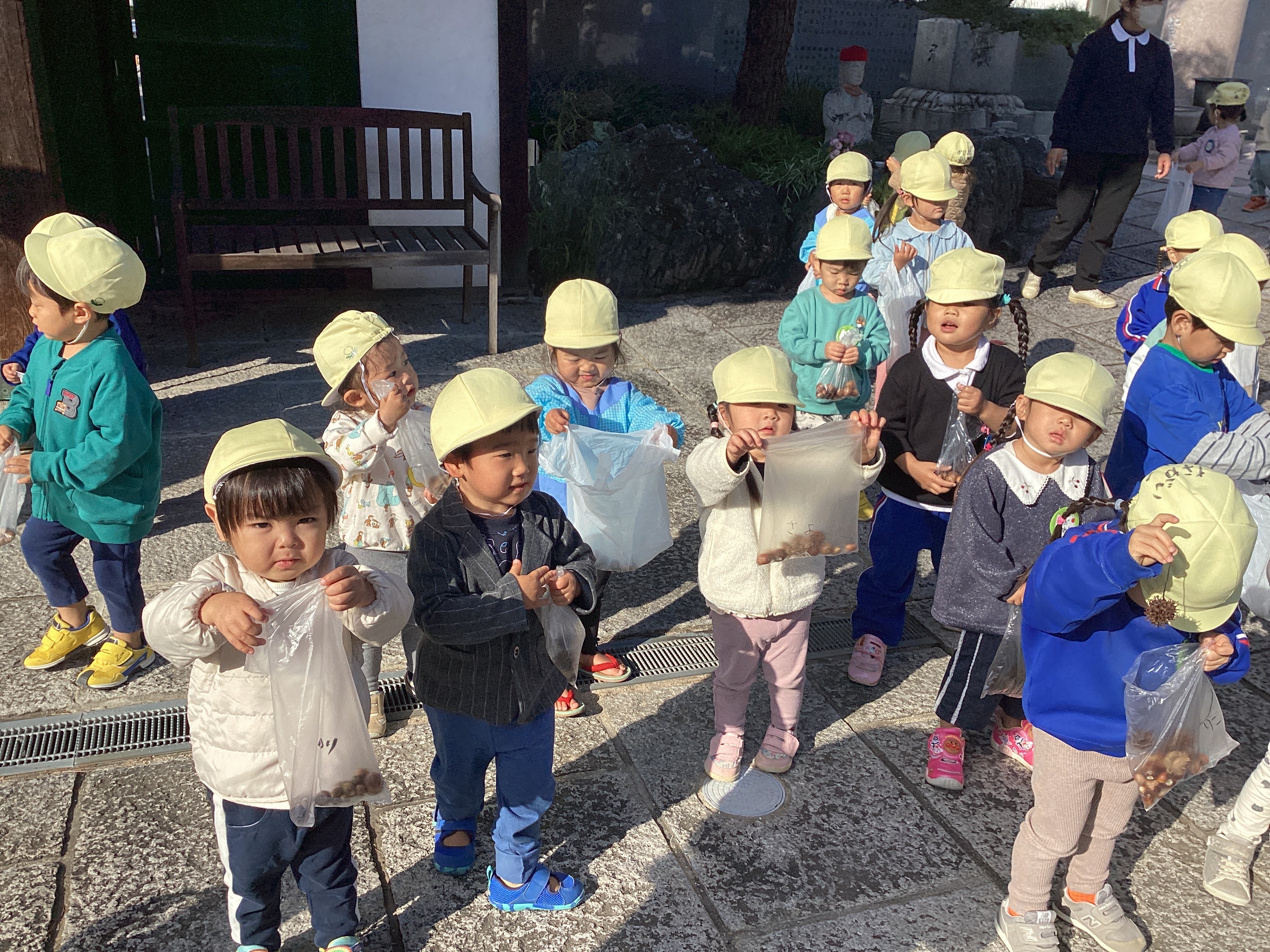 常福寺には階段を上がった所に、どんぐりの木があるので毎年どんぐり拾いに行かせてもらっています。プレ年少には階段が急で危ないということで階段下の広場で拾えるようお寺の方がどんぐりを沢山準備してくださっていました。「さあ、どんぐりいっぱい拾おう!」の合図で一斉に子どもたちが拾い始めました。小さな手で夢中で拾う姿はとても愛おしく可愛かったです。