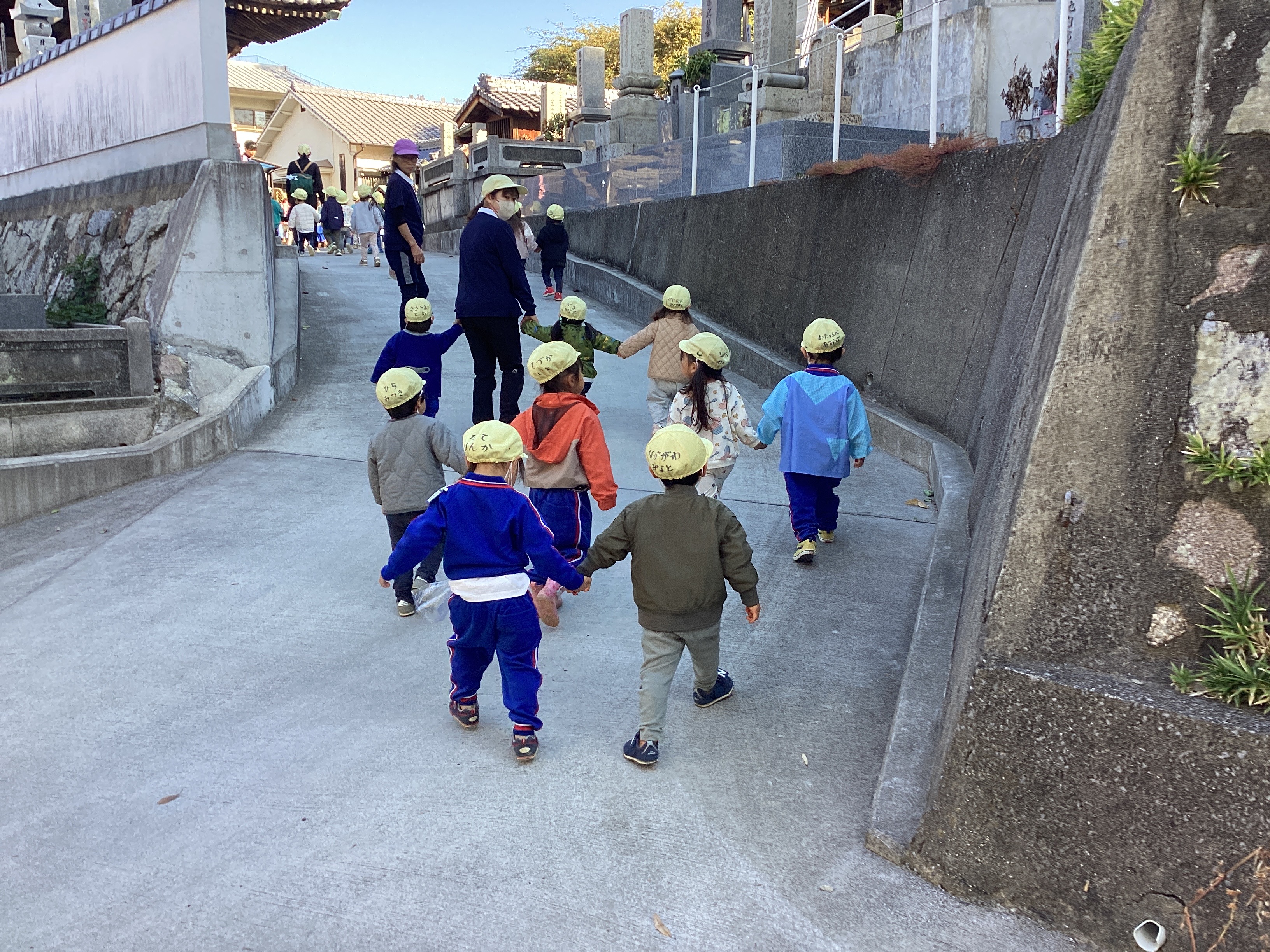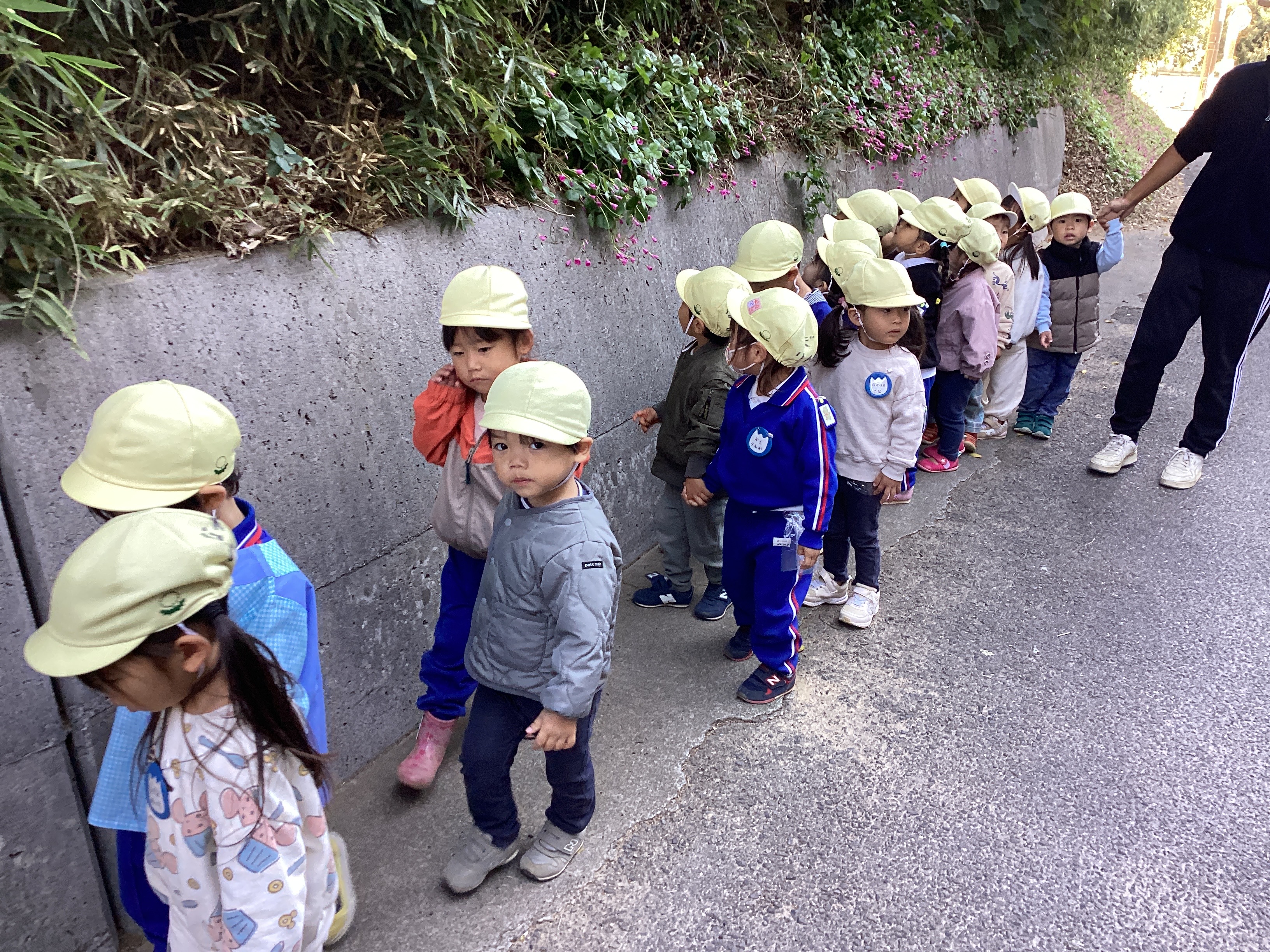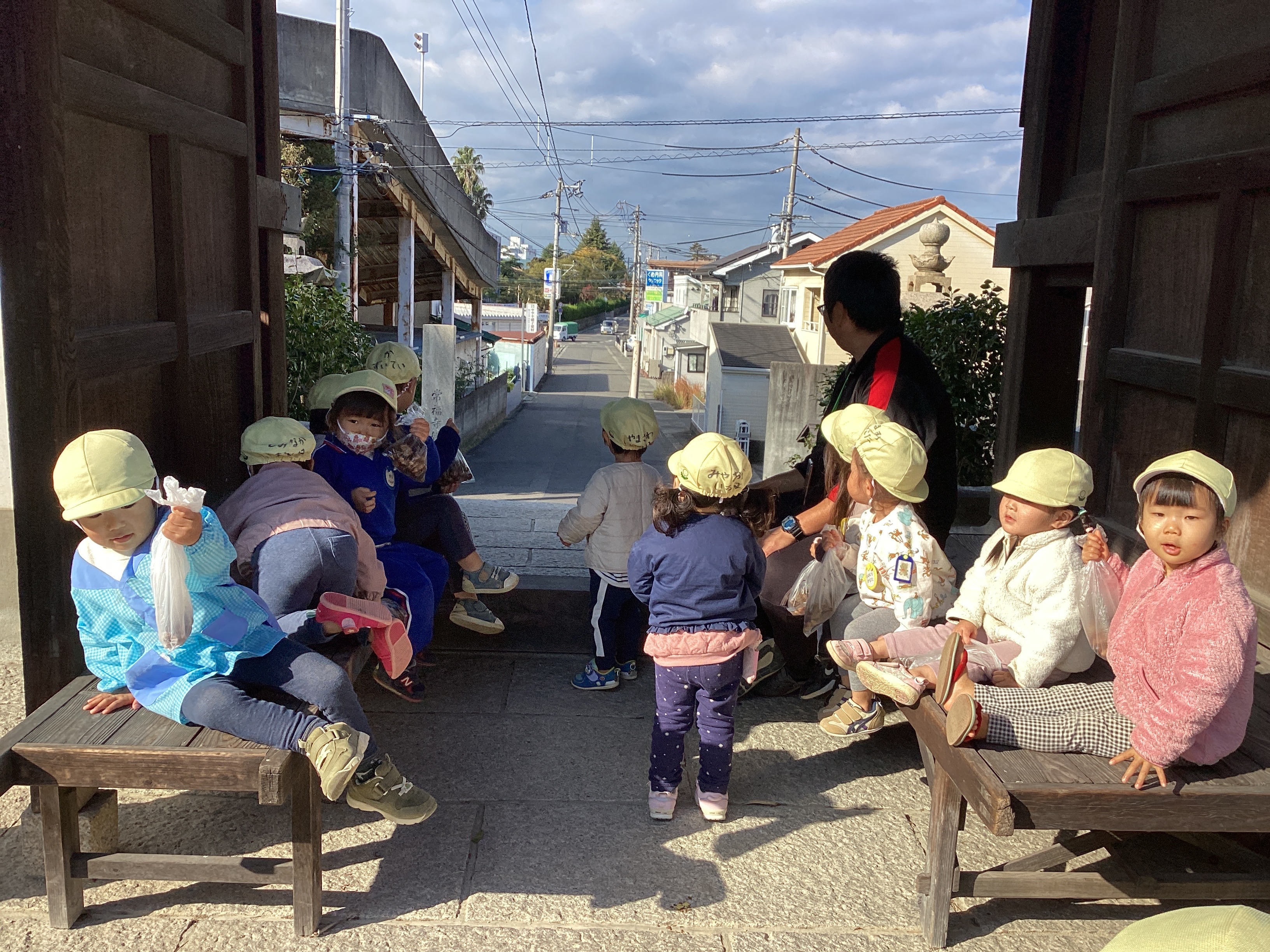 常福寺には階段を上がった所に、どんぐりの木があるので毎年どんぐり拾いに行かせてもらっています。プレ年少には階段が急で危ないということで階段下の広場で拾えるようお寺の方がどんぐりを沢山準備してくださっていました。「さあ、どんぐりいっぱい拾おう!」の合図で一斉に子どもたちが拾い始めました。小さな手で夢中で拾う姿はとても愛おしく可愛かったです。
