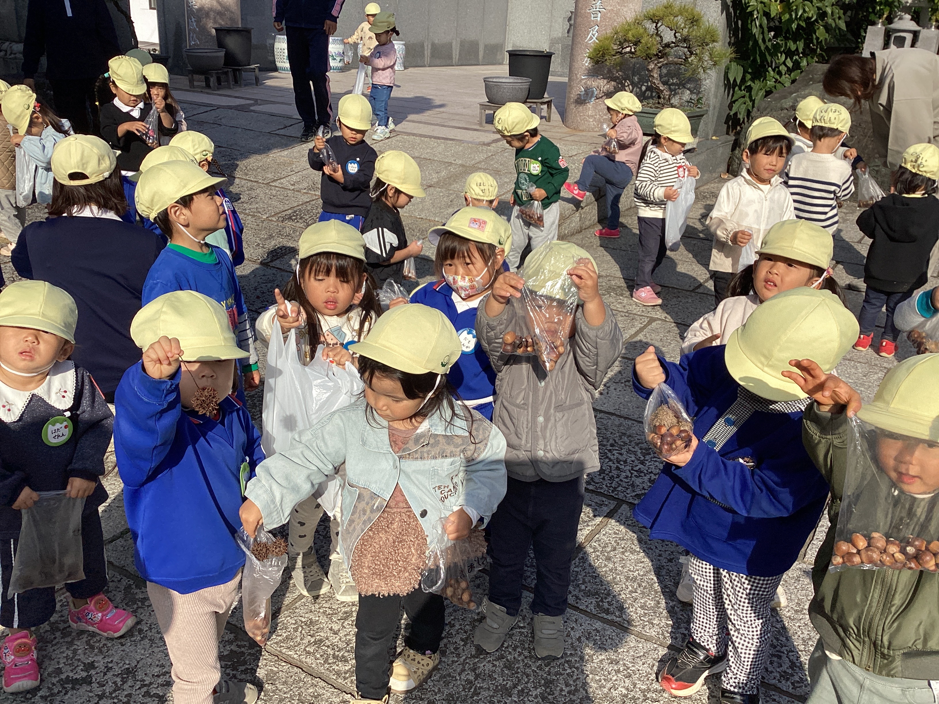 あっという間に広場のどんぐりはなくなり、子どもたちの袋の中には沢山のどんぐりが集まりました。嬉しくてお寺の方や先生に見せて回る子もいました。