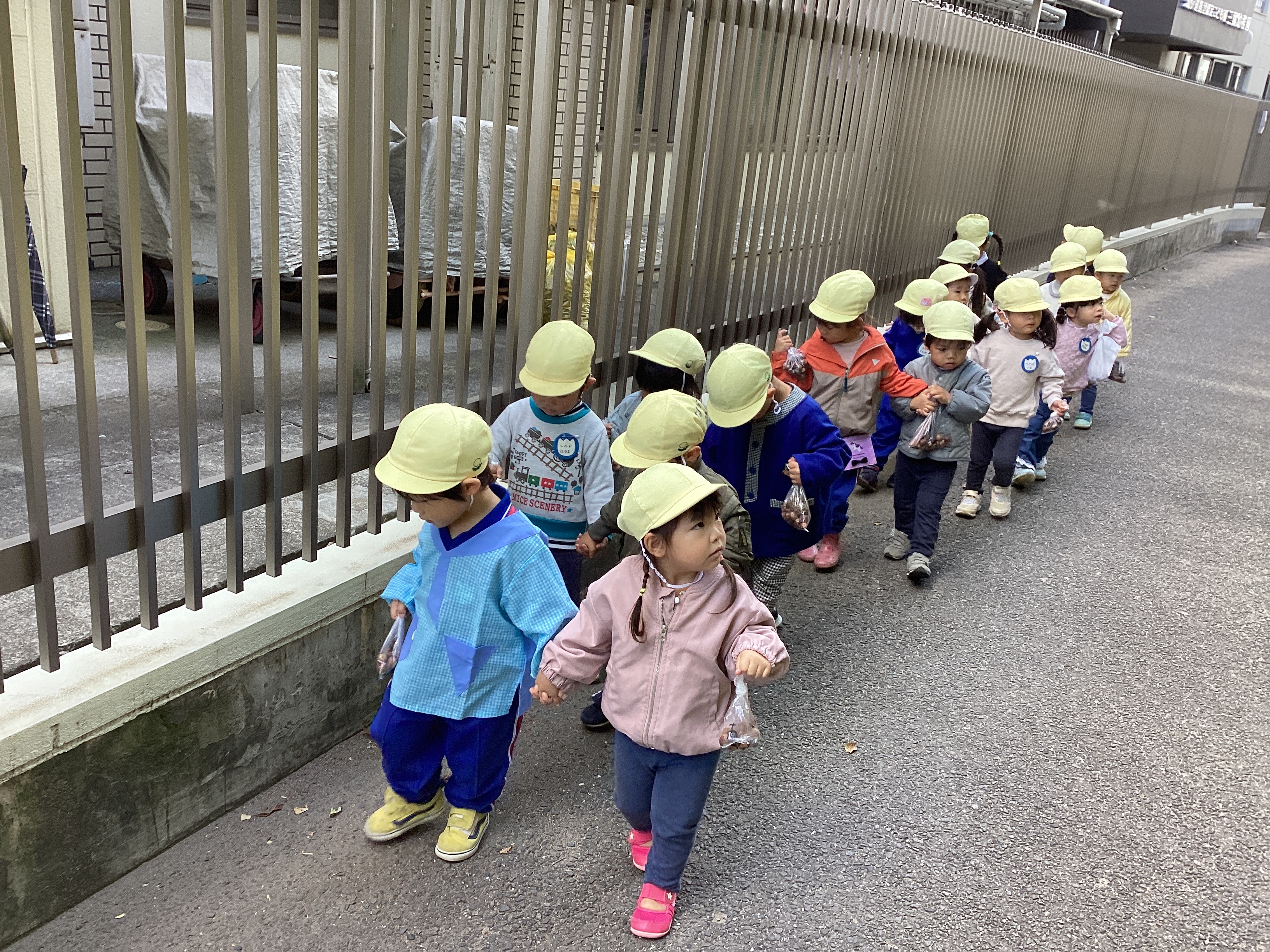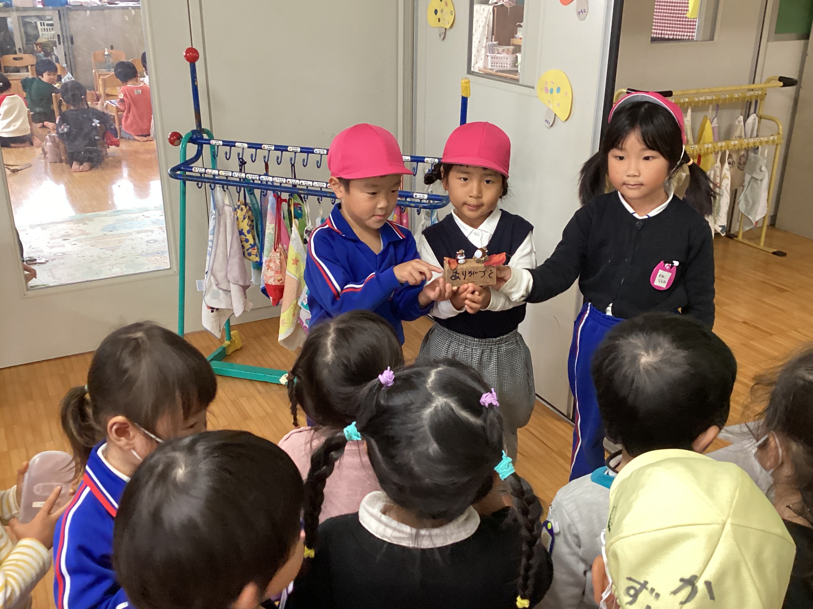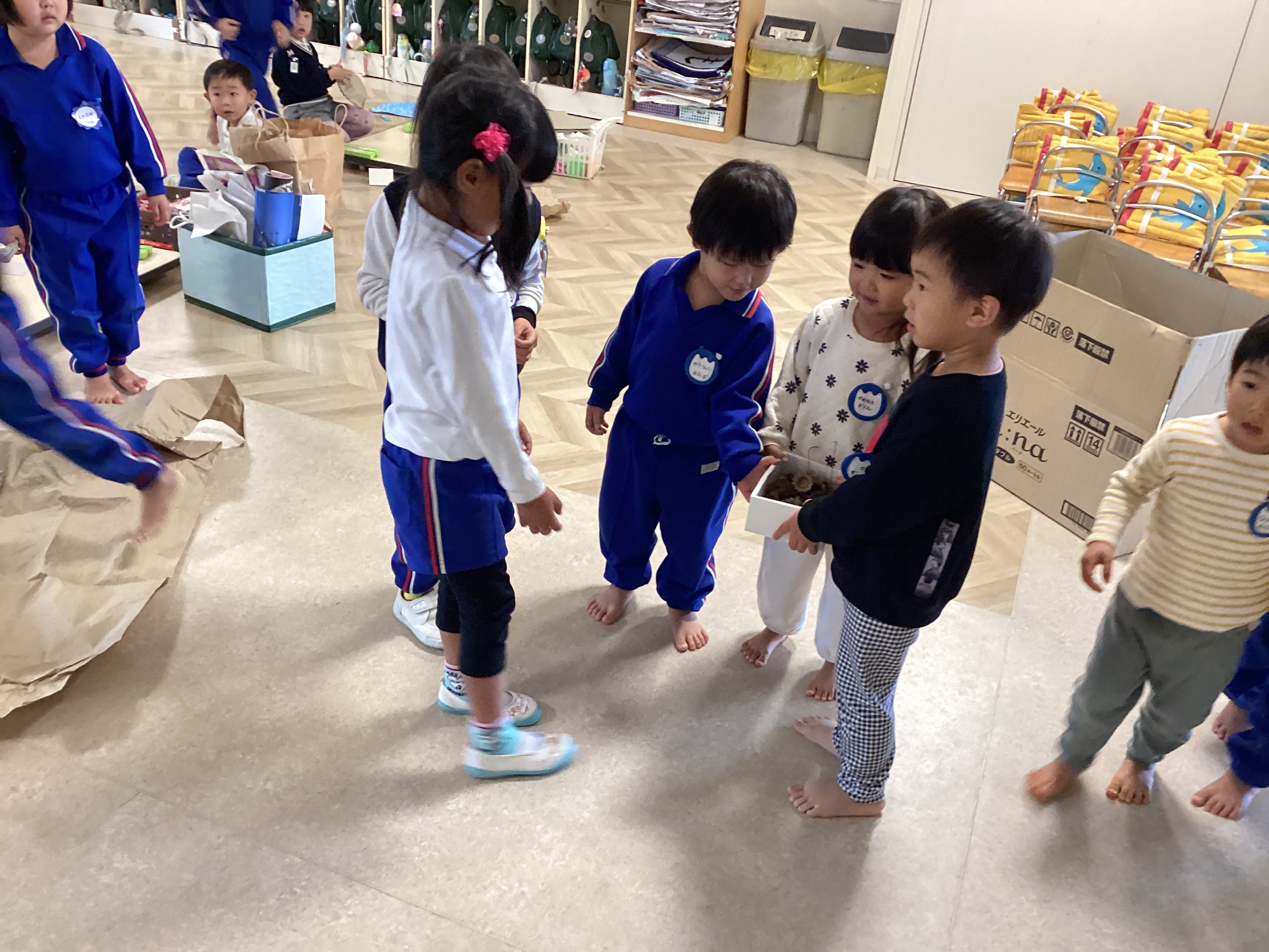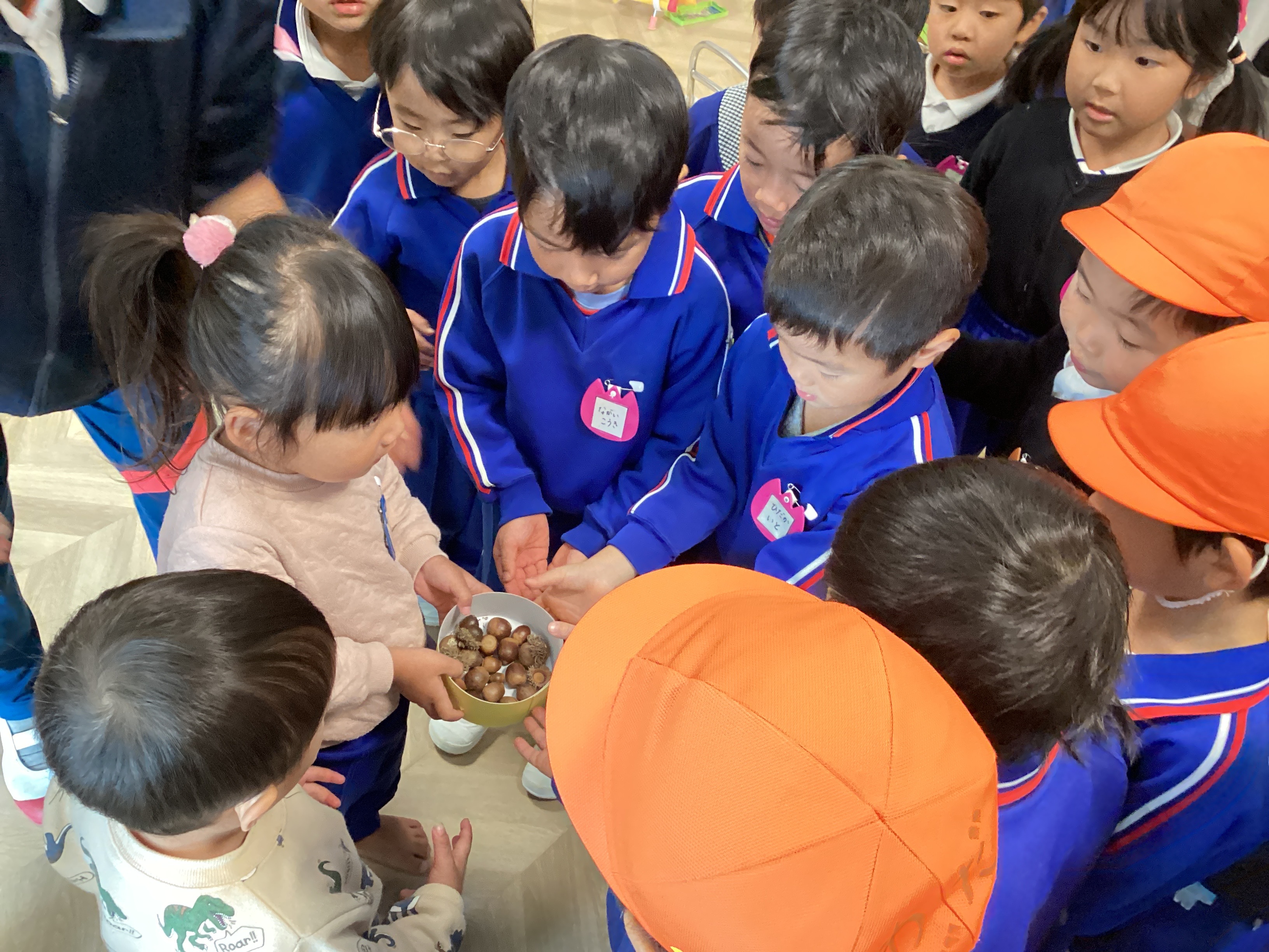 園へ帰るといつもお土産を持って帰ってくれる年長・年中組さんにお土産のどんぐりを渡しに行きました。喜んで受け取ってくれた年長・年中組さんに感謝です。