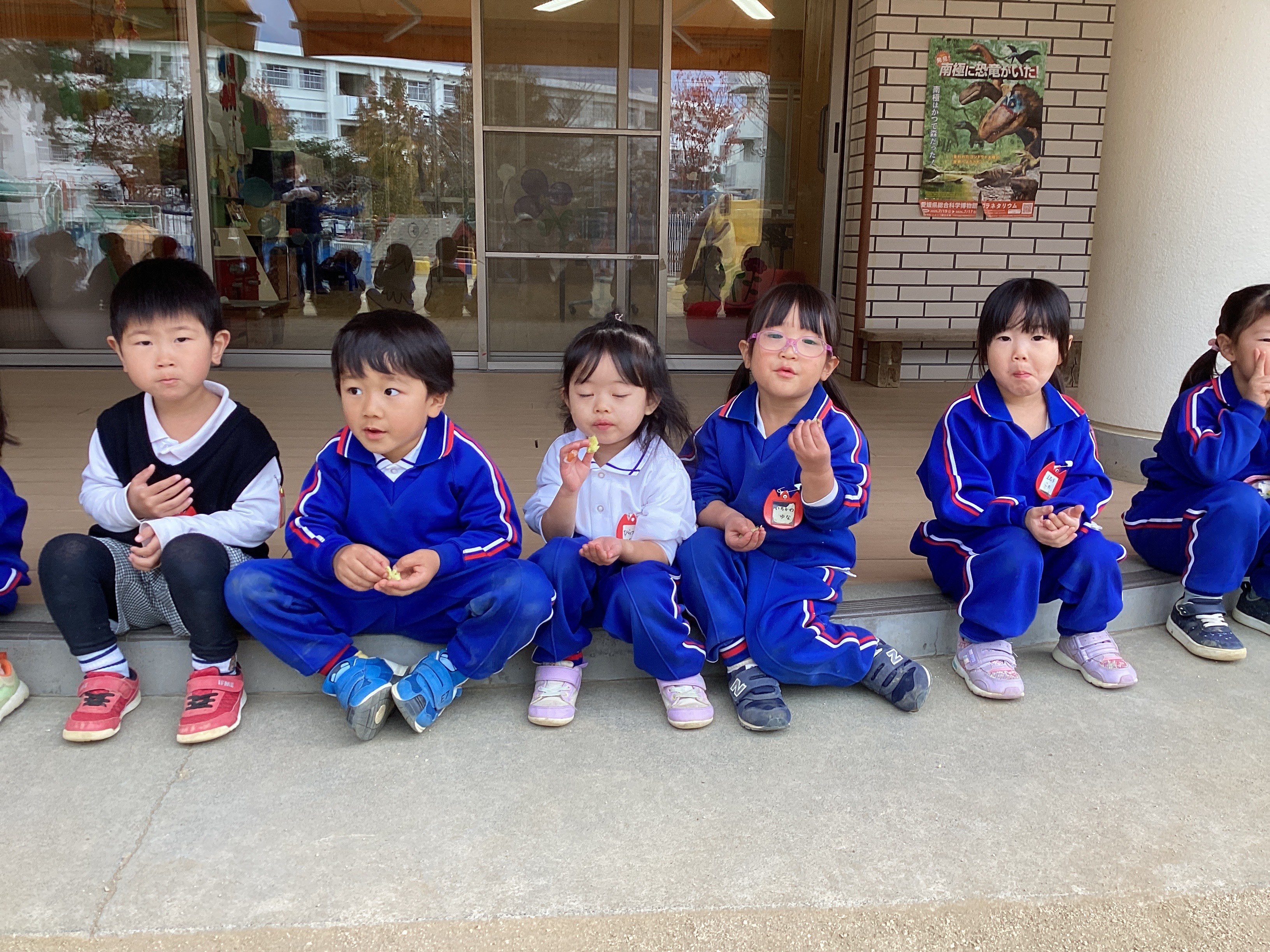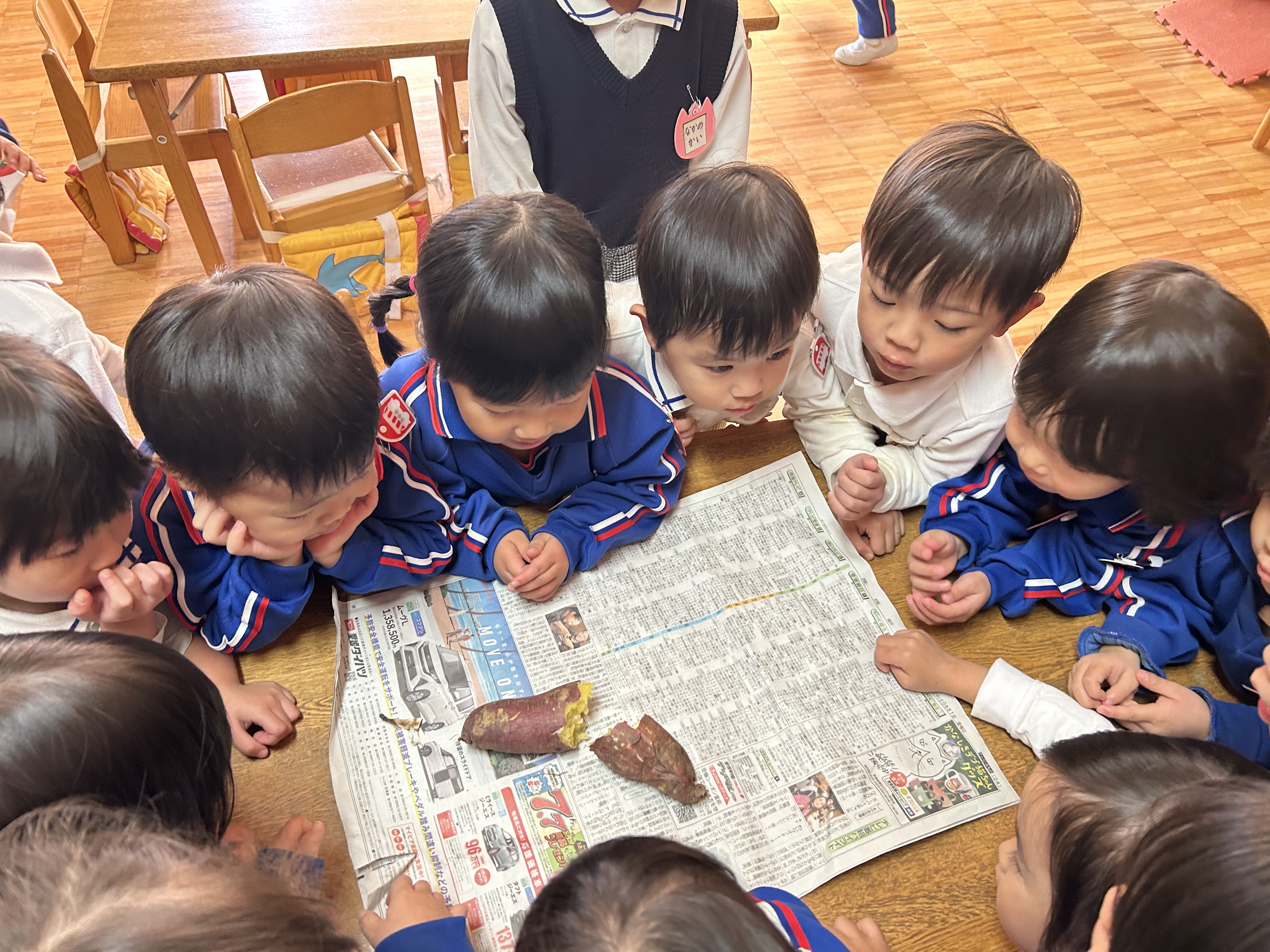 お芋が焼きあがると「○○組さんお芋が焼けました。取りに来て下さい」と放送が流れ嬉しそうに取りに行く子どもたち。焼きたてホヤホヤの焼き芋は大人気でどのクラスも「美味しいね~」と口々に言いながら嬉しそうに食べる姿がみられました。