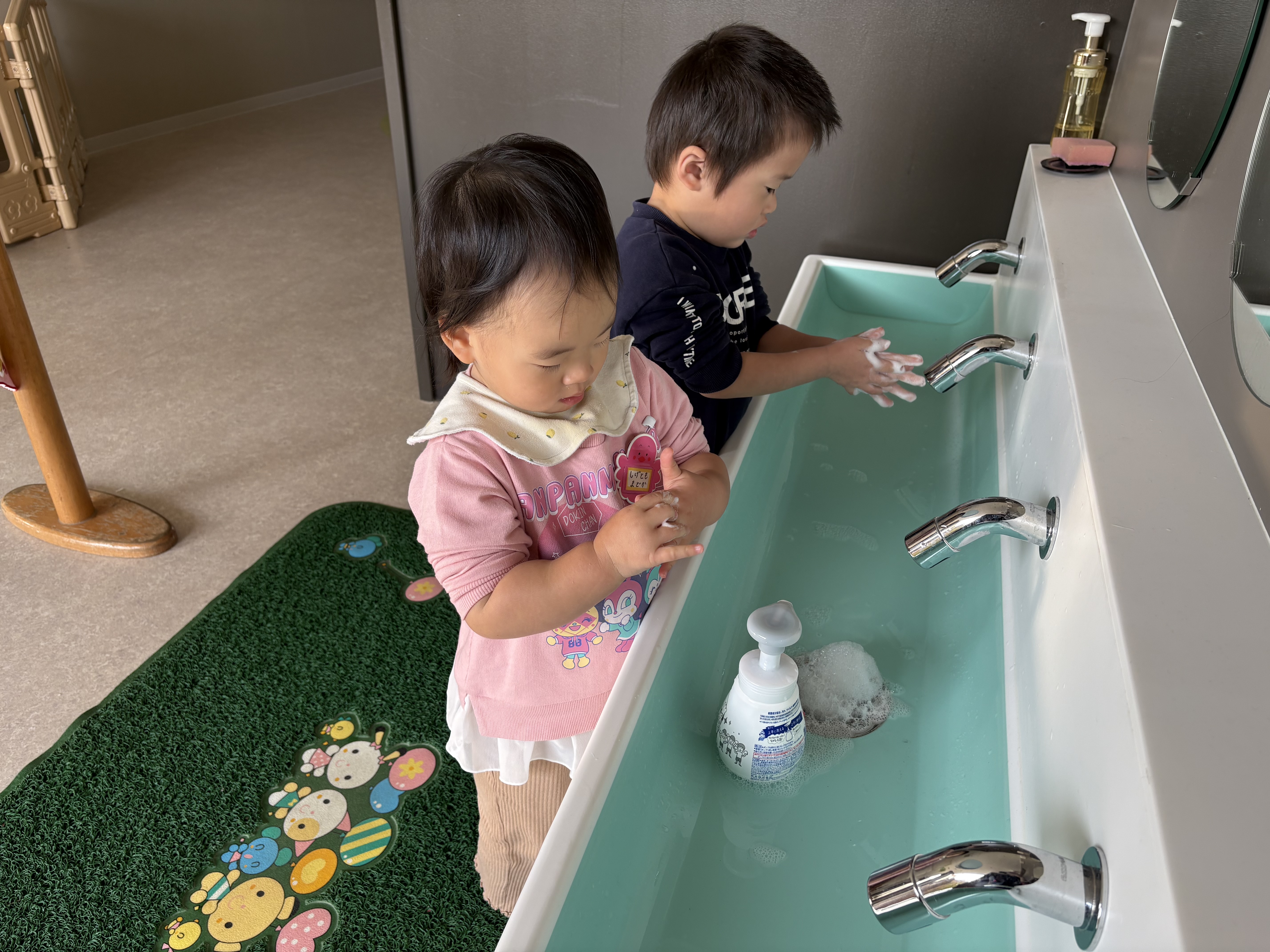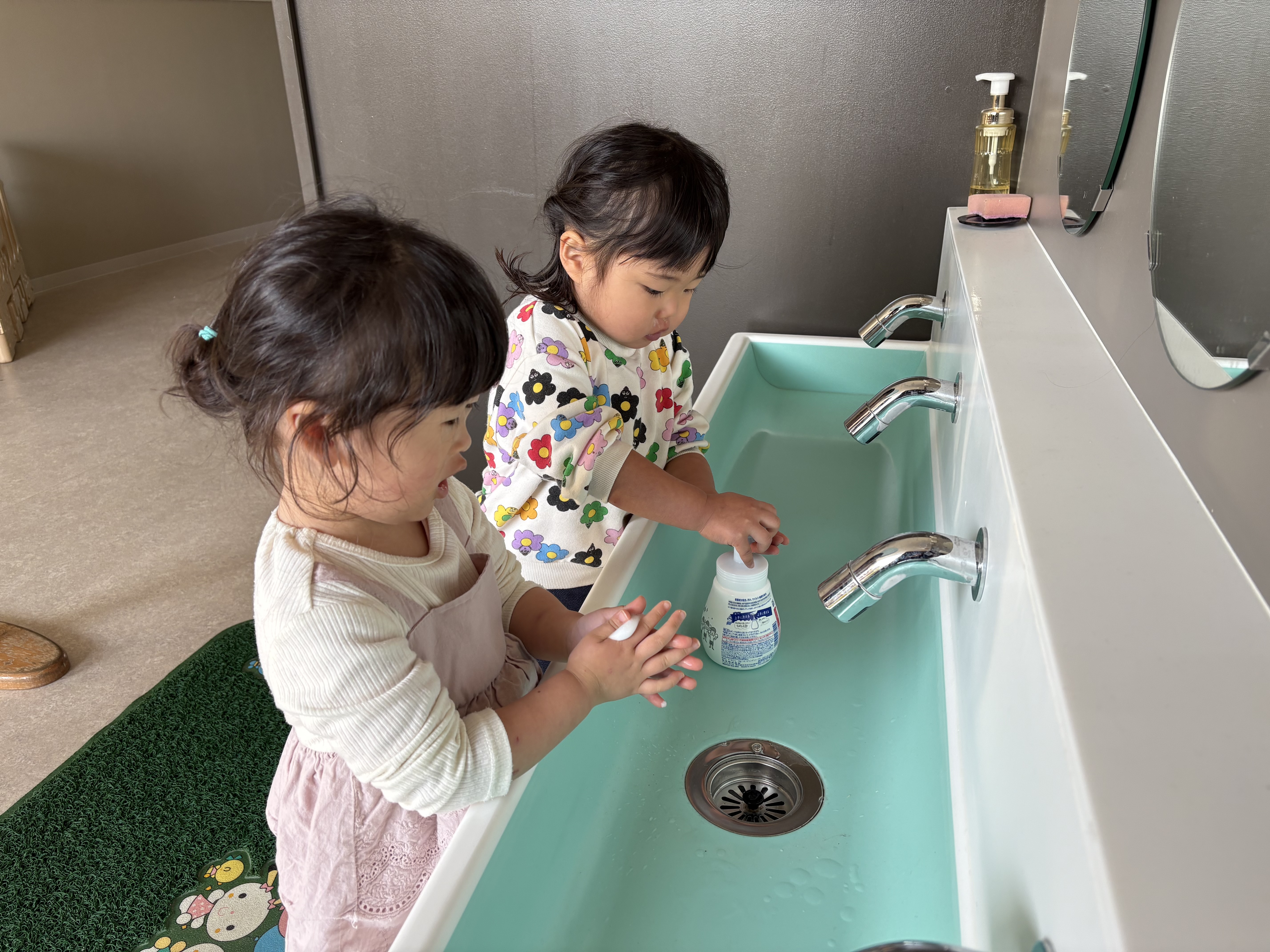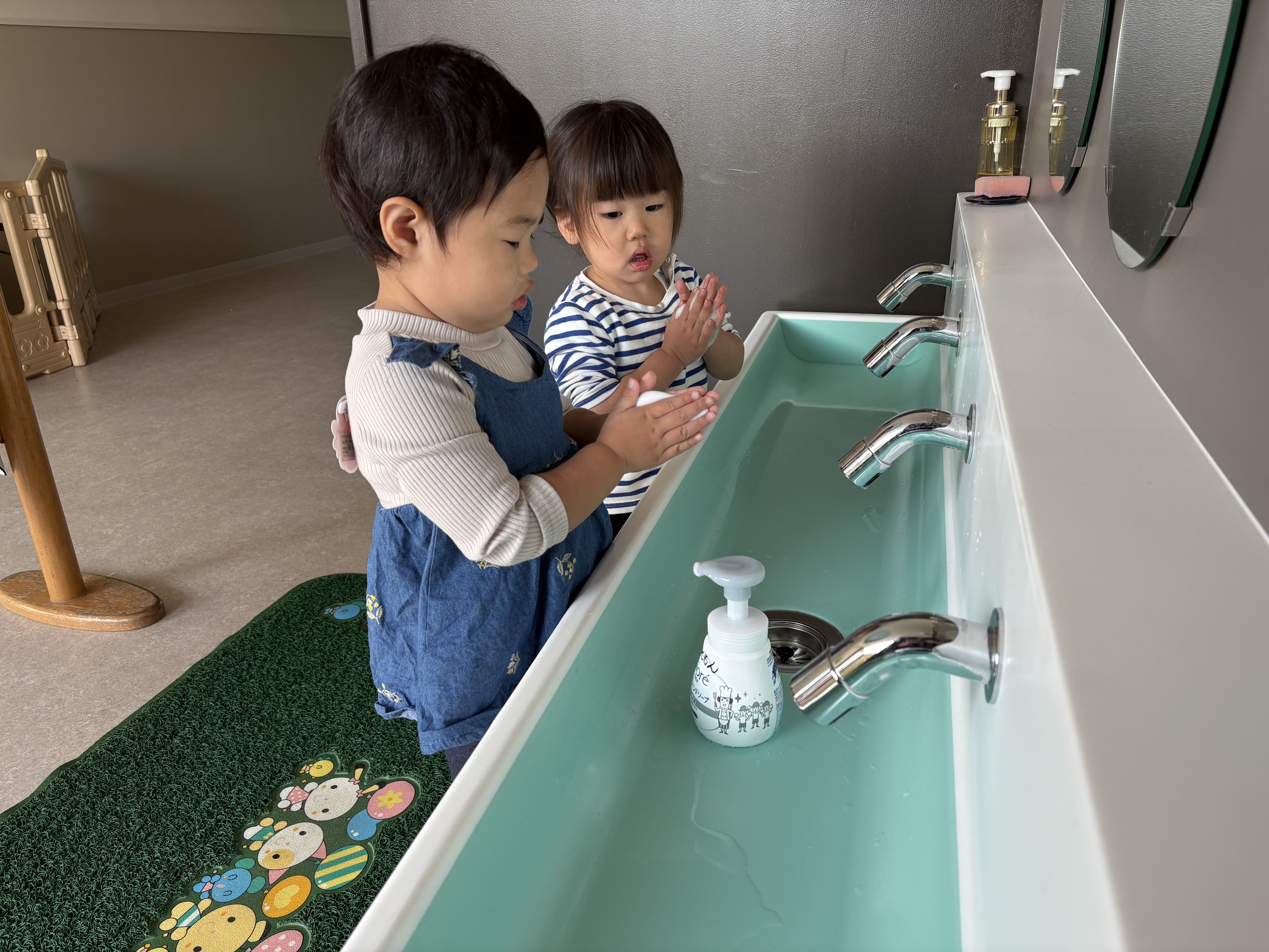 手洗いも前までは保育教諭と一緒にしていましたが、少しずつ手を洗う方法も身に付け、習慣づいてきたように思います。自分たちで手を洗うように声をかけると石鹸のボトルを押して泡を手につけると手の平をすり合わせながらゴシゴシと洗っています。このように1つ1つ自分たちでできることが増えてきていますが、始めは上手くいかず、すぐに諦めていました。日々の積み重ねでできなかった事もできるようになり達成感を味わいながら自分でしたいという気持ちが強くなっていくんだなと思いました。2歳児になると自己主張が強くなっていき何でも興味を持ってやってみようとします。これからも「自分でする」「やってみる」などの気持ちを読み取りながらいろんなことに挑戦させていきたいと思いました。
